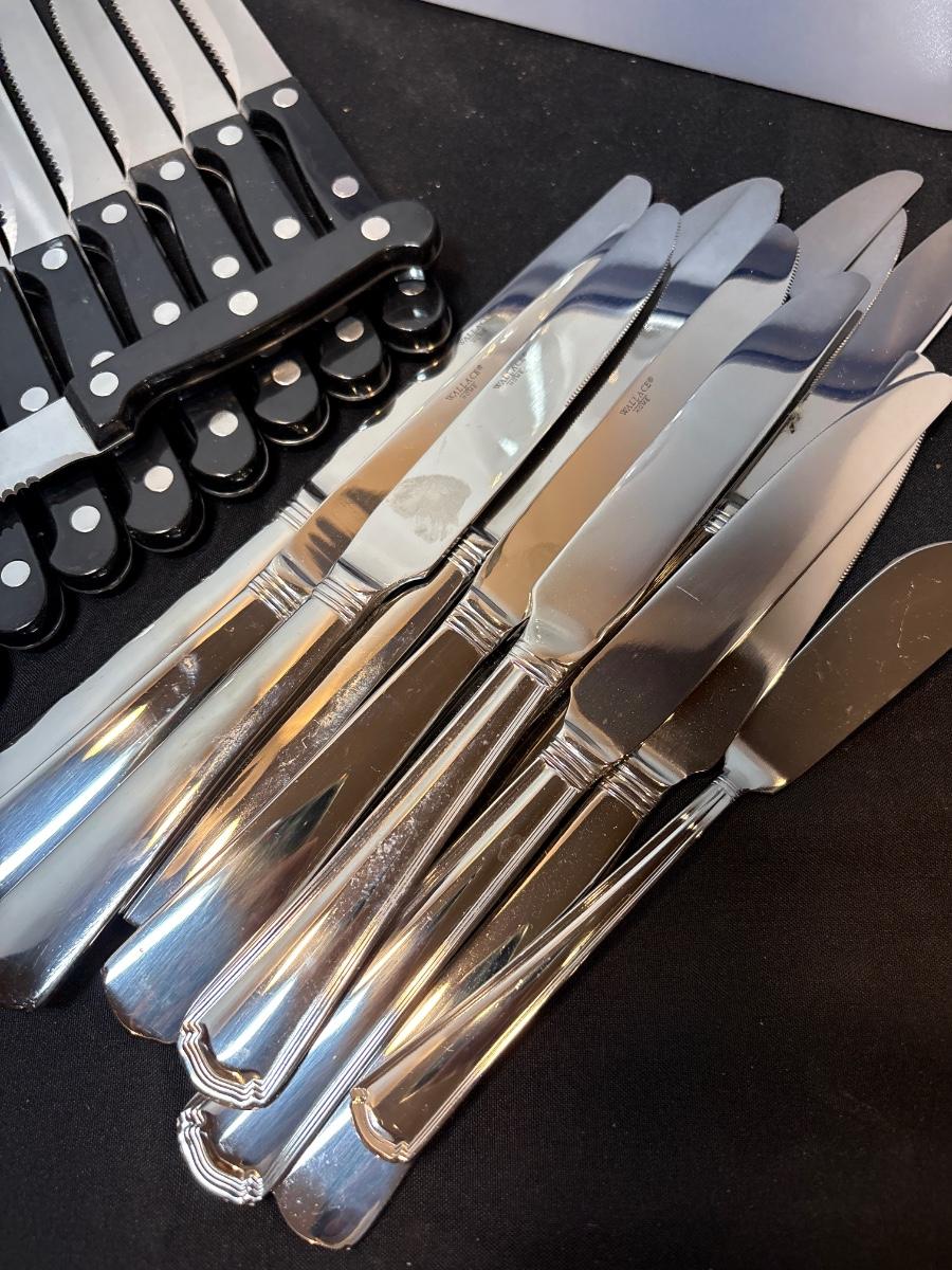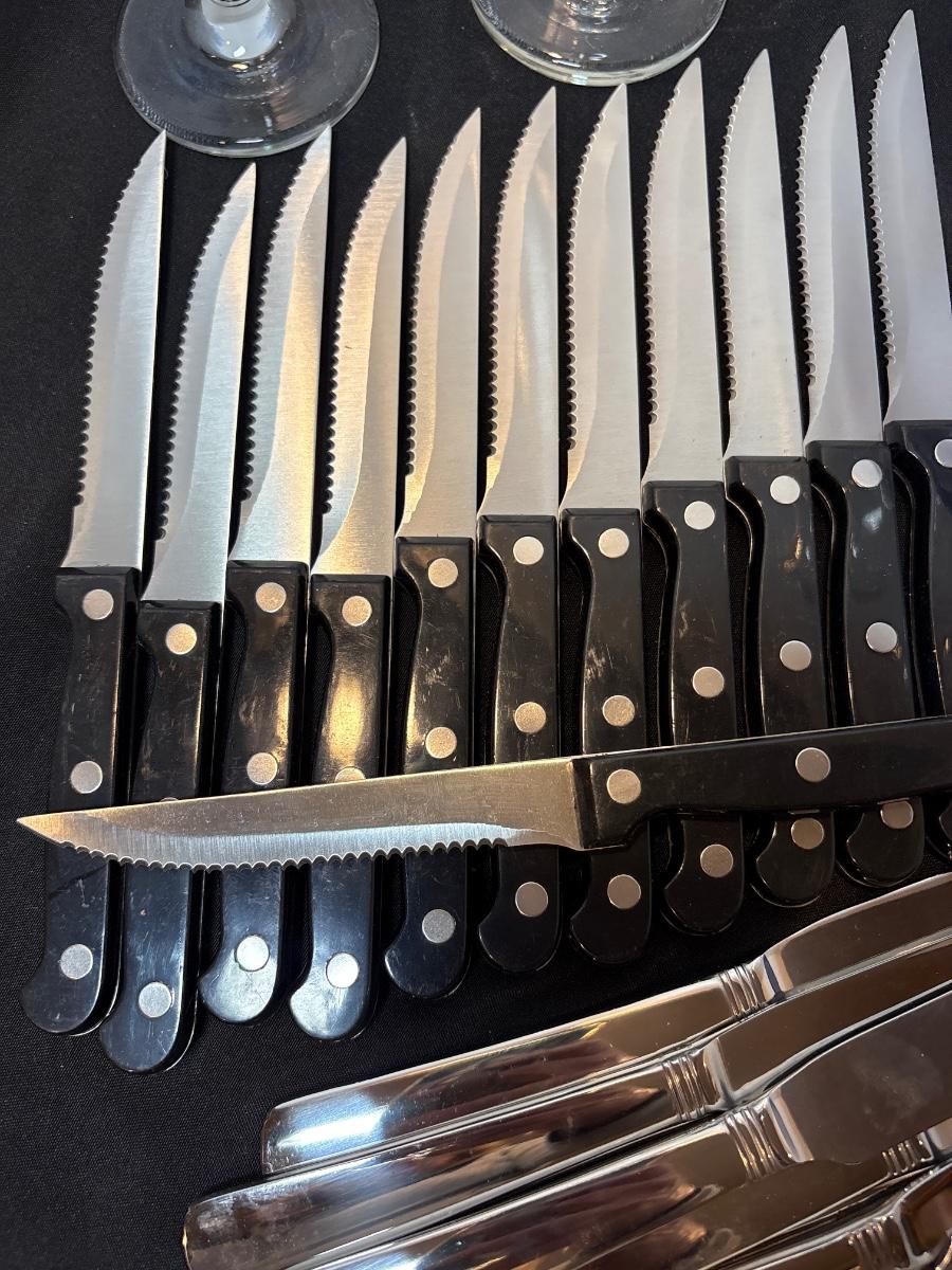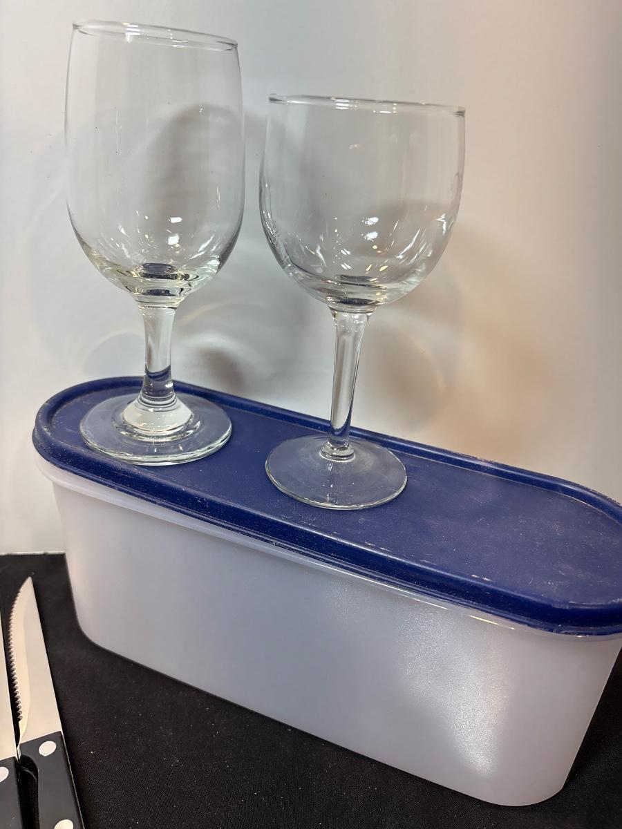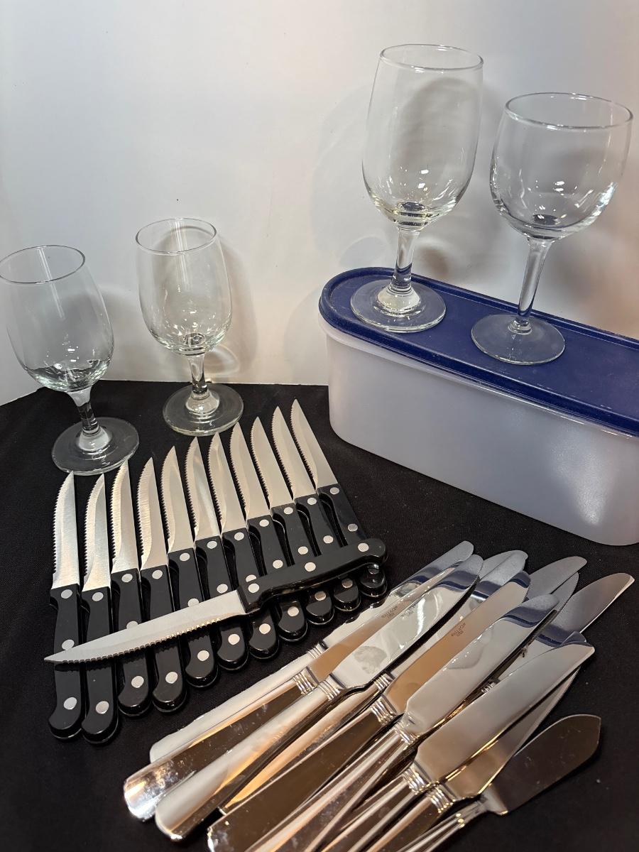 Steak knives, wineglasses, Tupperware & knives