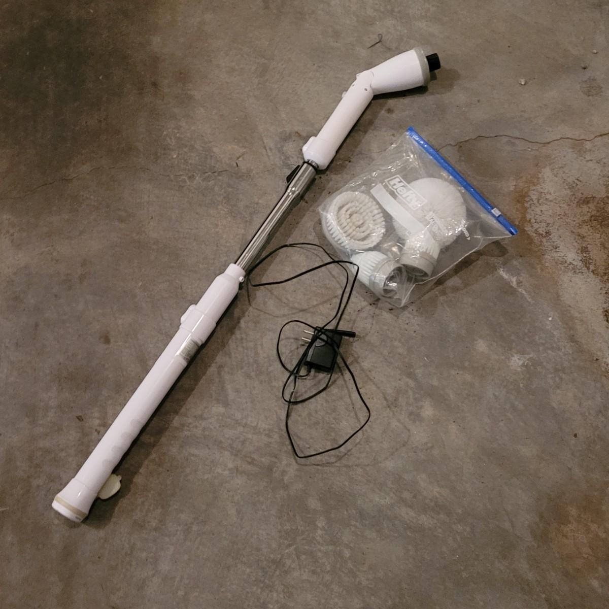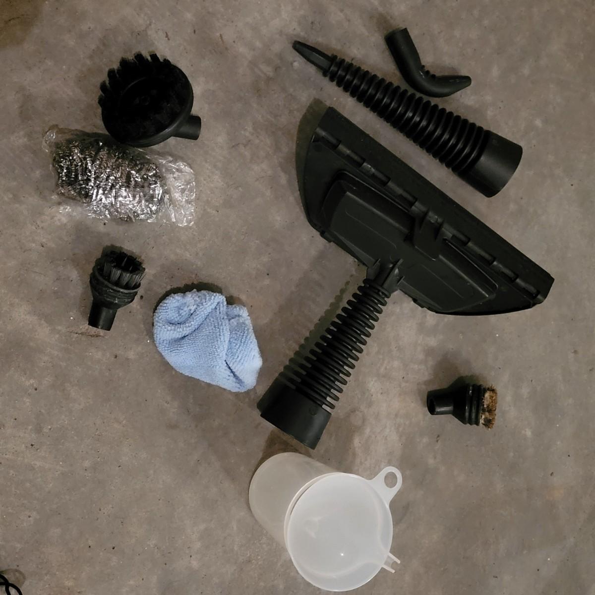 The Swiffer has some fluid and powers on when button is pressed. The steamer powers on when plugged in and includes various attachments and bristles. The power scrubber charged so we could test it and powers on when tested. The dust wand is a simple design with fabric bristles for prolonged use.