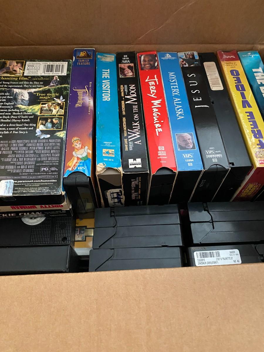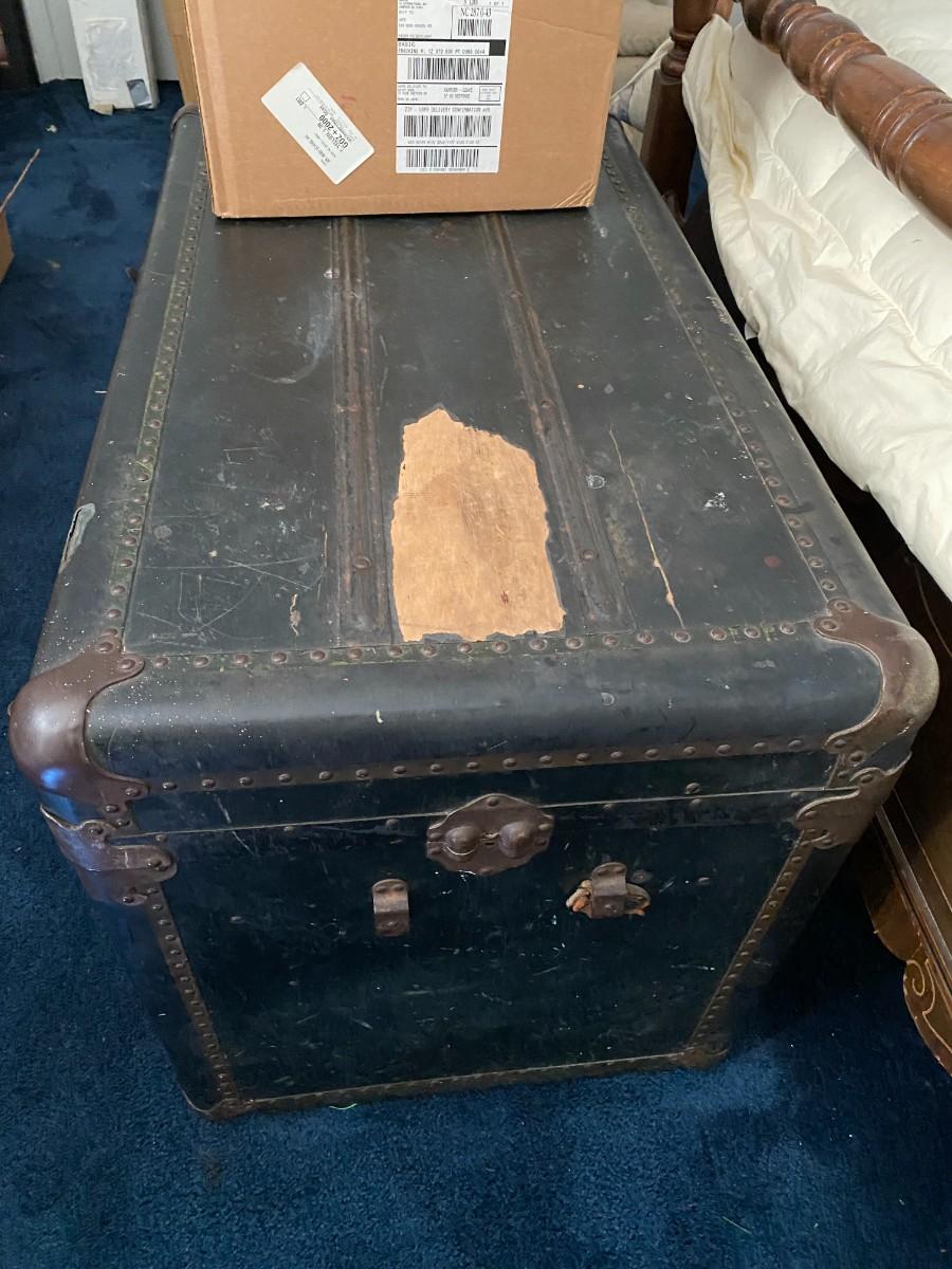 Box of VHS Tapes and Black Steamer Trunk, Needs Restoring, As Pictured