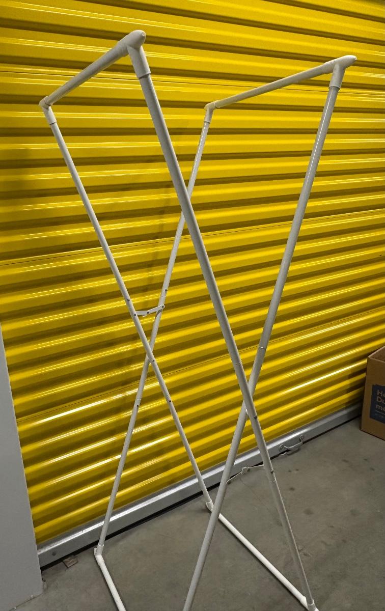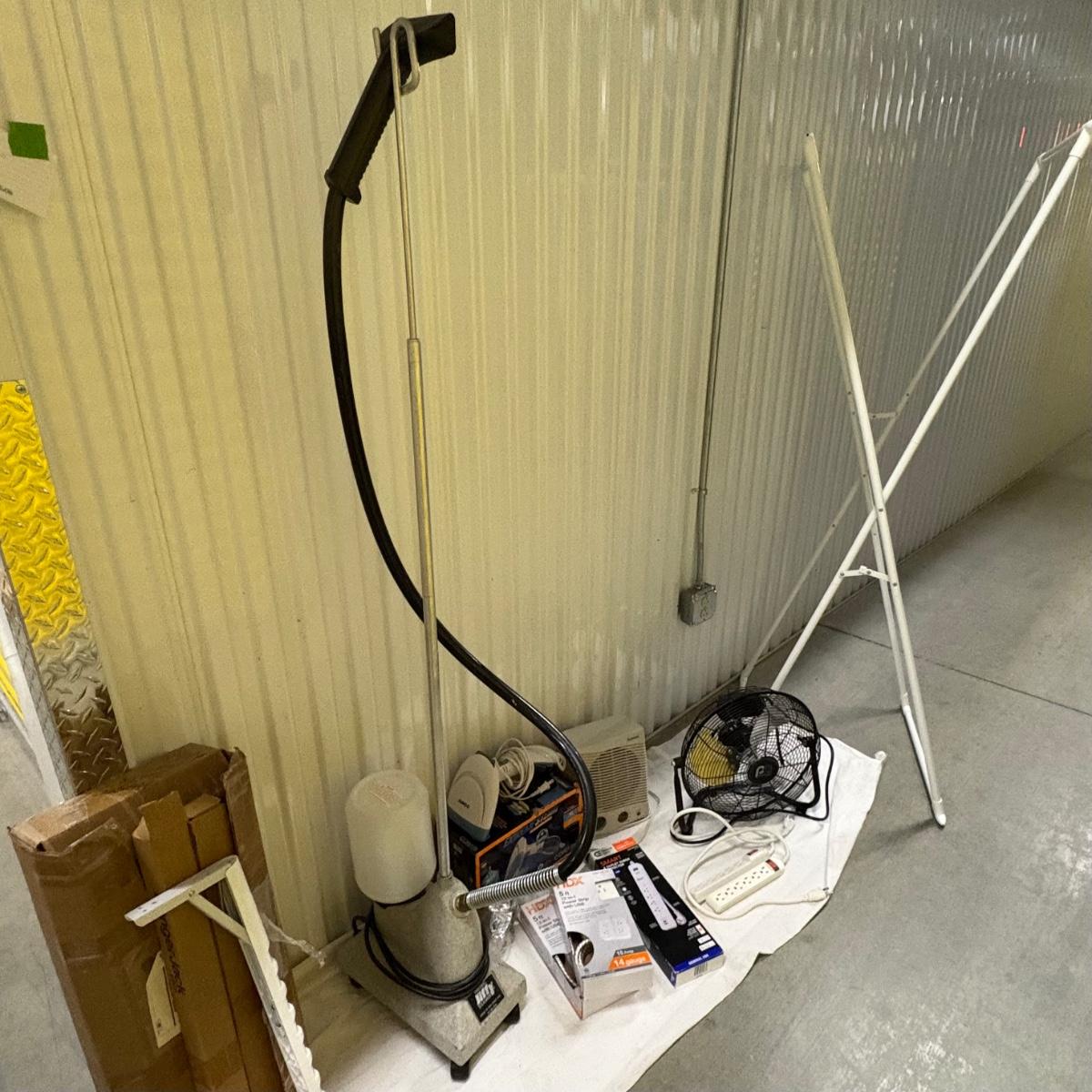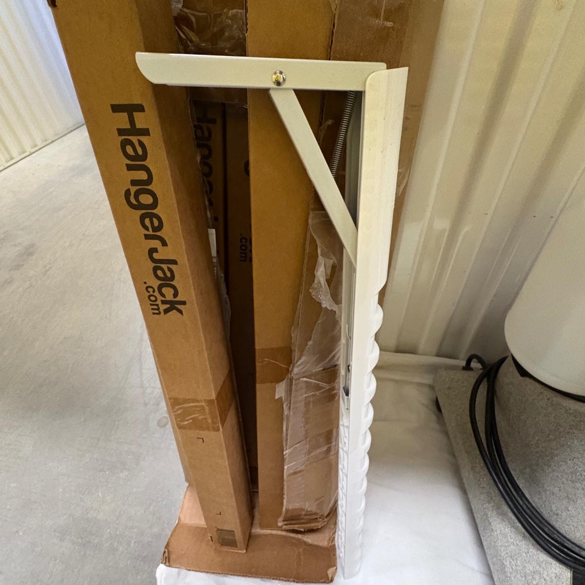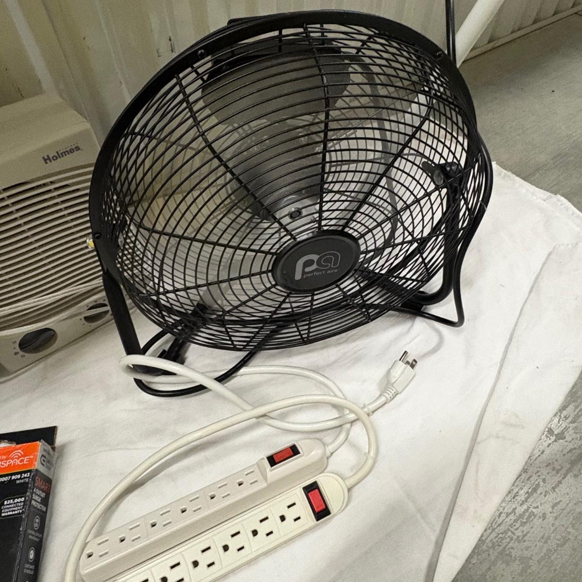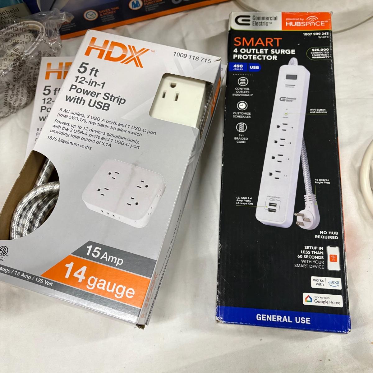 Jiffy-garmet steamer powered on when plugged in, see pictures. Conair extreme steam handheld steamer has box and attachments. Various like new or new in box power strips. Holmes portable heater 8” x 4.25” x 10”H. Perfect Aire fan is like new and 17.5” across. Laundry hanger is 19” wide at open span and 62”H. Hanger Jack closet accessories are metal and new in box. Eleven pieces at 24” x 1.5” x 6”H. All electronics powered on.