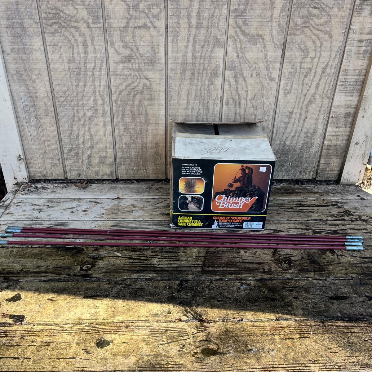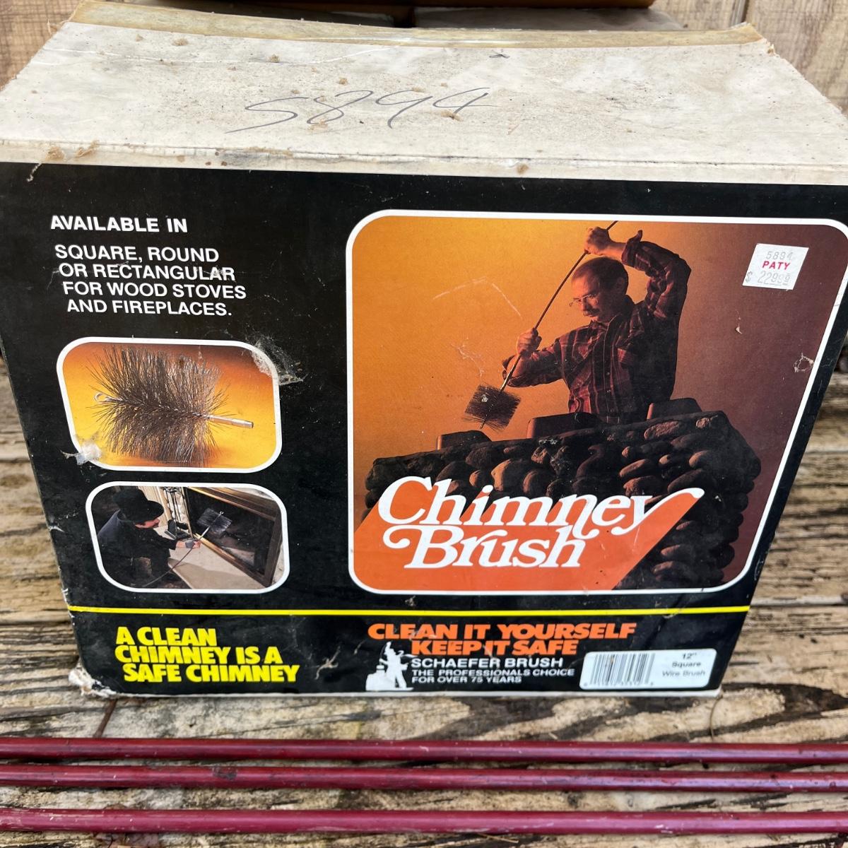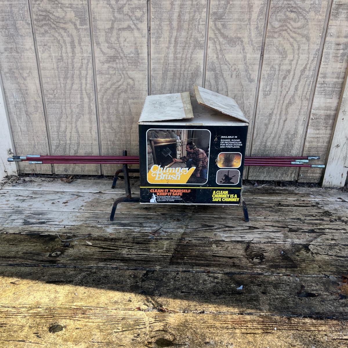 Lot includes a 12” square chimney brush with four 46.5” long fiberglass rods that screw together and a steel fireplace rack that measures 21” x 11” x 6”H