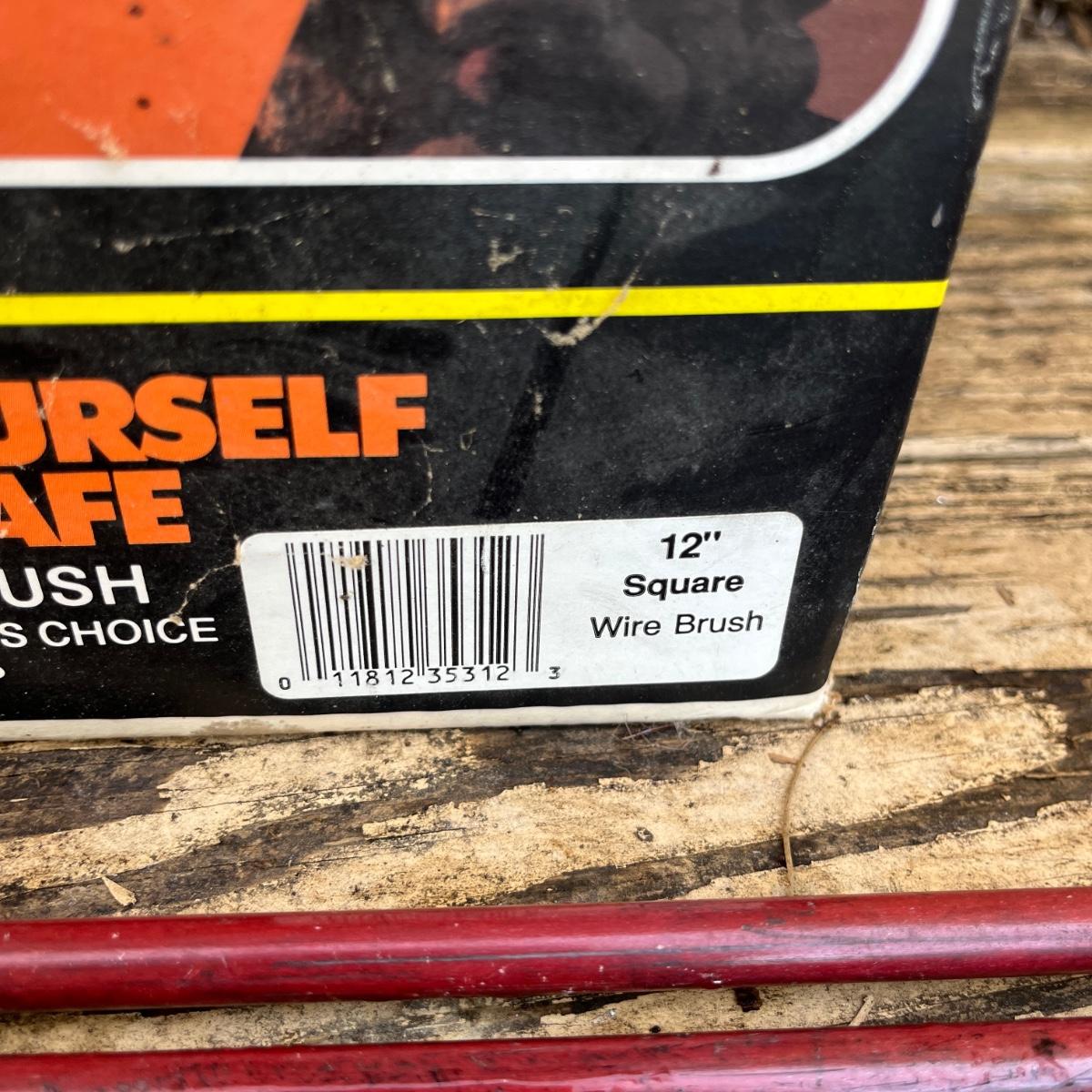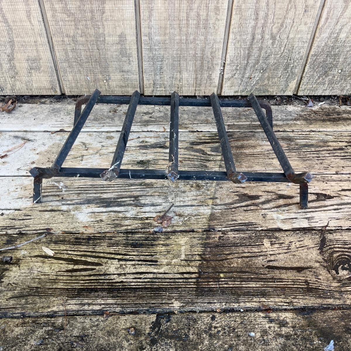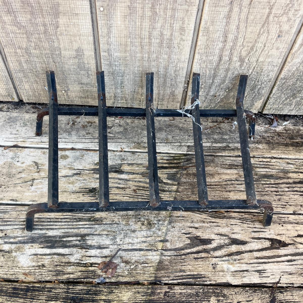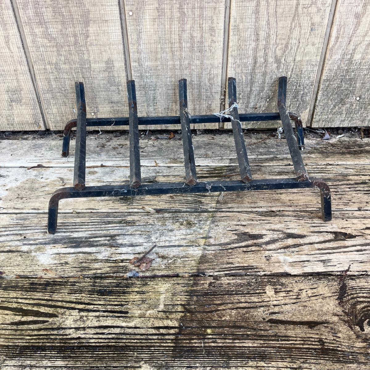 Lot includes a 12” square chimney brush with four 46.5” long fiberglass rods that screw together and a steel fireplace rack that measures 21” x 11” x 6”H