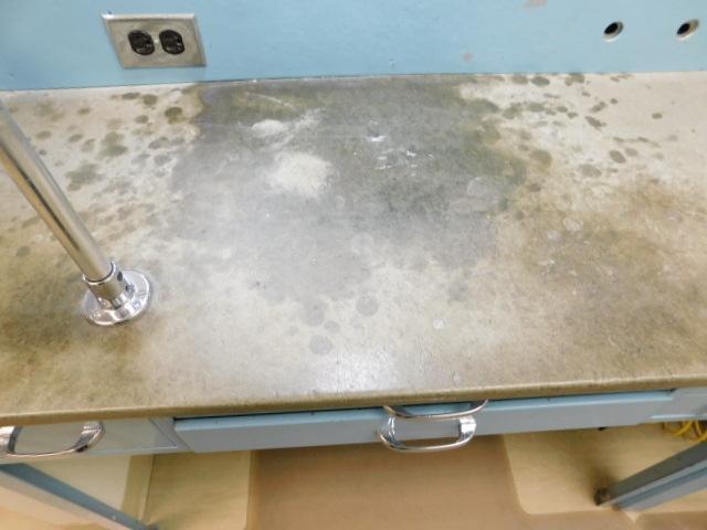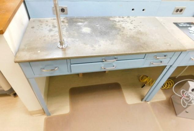 Steel Work Bench with Multiple Drawer System, Burn Proof Table Top, Electrical Outlet, & Gas/Air Ports Blue...Armature not included. Table top has some staining