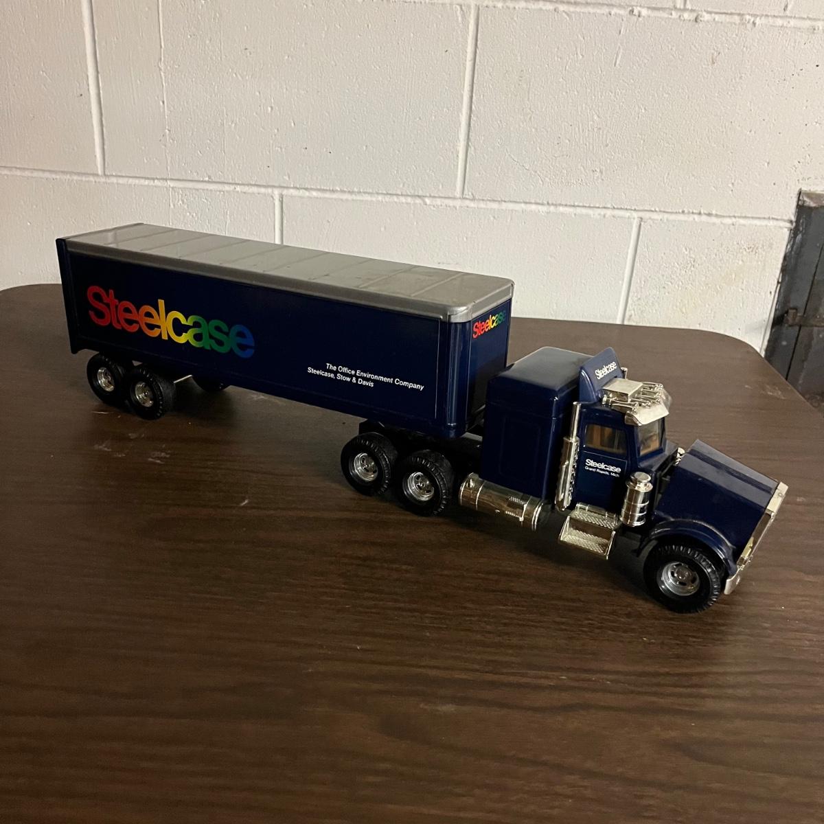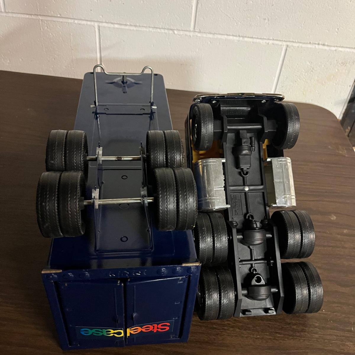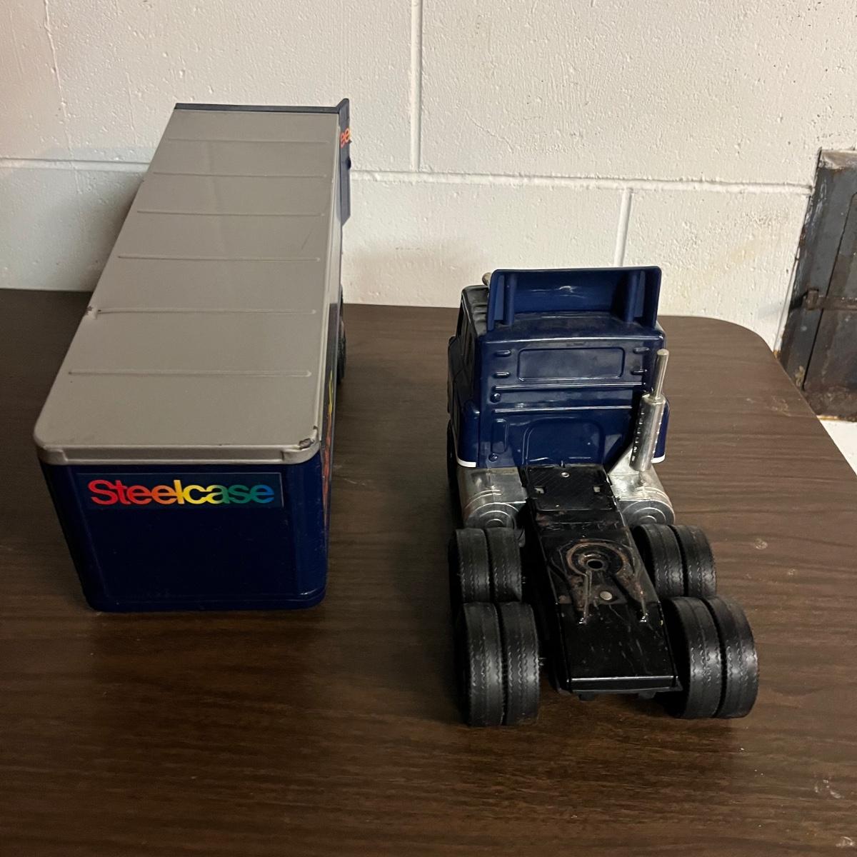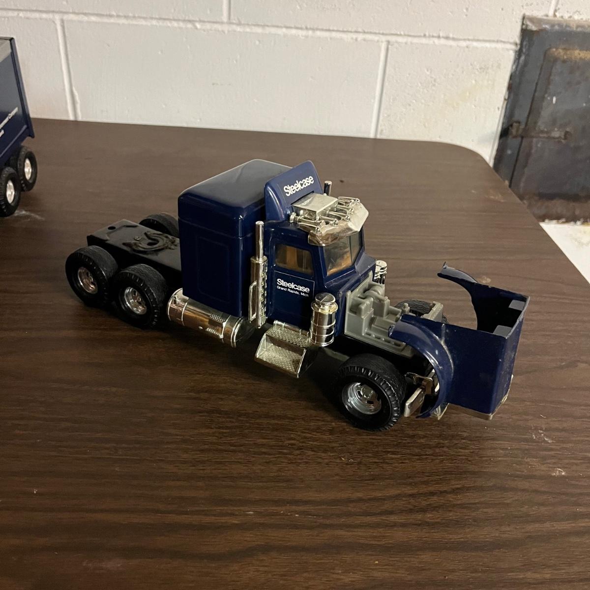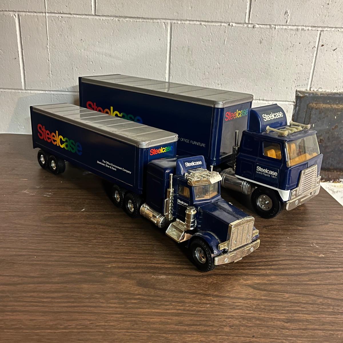 Lot includes two Steelcase trucks with trailers. The trucks are plastic and the trailers are metal. Largest truck and trailer measures 5” x 22” x 7.5”.