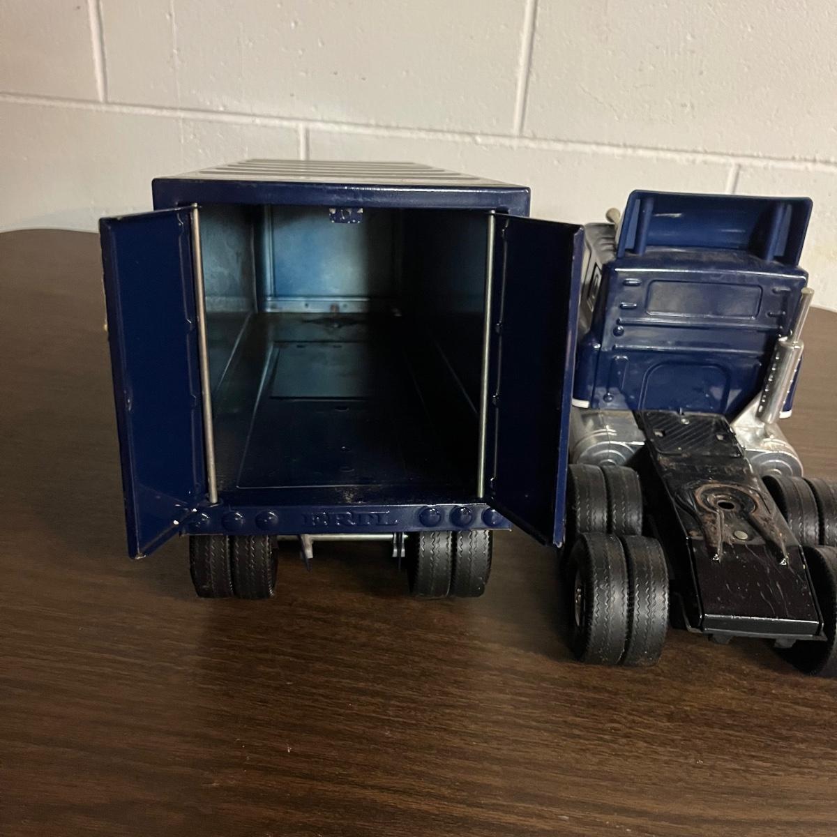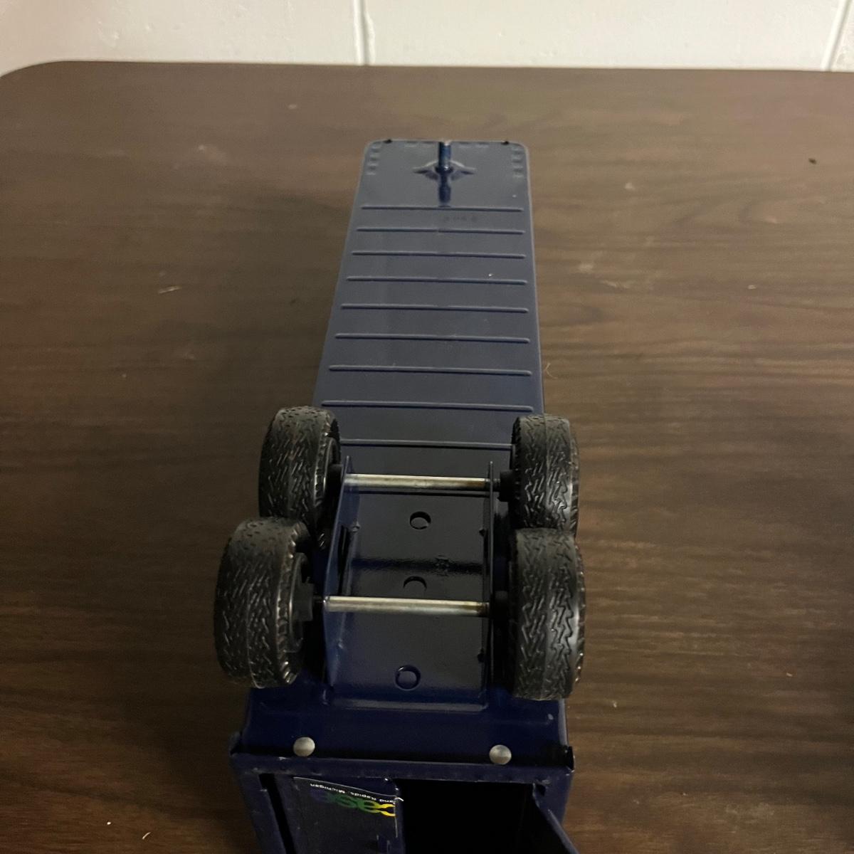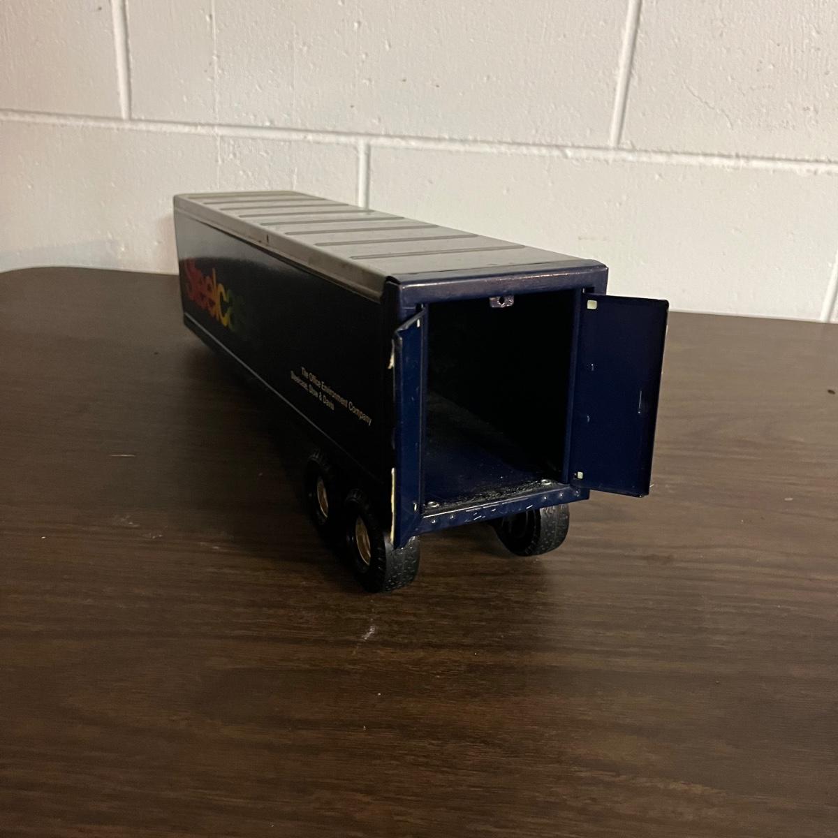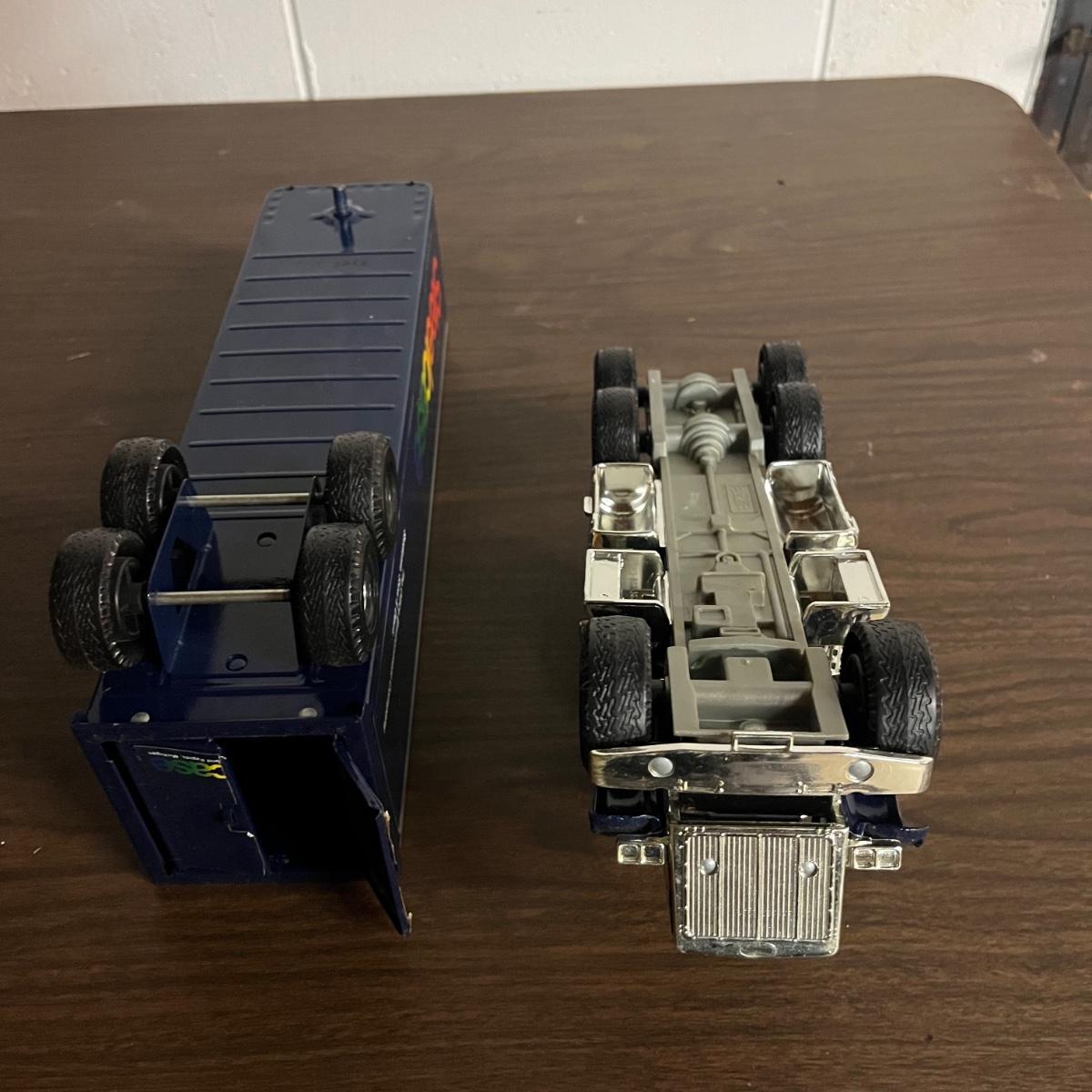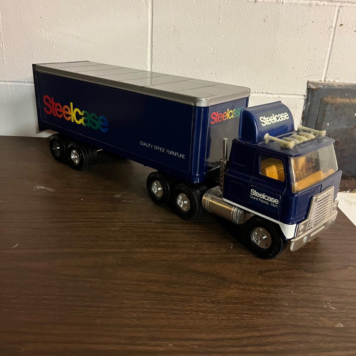 Lot includes two Steelcase trucks with trailers. The trucks are plastic and the trailers are metal. Largest truck and trailer measures 5” x 22” x 7.5”.