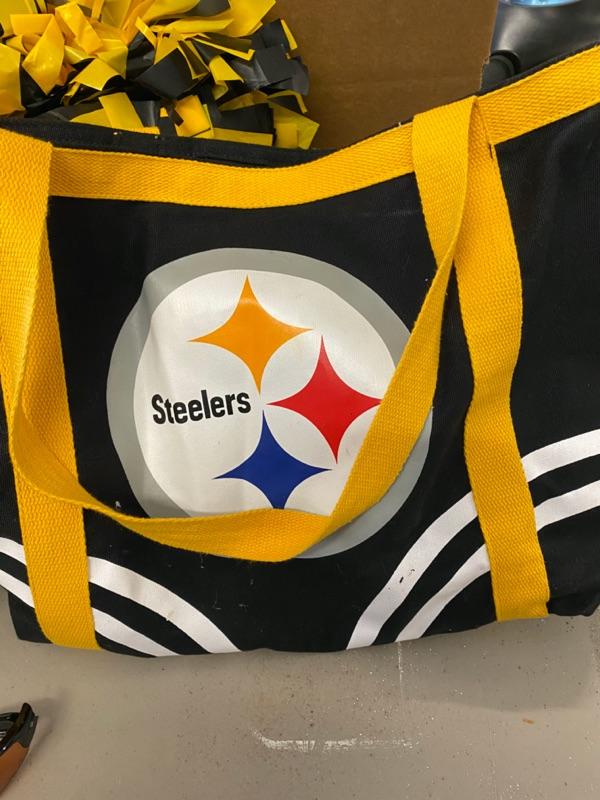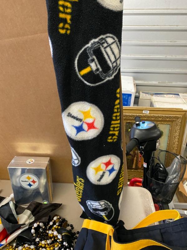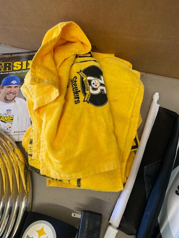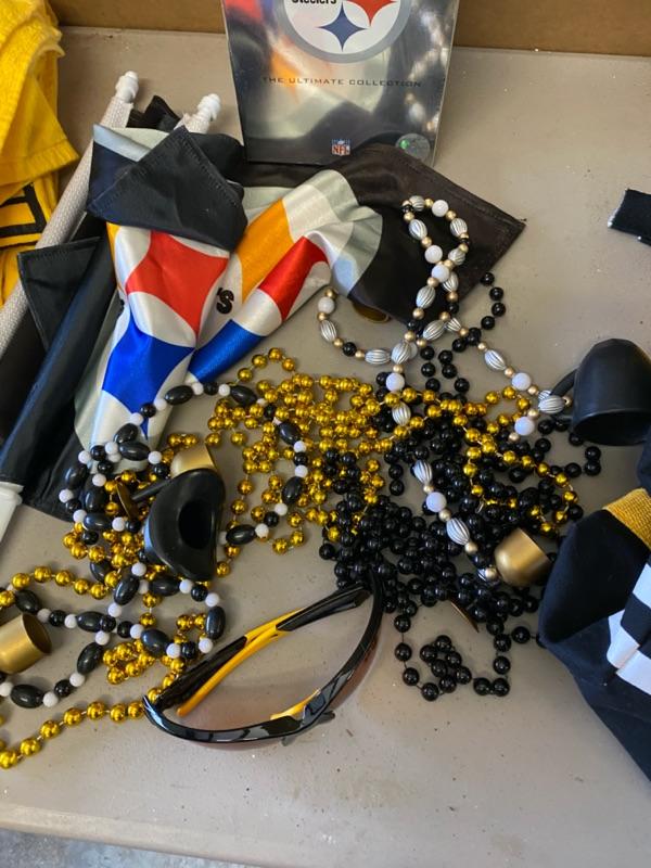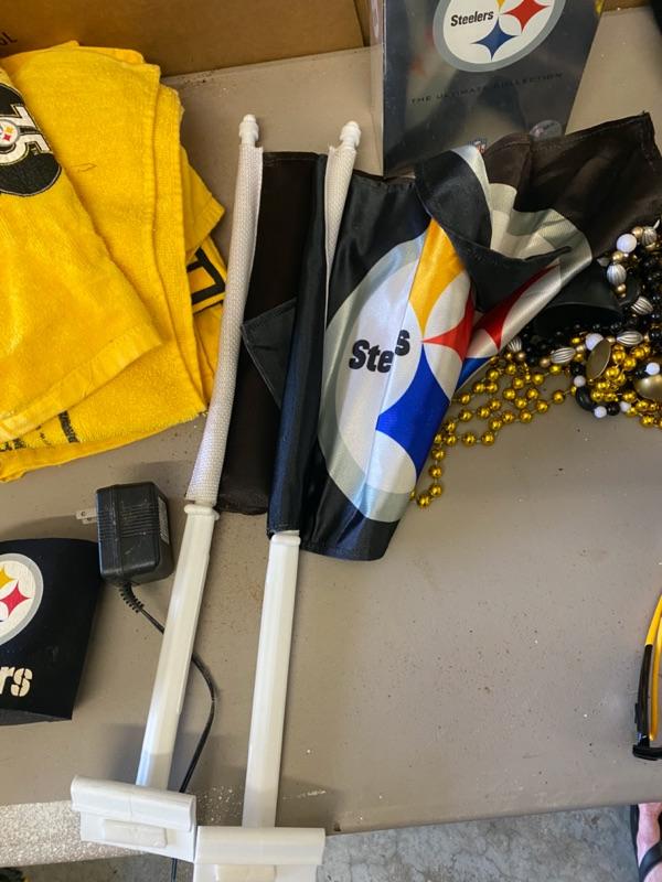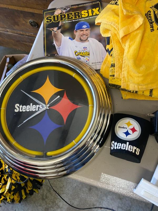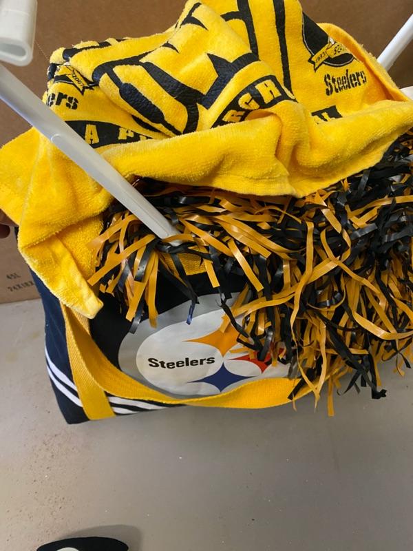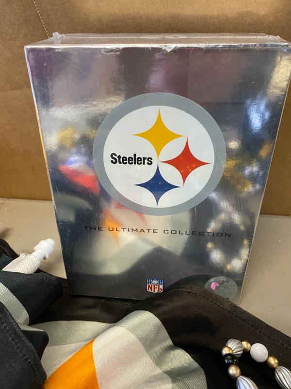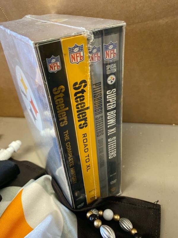 Steelers Lot, Towels, Beads, Clock, Scarf, Bag, Book, Car Flags, DVD Set, PomPoms-Lot 303