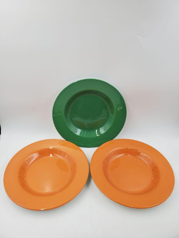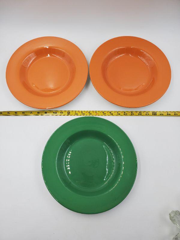 2 vibrant orange and 1 amazing green serving bowls...they are approximately 11.5in in diameter..all good condition