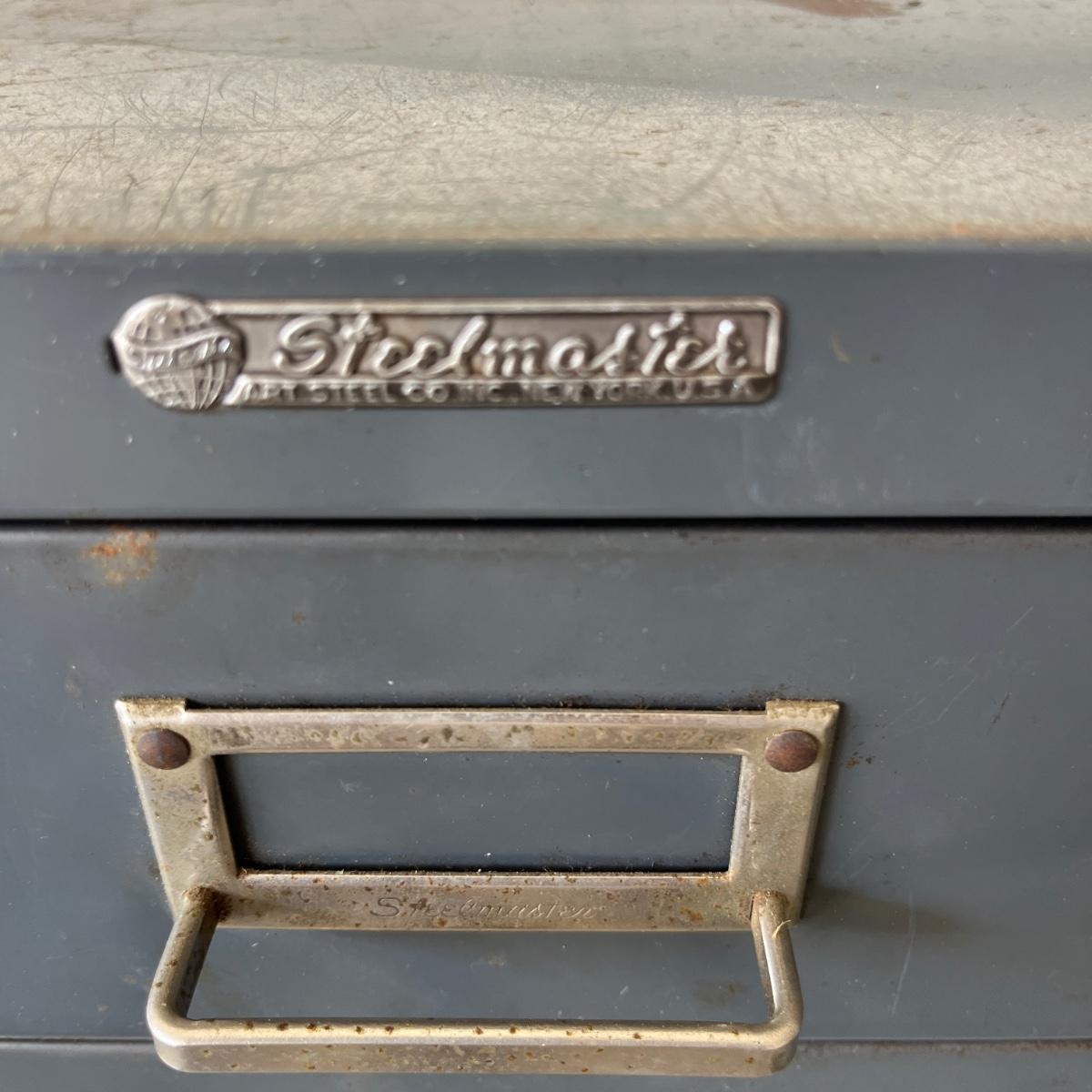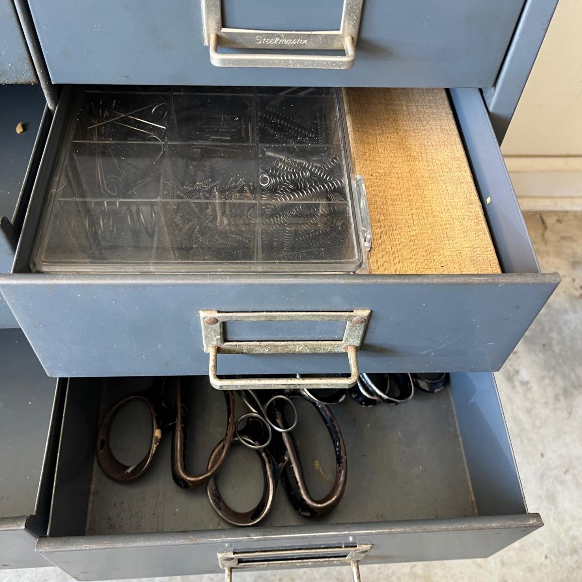 Lot includes a metal Steelmaster 30 drawer storage cabinet with contents that includes springs, scissors, saw blades, screws and more. The cabinet measures 30” x 12” x 37”H.