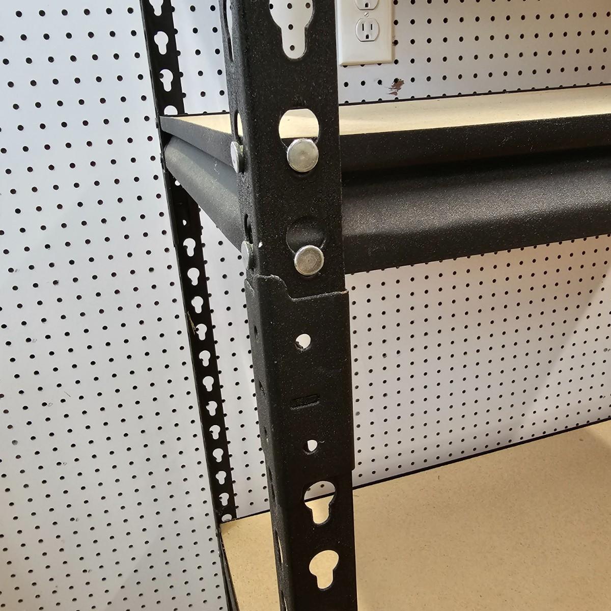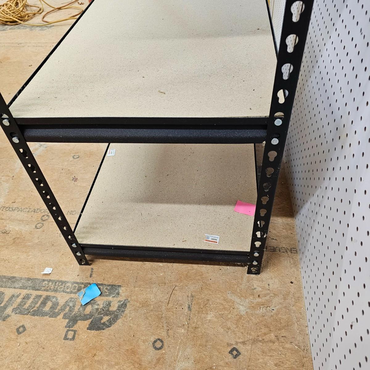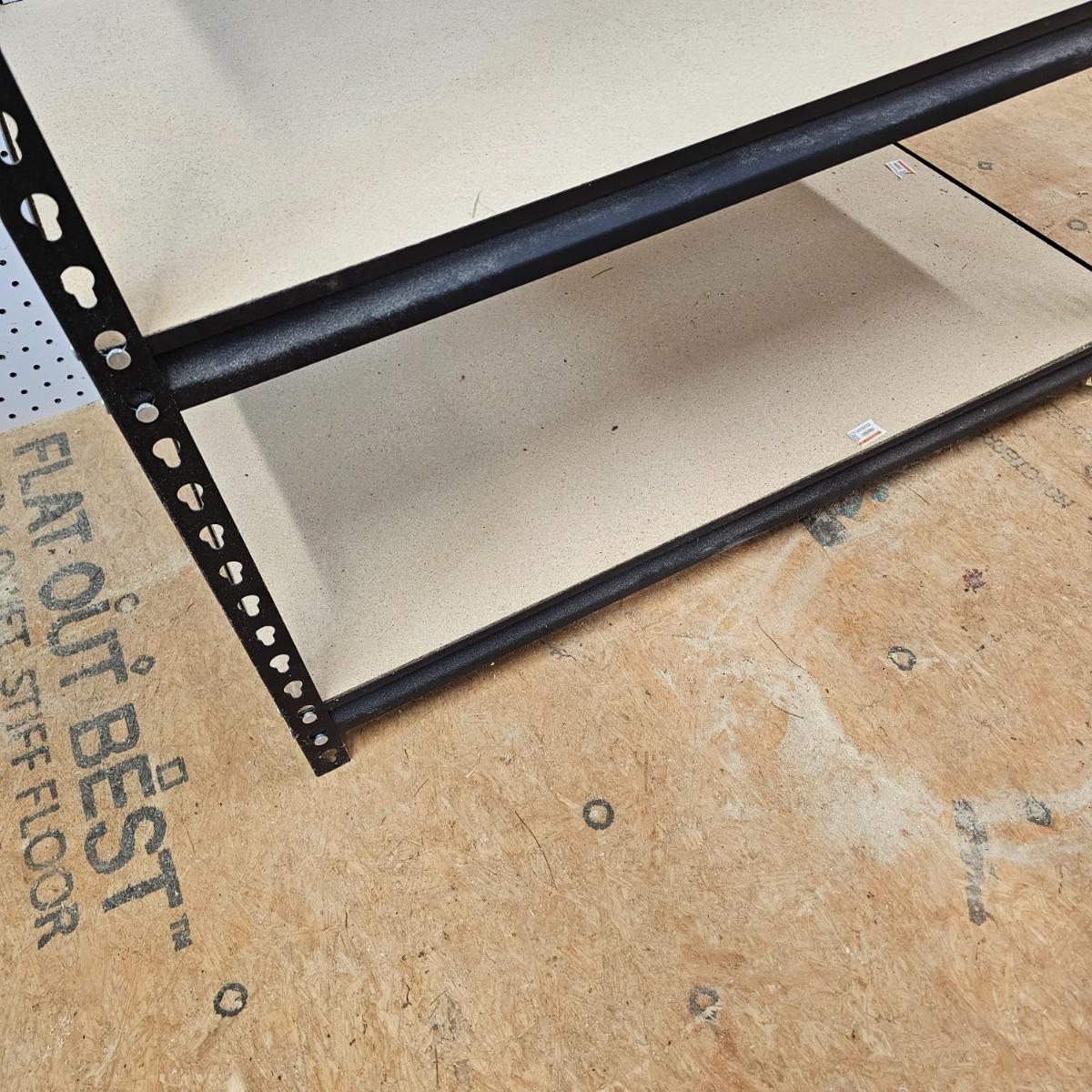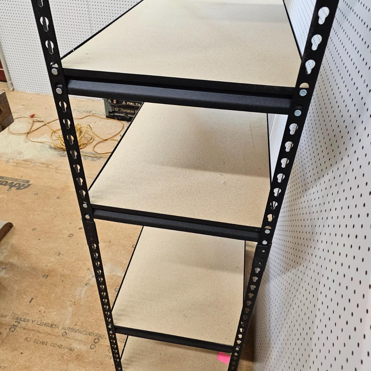 One set of steel frame shelving with wood shelves. Unit measures 36" x 18" x 72"H. Particle board shelves sit flush with frame. Five shelves total. See photos for details. Local pickup only.