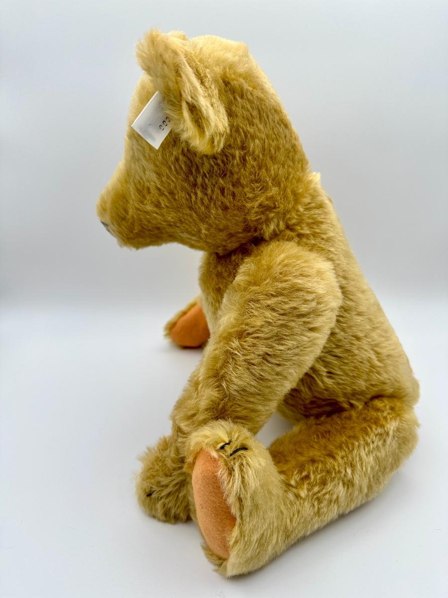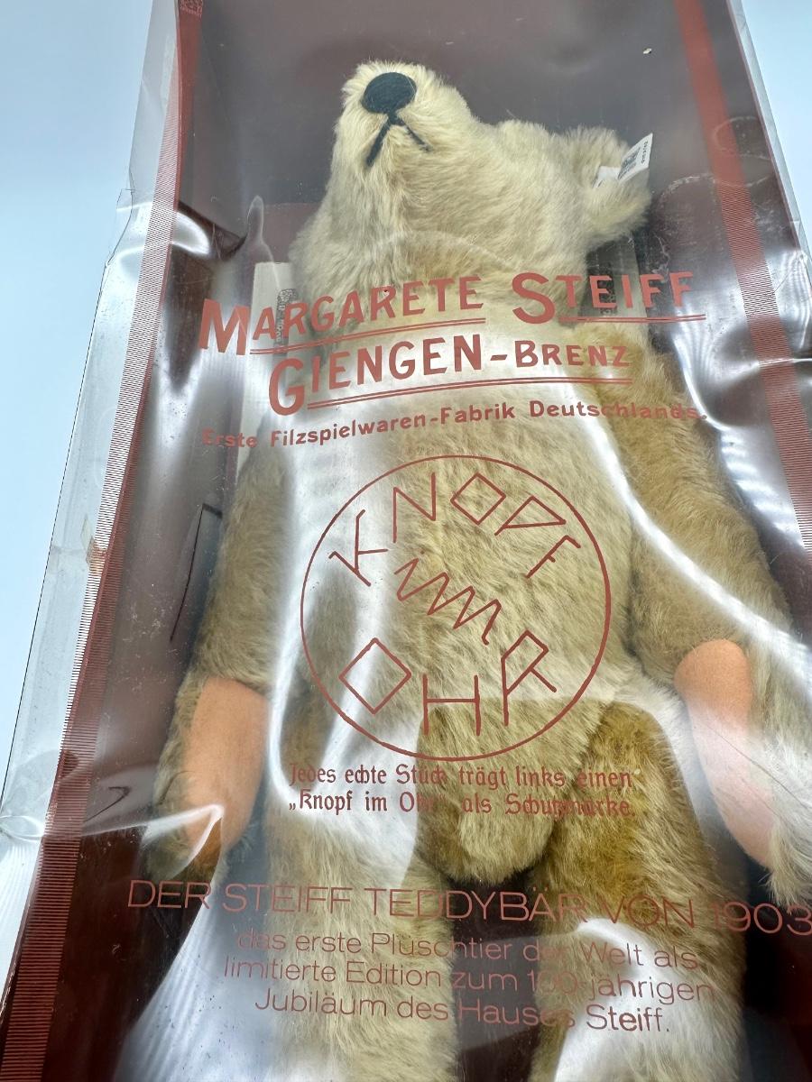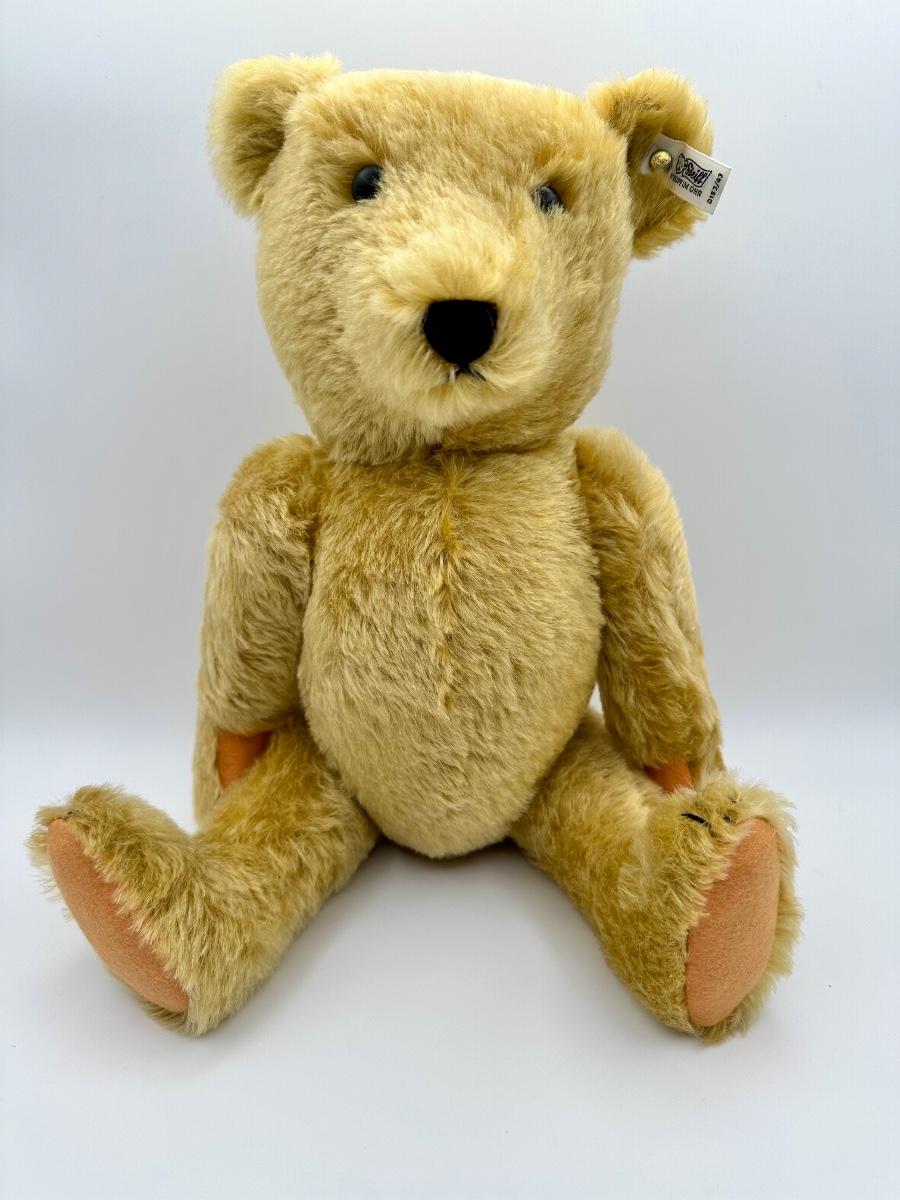 This is a large vintage Steiff teddy bear From 1981. It is blond mohair with felt paws, fully jointed and in unused condition. This teddy bear is an uncommon anniversary white tag, 0153/43 1981 vintage “Papa Bear”. It is a reproduction from the commemorative series of the Steiff Teddy Bears of 1903 to celebrate the 100th anniversary of the House of Steiff. Comes with certificate, white ear tag and original box.