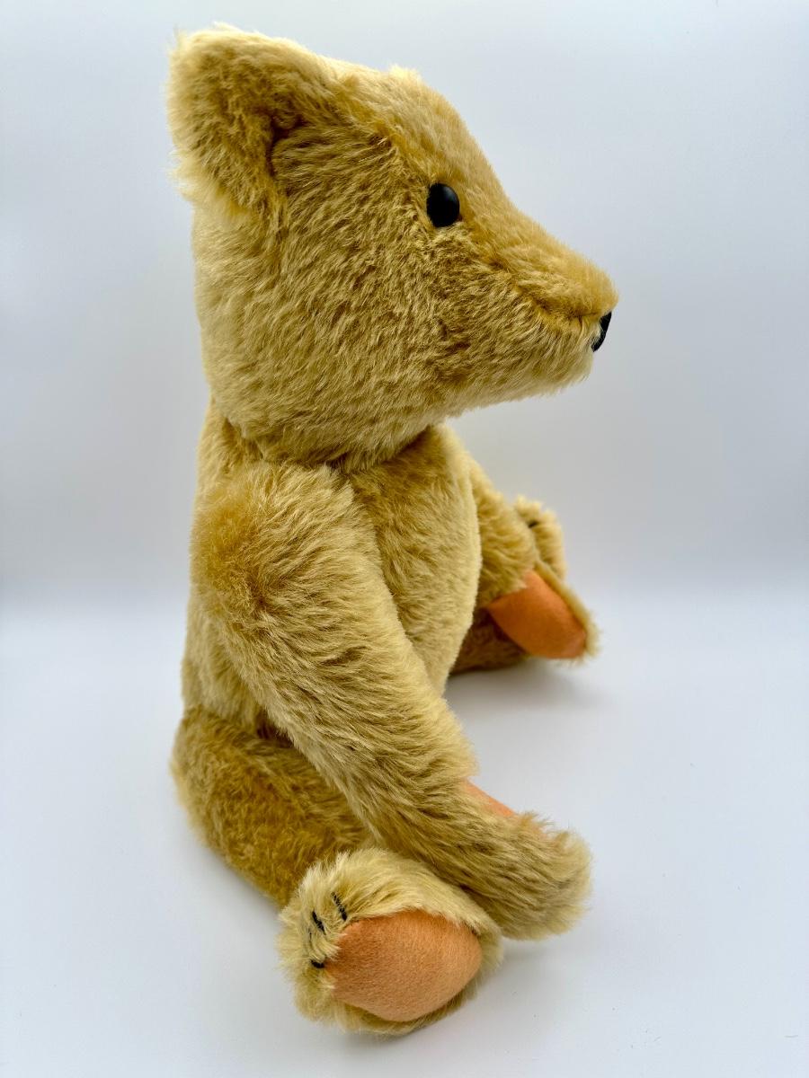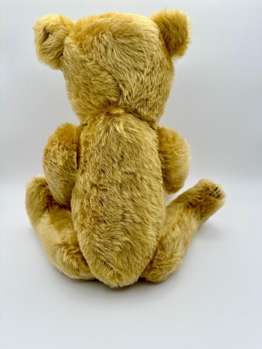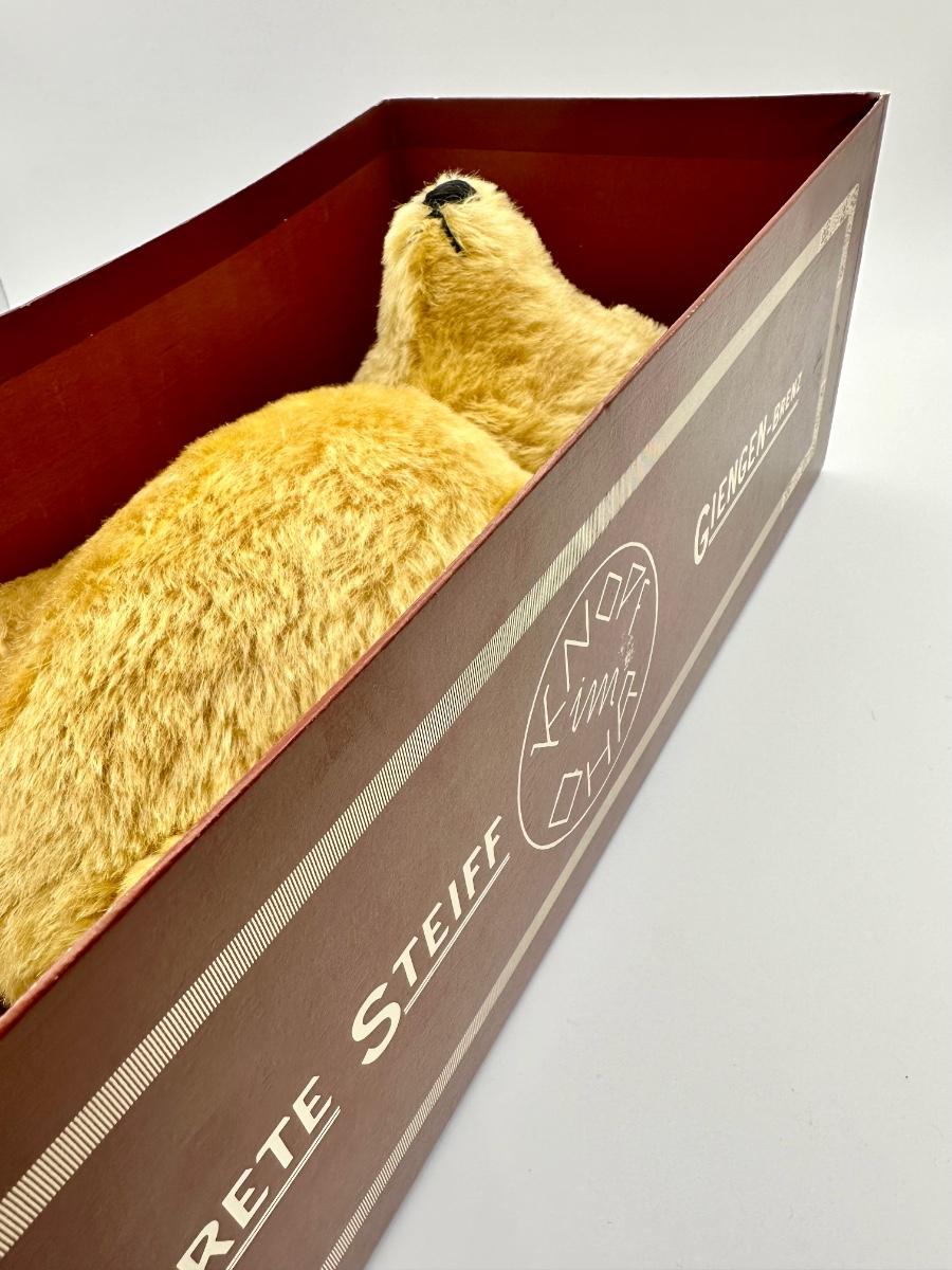 This is a large vintage Steiff teddy bear From 1981. It is blond mohair with felt paws, fully jointed and in unused condition. This teddy bear is an uncommon anniversary white tag, 0153/43 1981 vintage “Papa Bear”. It is a reproduction from the commemorative series of the Steiff Teddy Bears of 1903 to celebrate the 100th anniversary of the House of Steiff. Comes with certificate, white ear tag and original box.