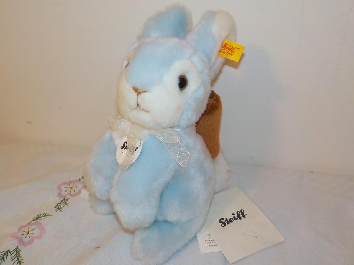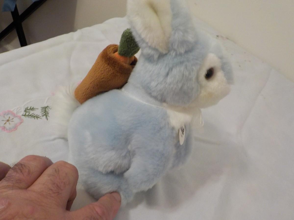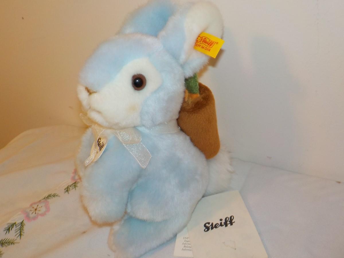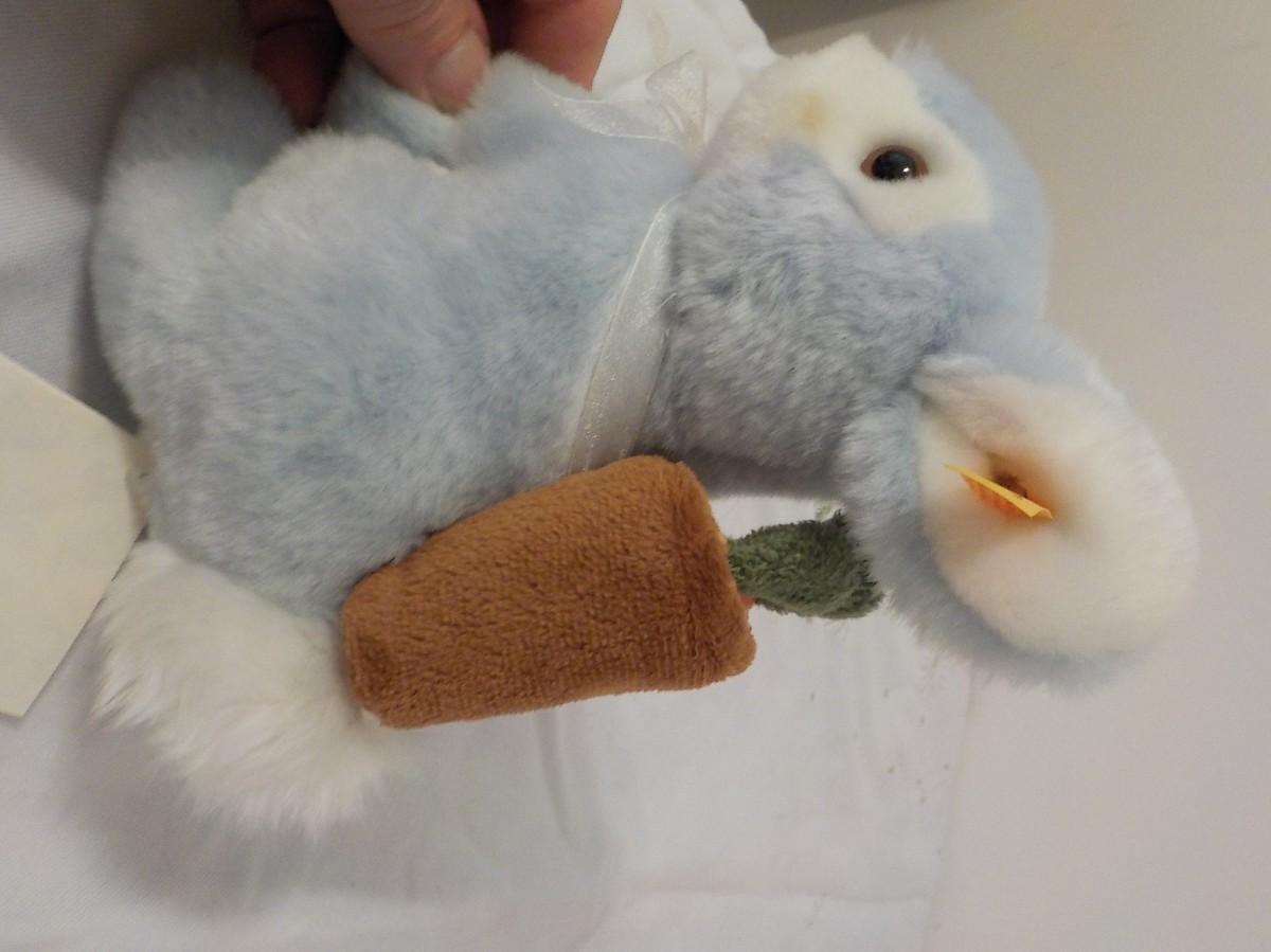 Stamding 8 in. tall and as soft as velvet, baby blue with carrots in back pack.