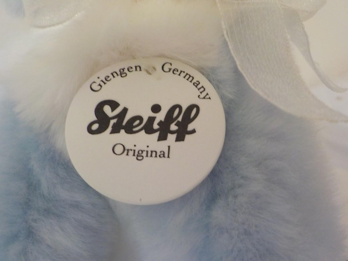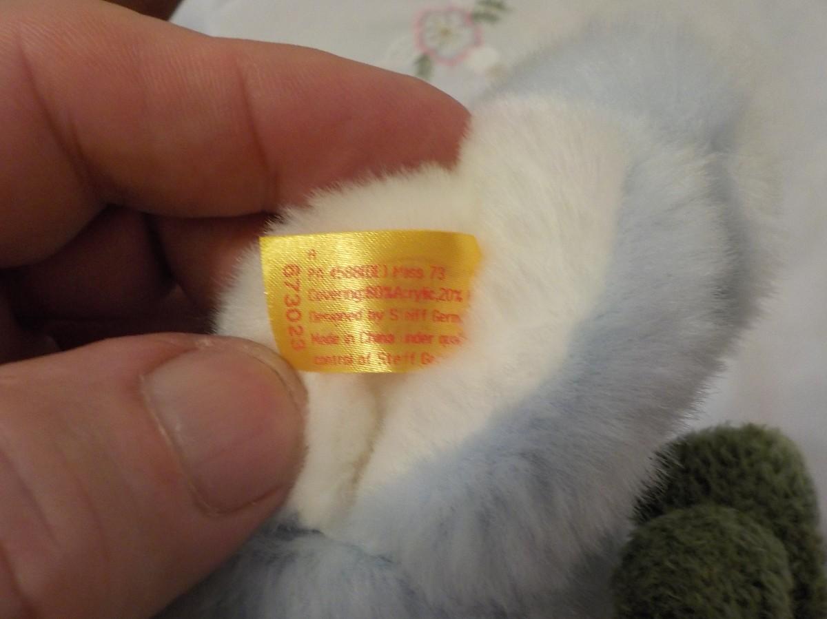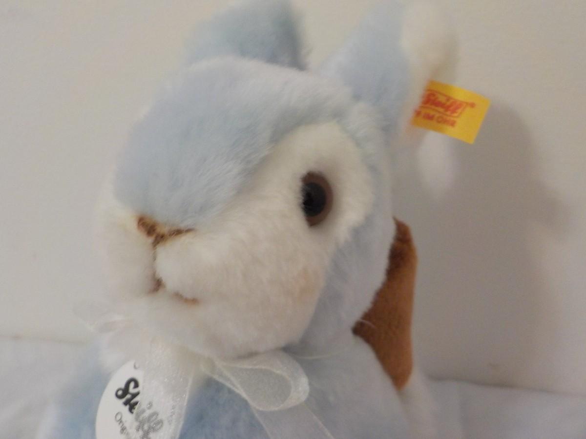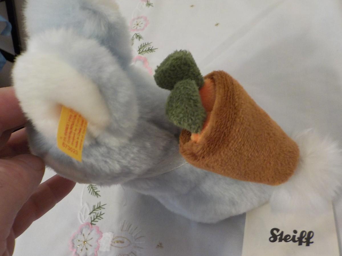 Stamding 8 in. tall and as soft as velvet, baby blue with carrots in back pack.