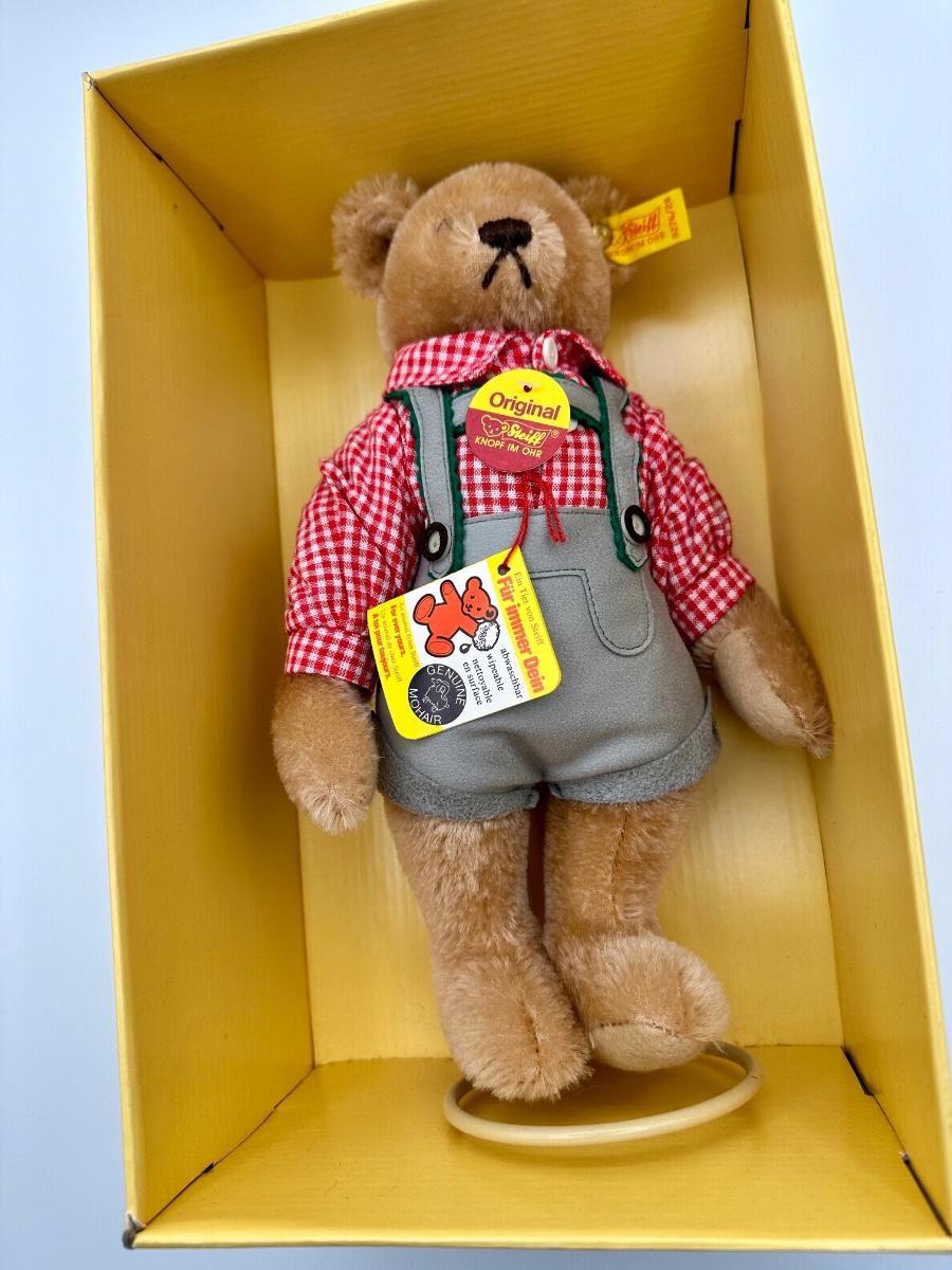 This is an original Steiff Blond Mohair Teddy Bear dressed in Lederhosen, number EAN 0276/28. This Fully Jointed Teddy Bear is approximately 10” tall, made from blonde mohair with felt paw and foot pads. The classic Steiff Yellow Button in Ear tag, chest tag and hang tag are all intact. This bear is in new, unused condition in the original box along with the stand that is shown in the pictures. This handsome Teddy Bear would make a great addition to any Steiff or Teddy Bear Collection.