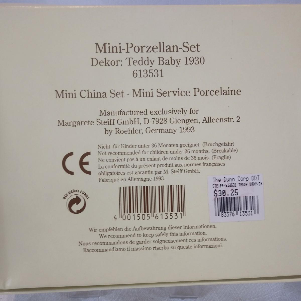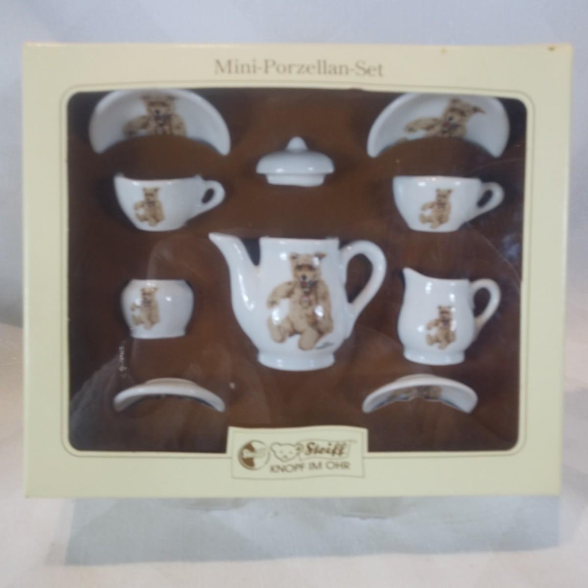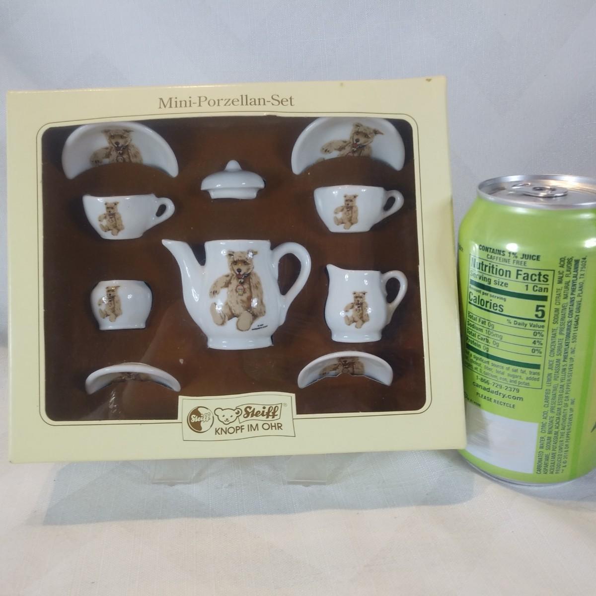 This auction lot is for a Steiff Miniature Toy Tea Set. This boxed tea set is from Germany. All text is in German. It has never been used and is very nice for a Teddy Bear tea party. Made of porcelain.