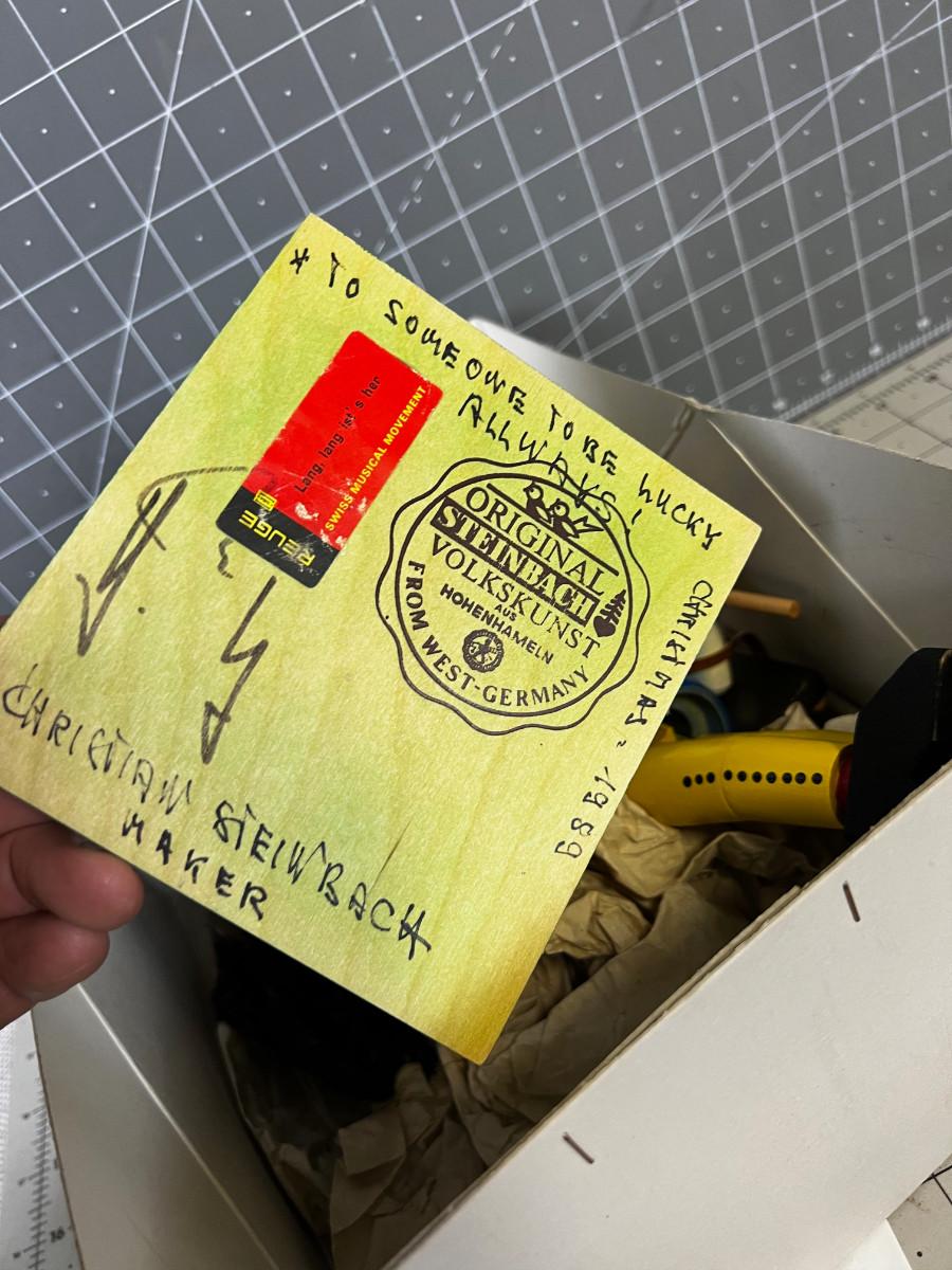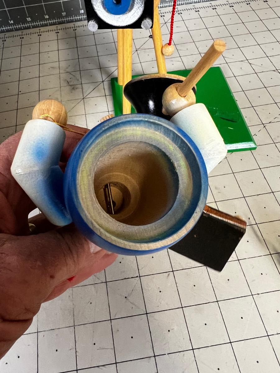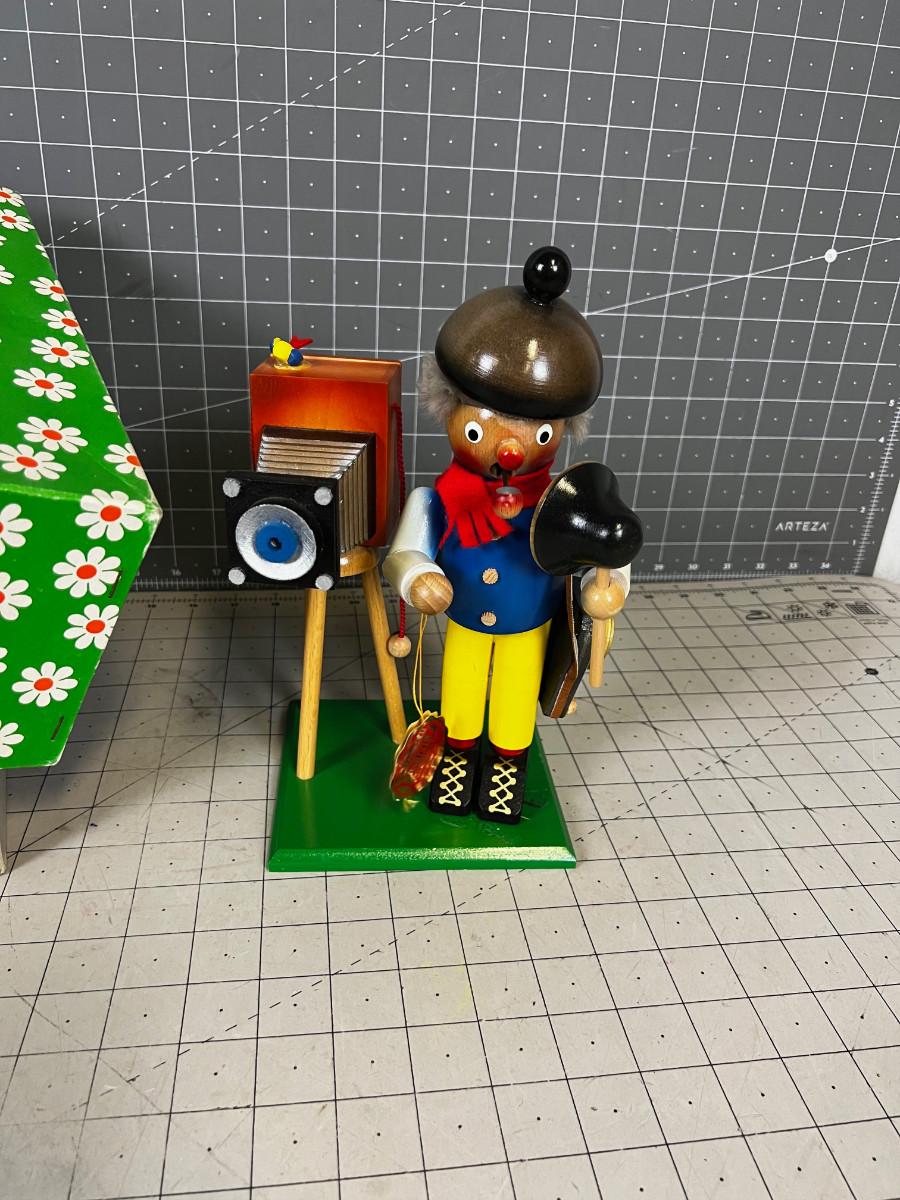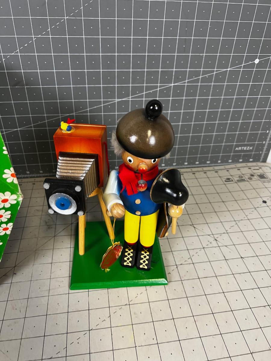 The photographer / smoker just needs to be reglued. It was glued and its dried out. Good Condition. Collectible in Original Box FUN!!