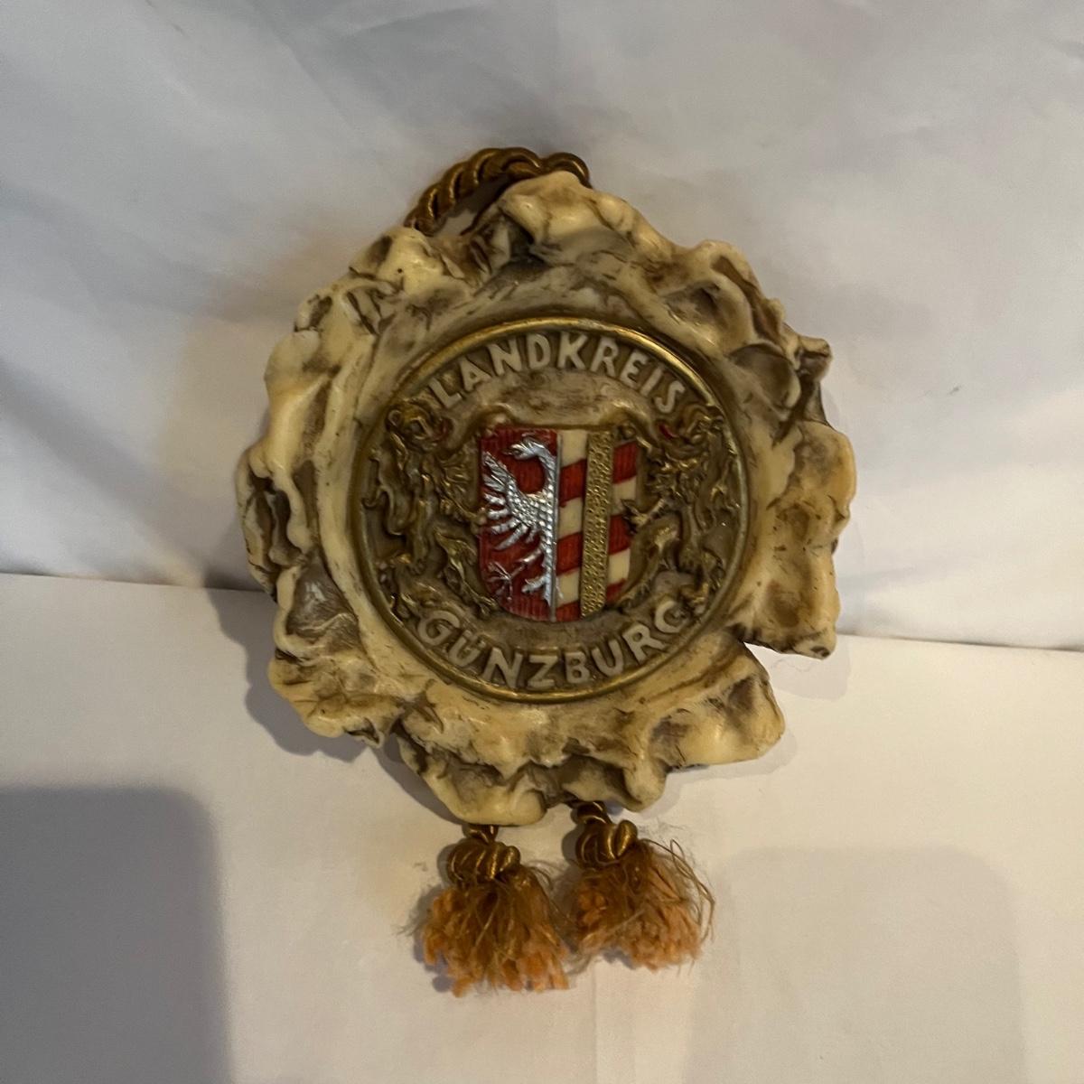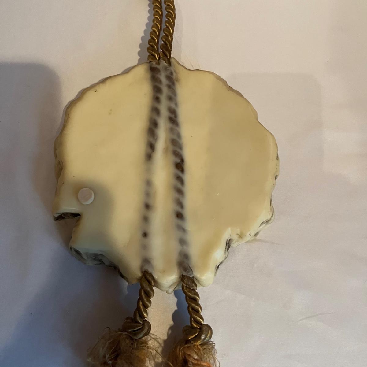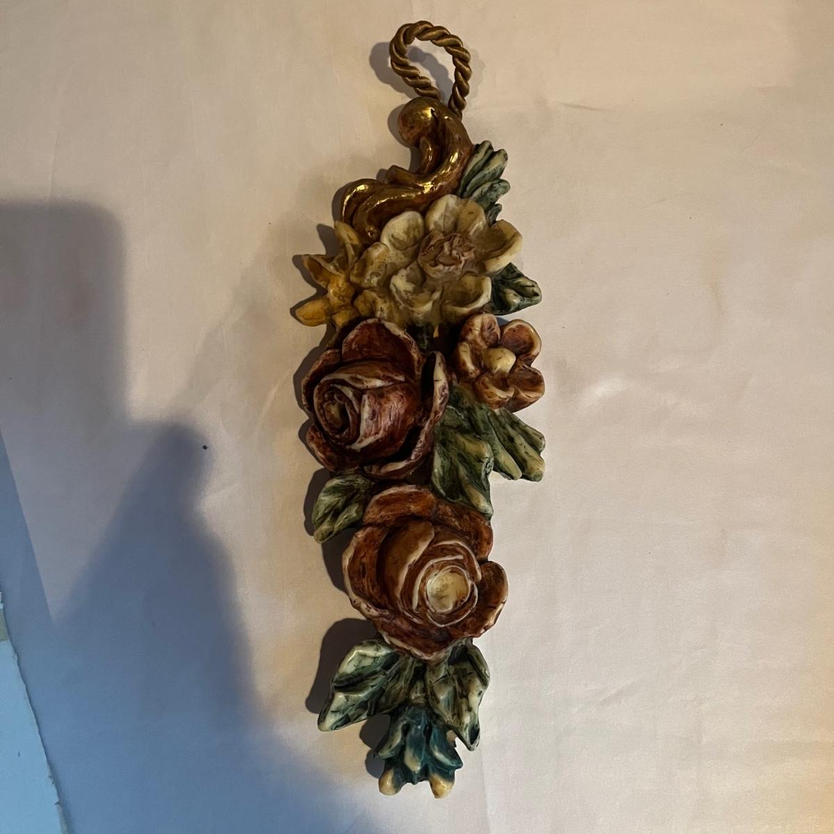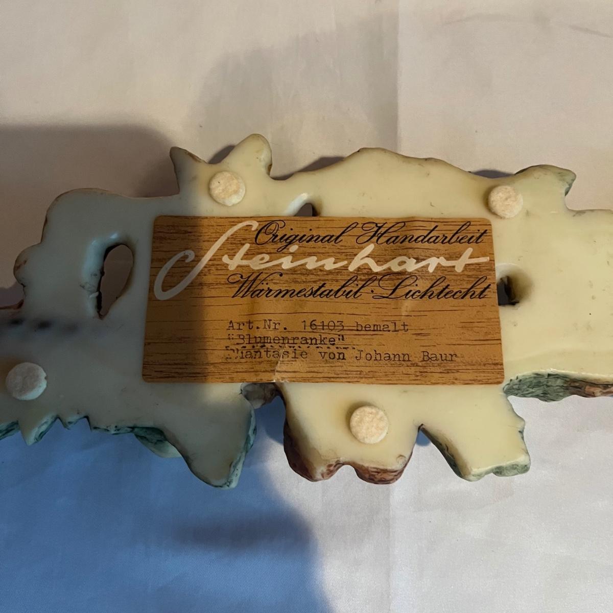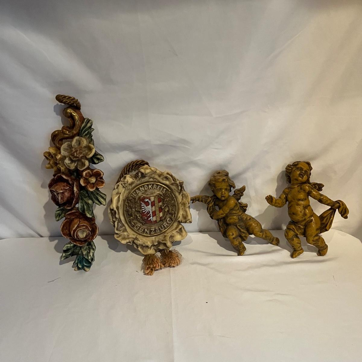 Lot includes two figurines, and two wall hanging wax pieces. The rose wall hanging is marked Steinhart and the other three are unmarked but appear to be the same style. Circular piece measures 6.5”D.