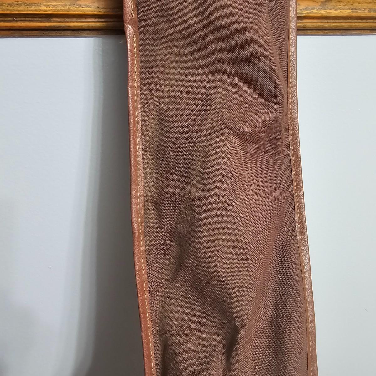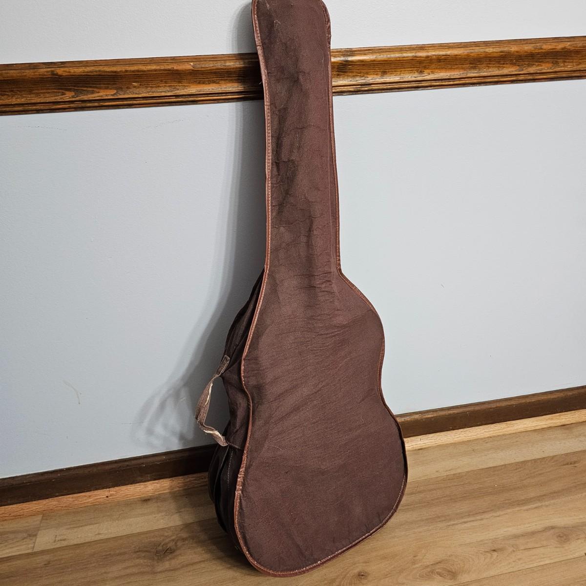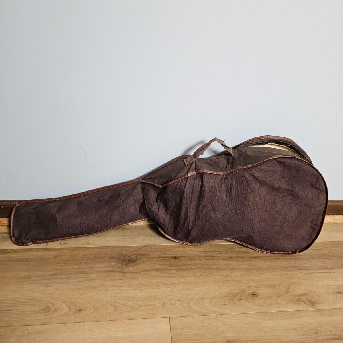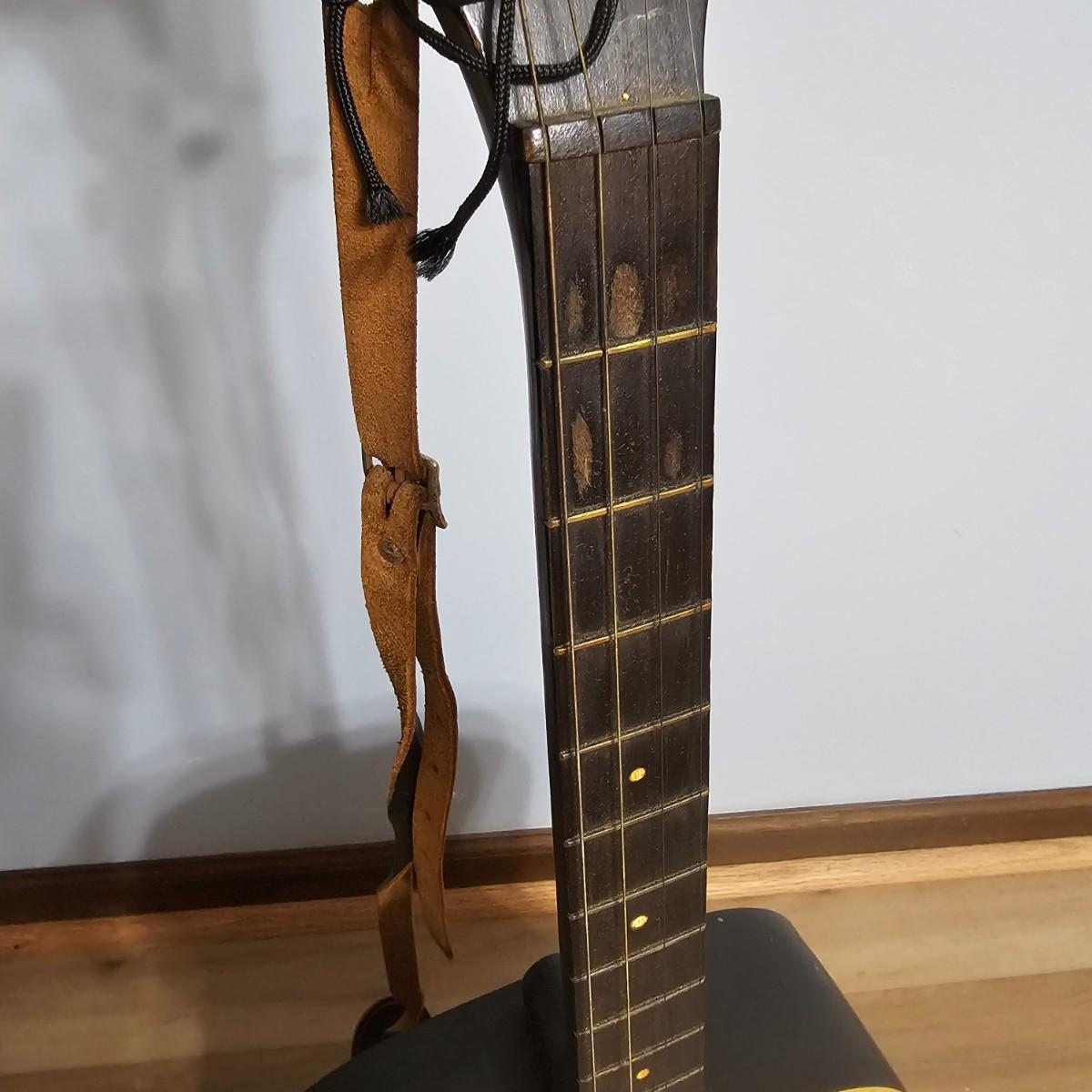 Compact size Stella four string guitar. Instrument is well used, has some finger marks in top part of fretboard. Dark brown with sunburst finish front and back. Measures 13" x 4" x 37"H. Comes with leather strap and light canvas soft carrying case with handle. Some stains on outside of case. See photos for details. All sales are final. No returns or refunds. Please bid accordingly. Shipping available.
