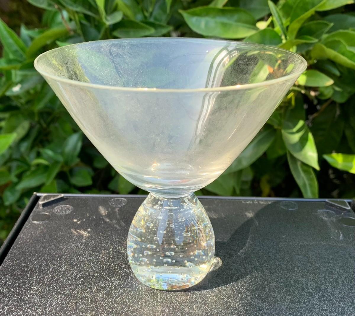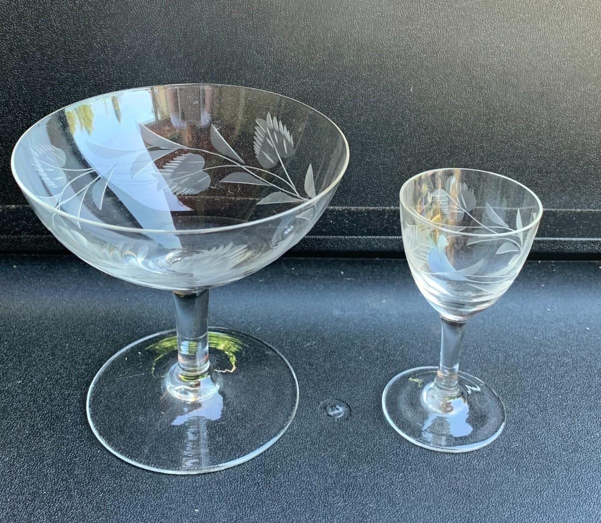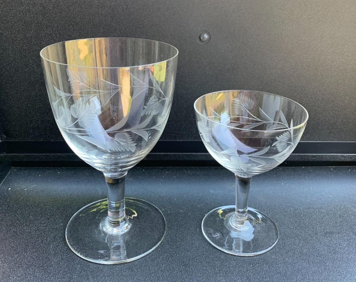 3 boxes of Etched crystal stemware: 18 champagne glasses, 6 aperitif glasses, 27 goblets in 2 sizes. 1 box of stemmed Martini glasses, total 6 pieces