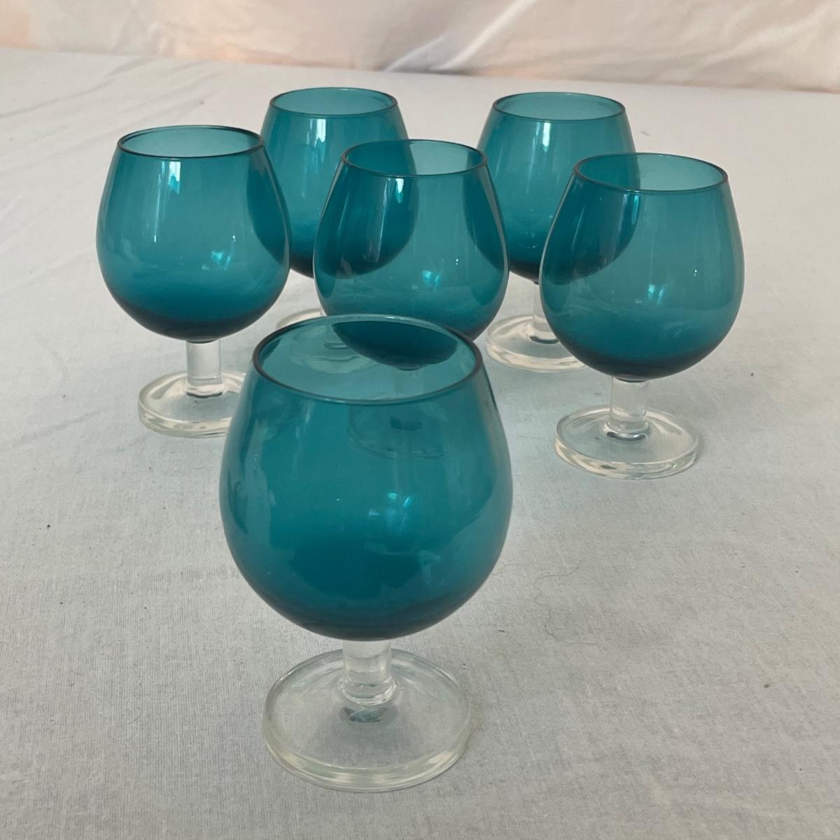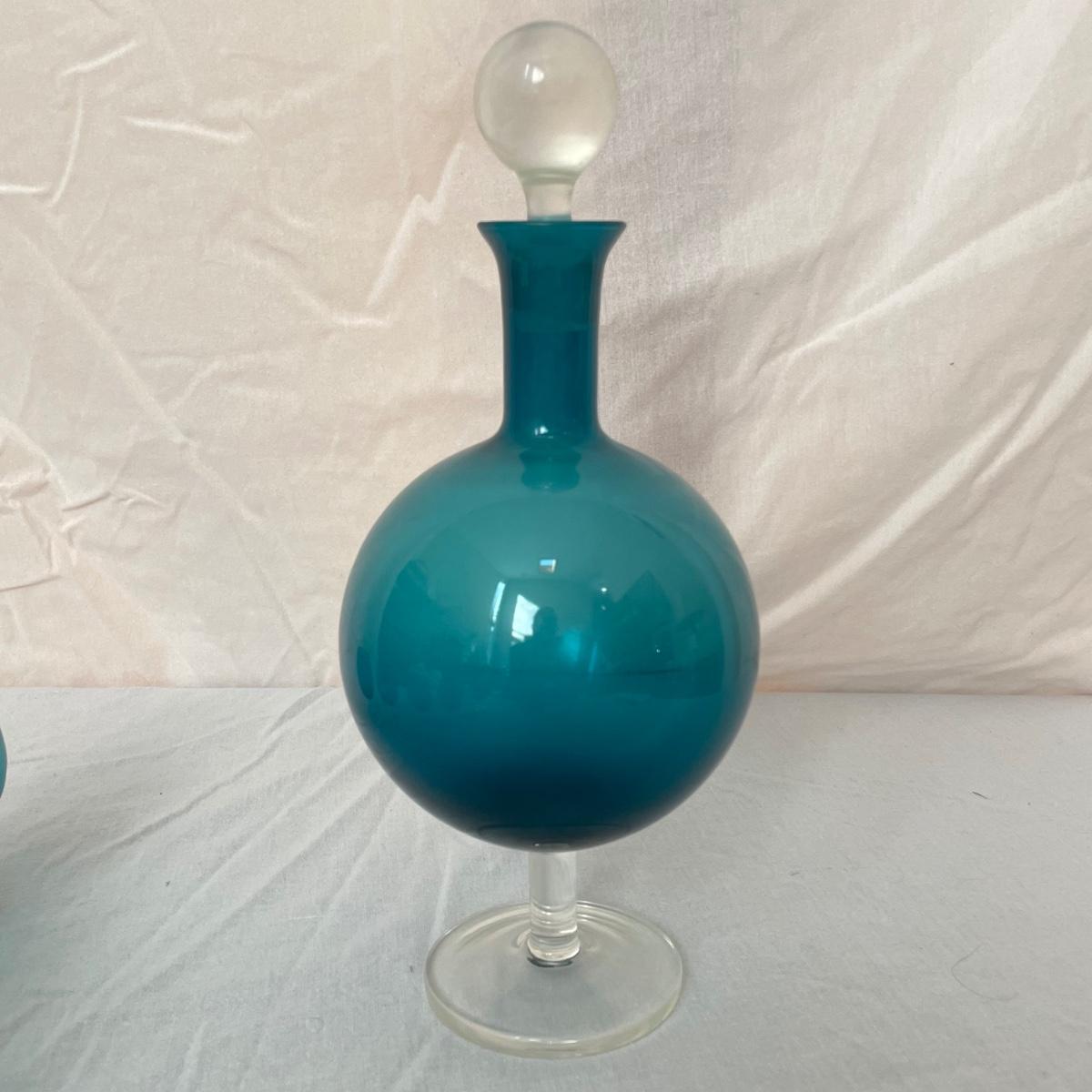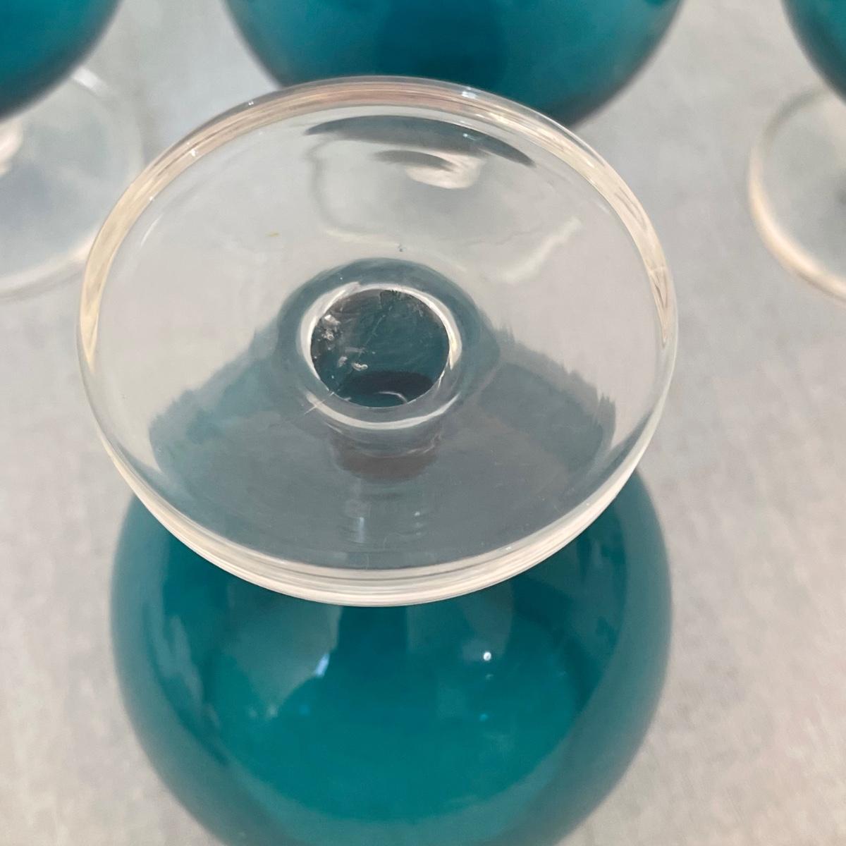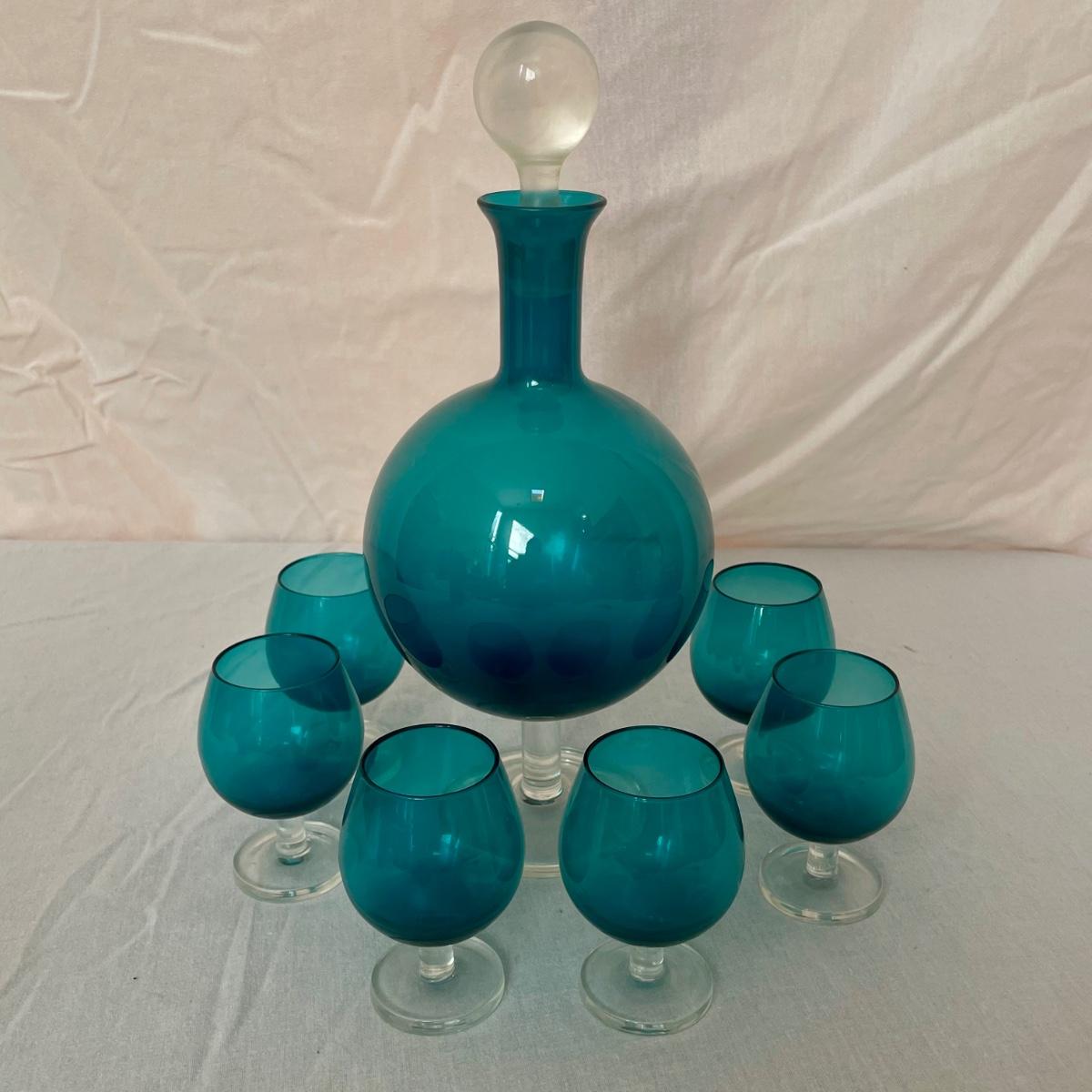 This set includes a stemmed liqueur decanter & 6 liqueur glasses that appear to be possibly hand blown. All pieces have clear stems and vibrant turquoise-blue glass. The decanter's finial is a clear orb with a conical stopper. All pieces are in very good condition.