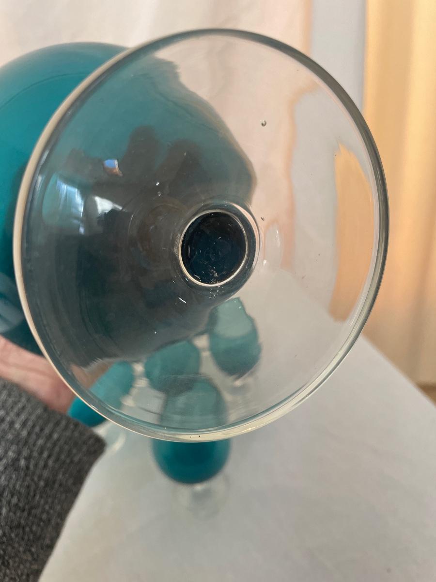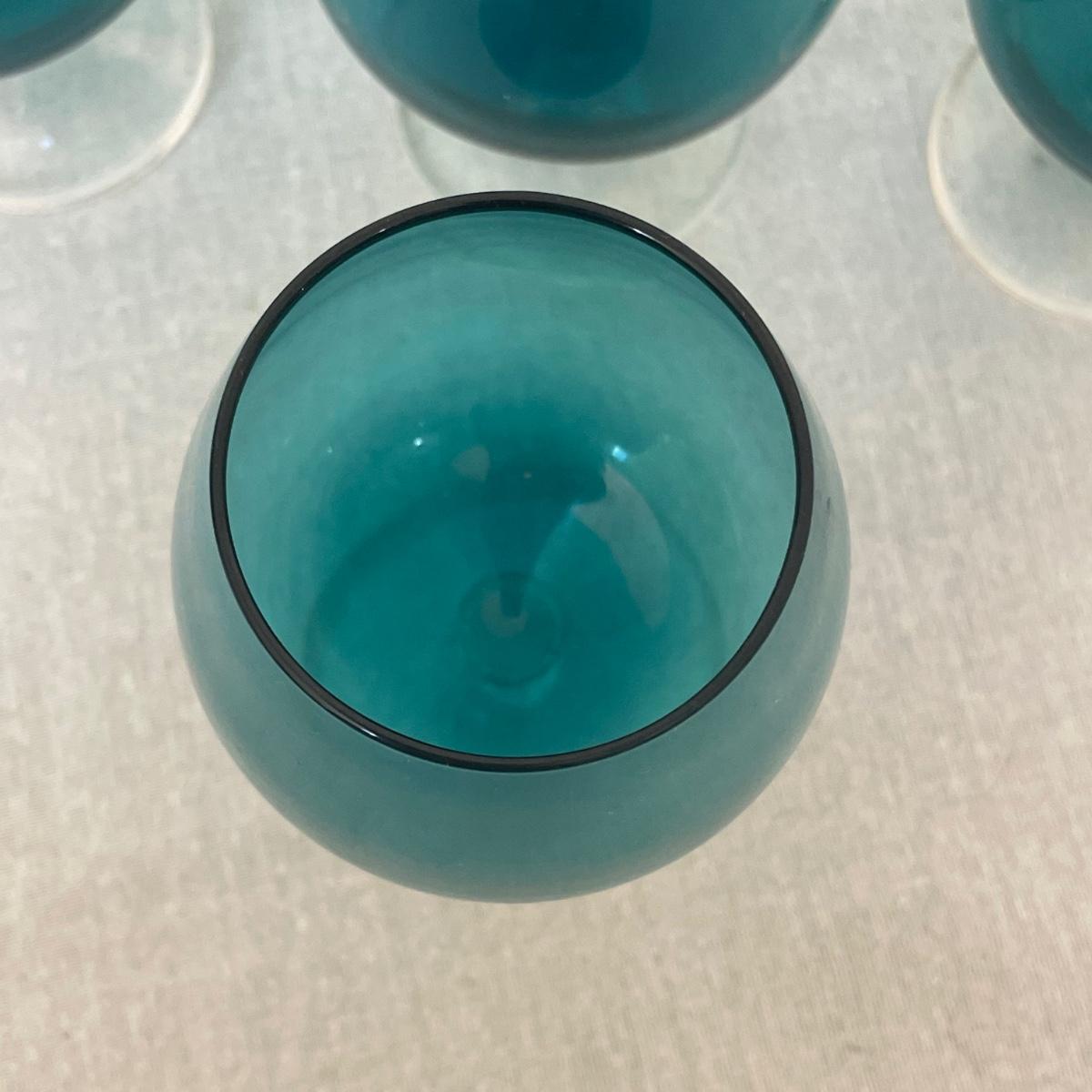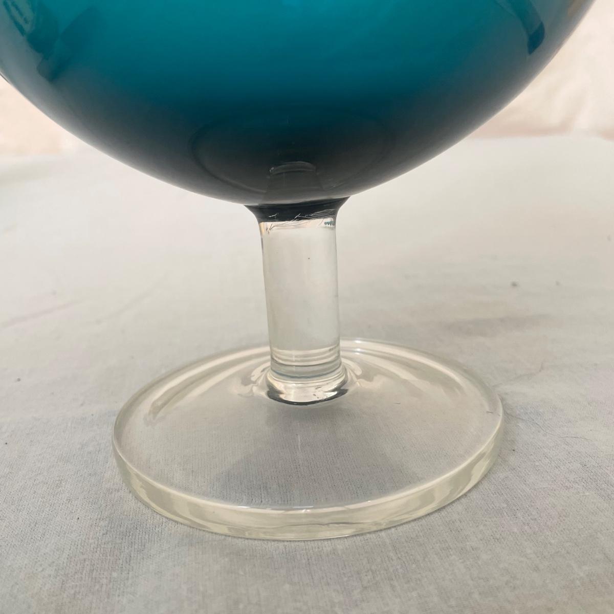 This set includes a stemmed liqueur decanter & 6 liqueur glasses that appear to be possibly hand blown. All pieces have clear stems and vibrant turquoise-blue glass. The decanter's finial is a clear orb with a conical stopper. All pieces are in very good condition.
