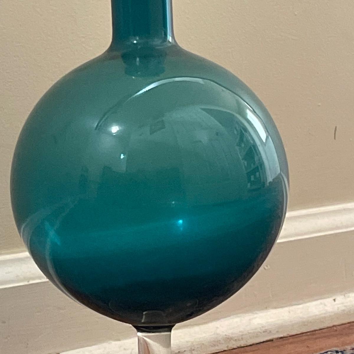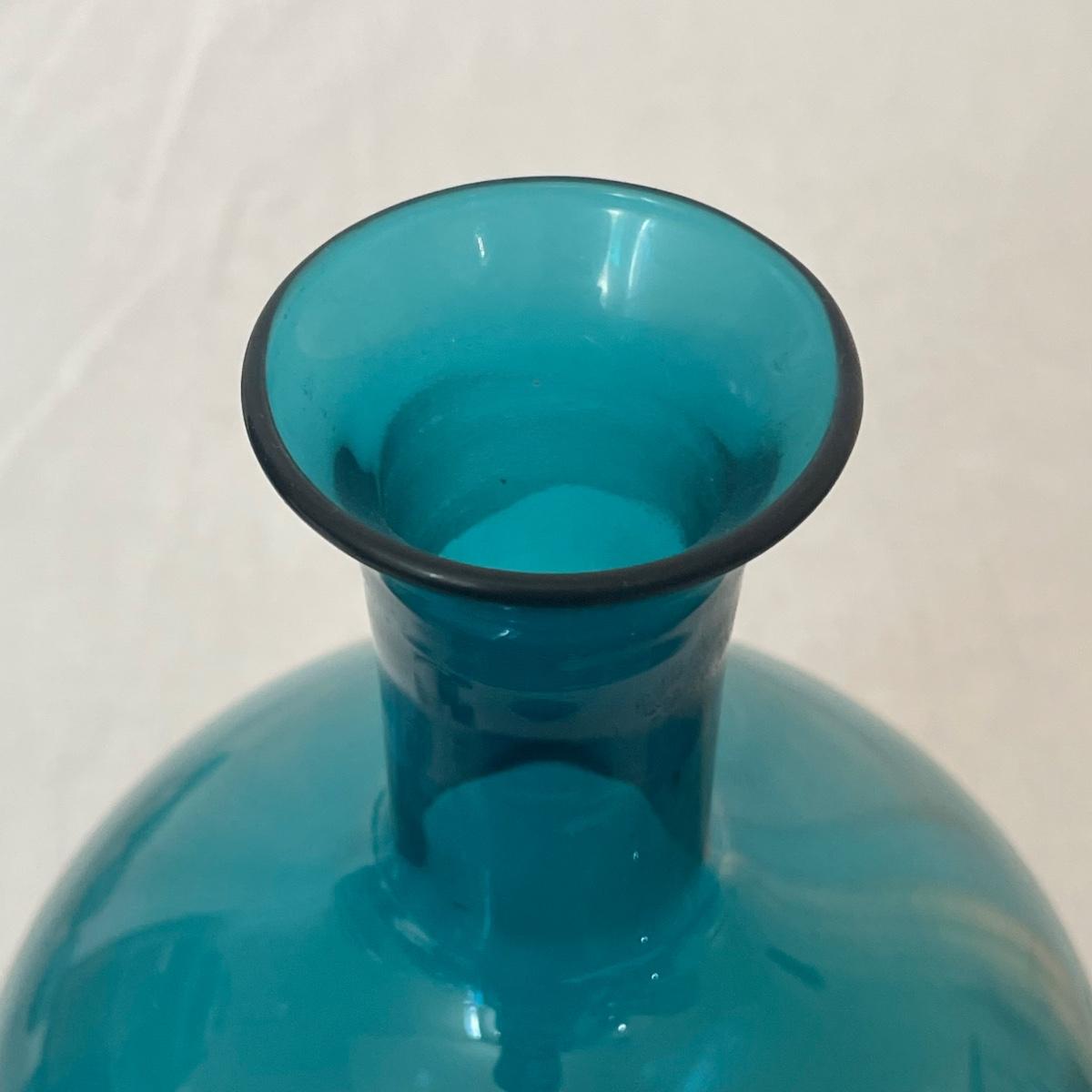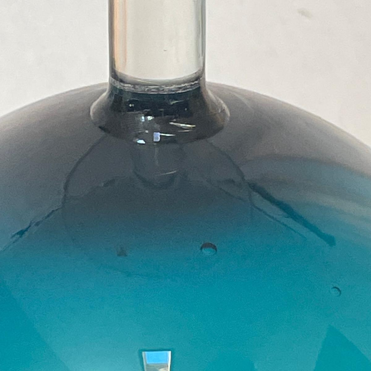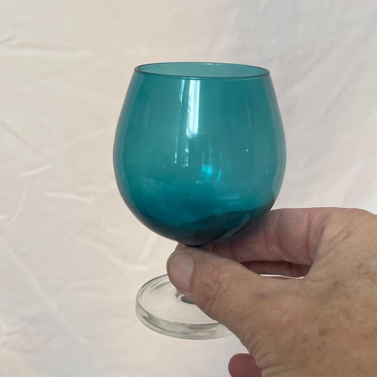 This set includes a stemmed liqueur decanter & 6 liqueur glasses that appear to be possibly hand blown. All pieces have clear stems and vibrant turquoise-blue glass. The decanter's finial is a clear orb with a conical stopper. All pieces are in very good condition.