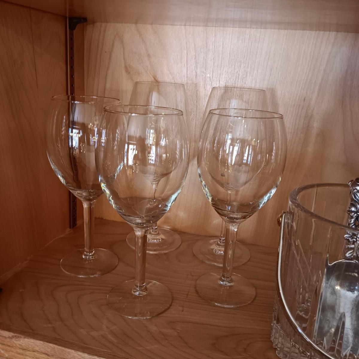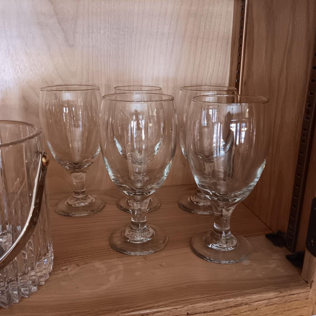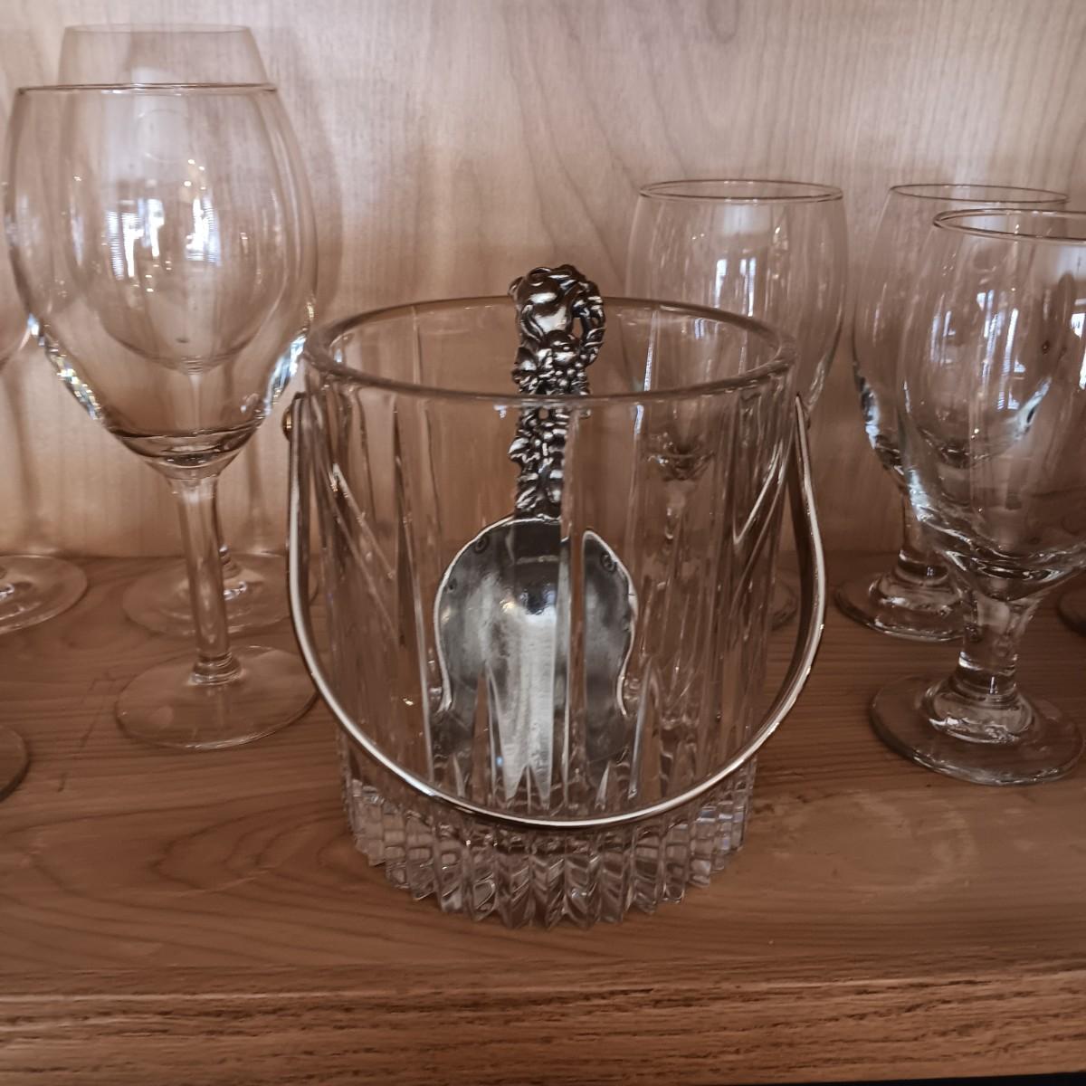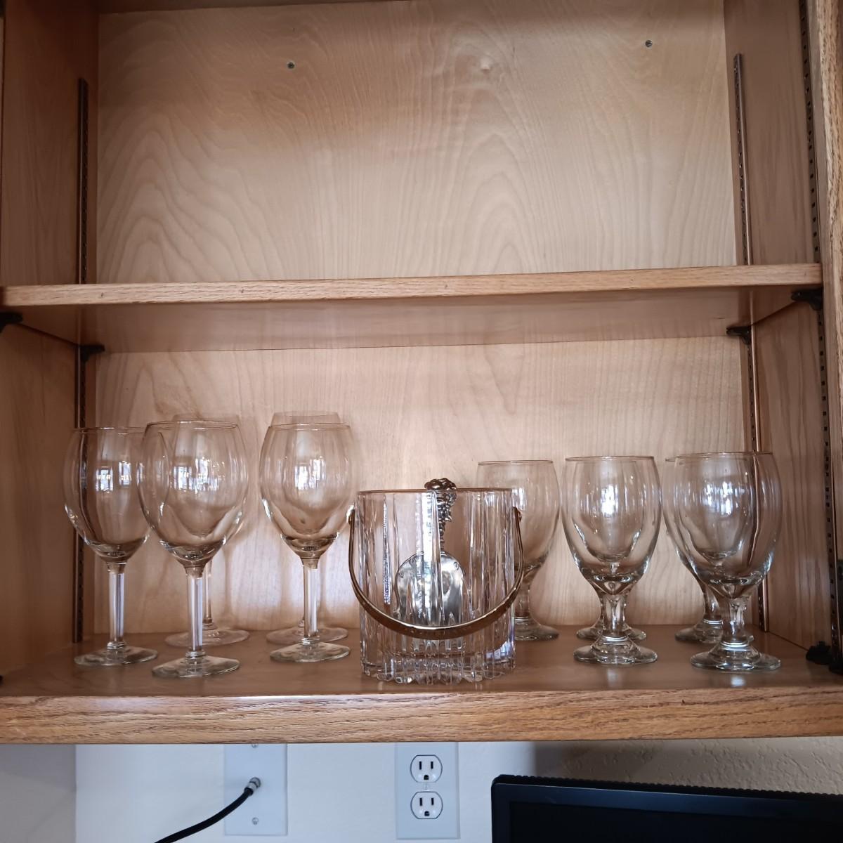 STEMMED GLASSES, GLASS ICE BUCKET WITH A PEWTER SCOOP