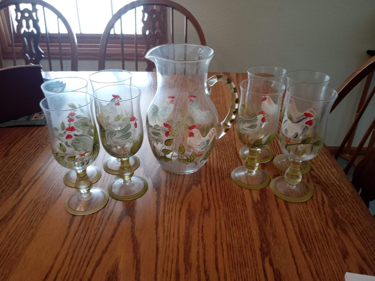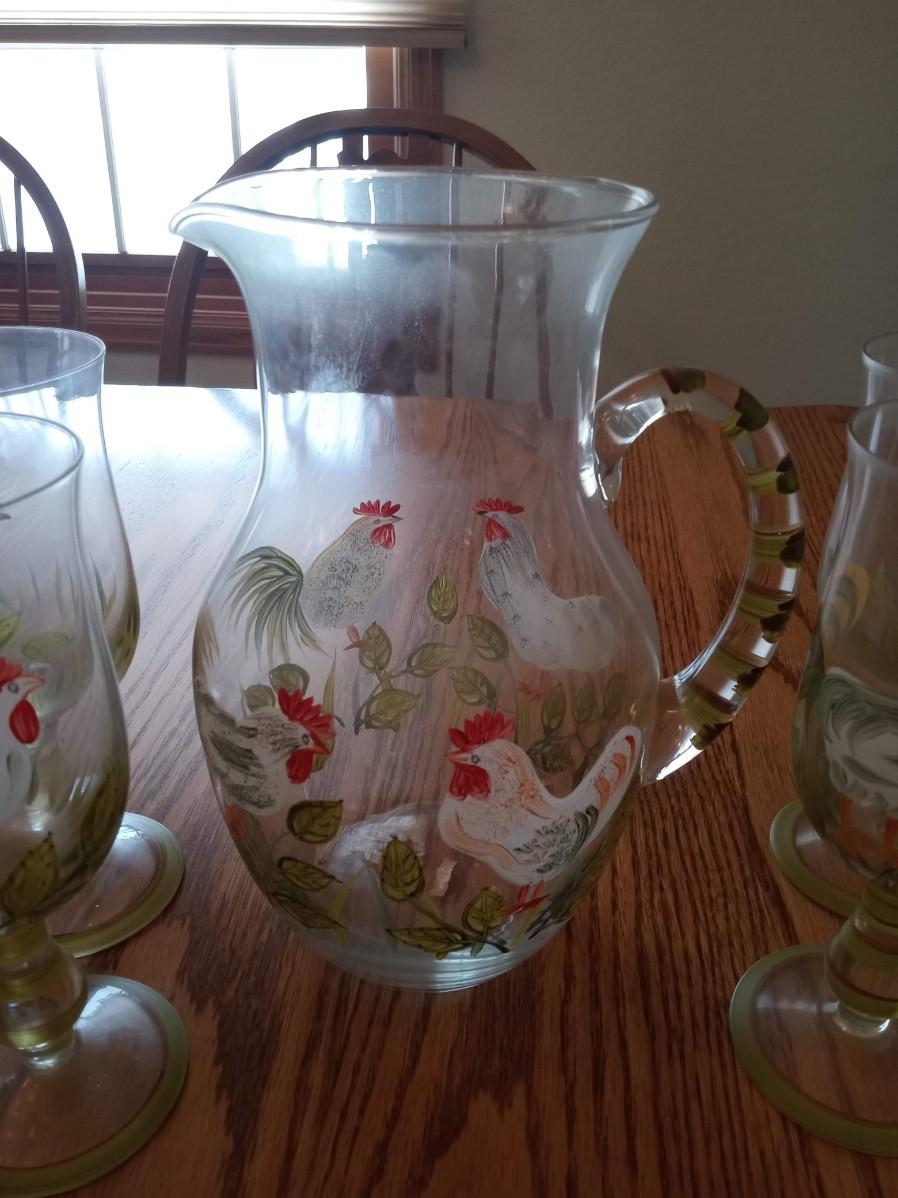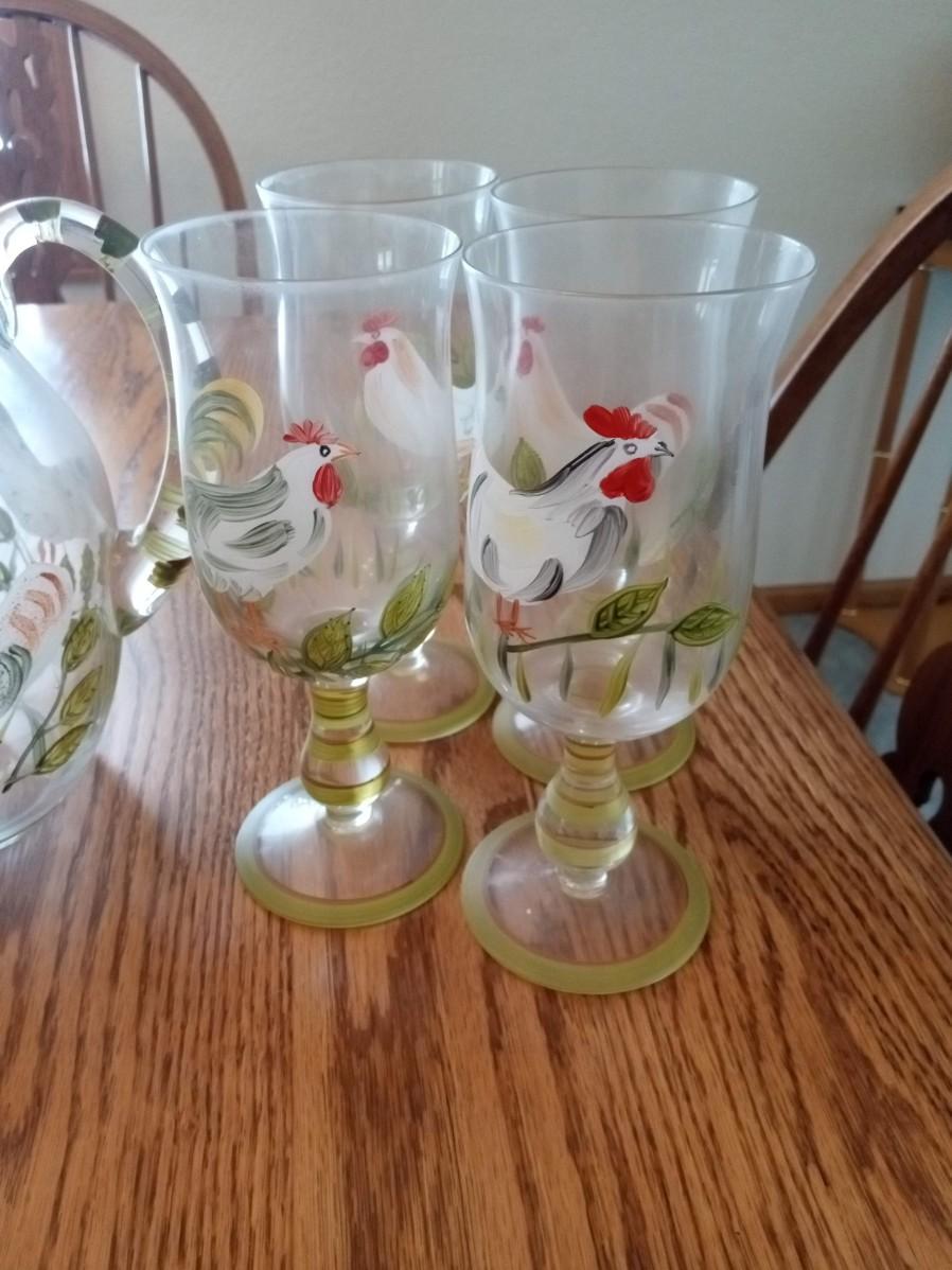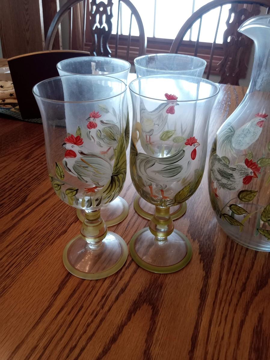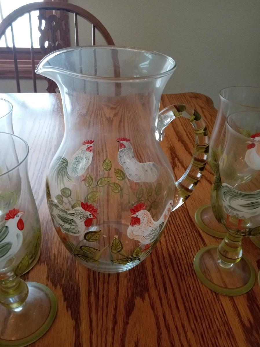 STEMMED ROOSTER GLASSES AND A MATCHING PITCHER