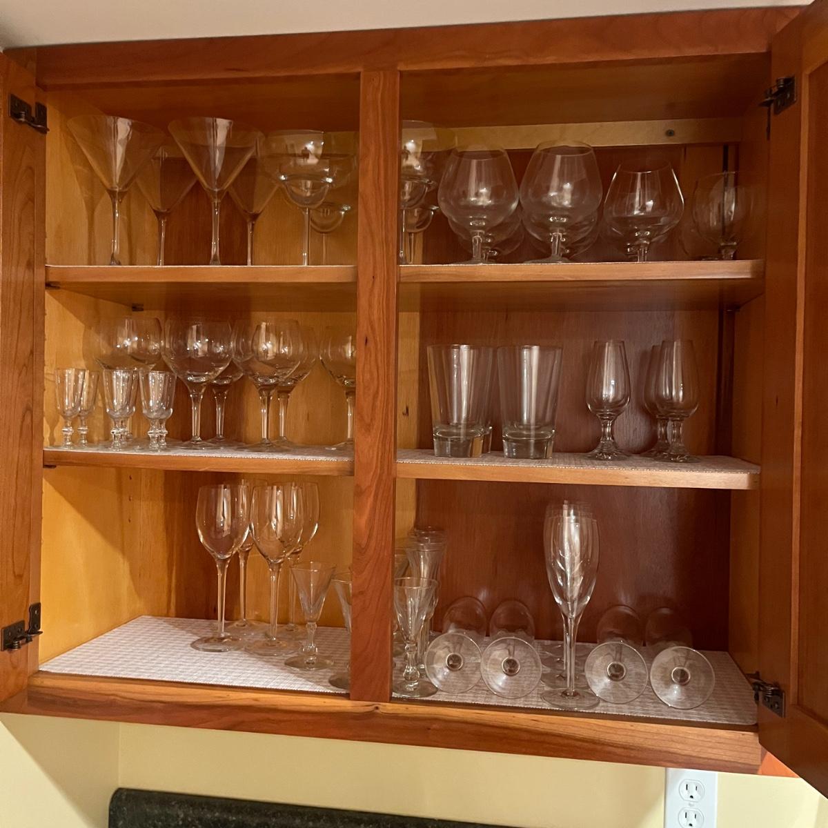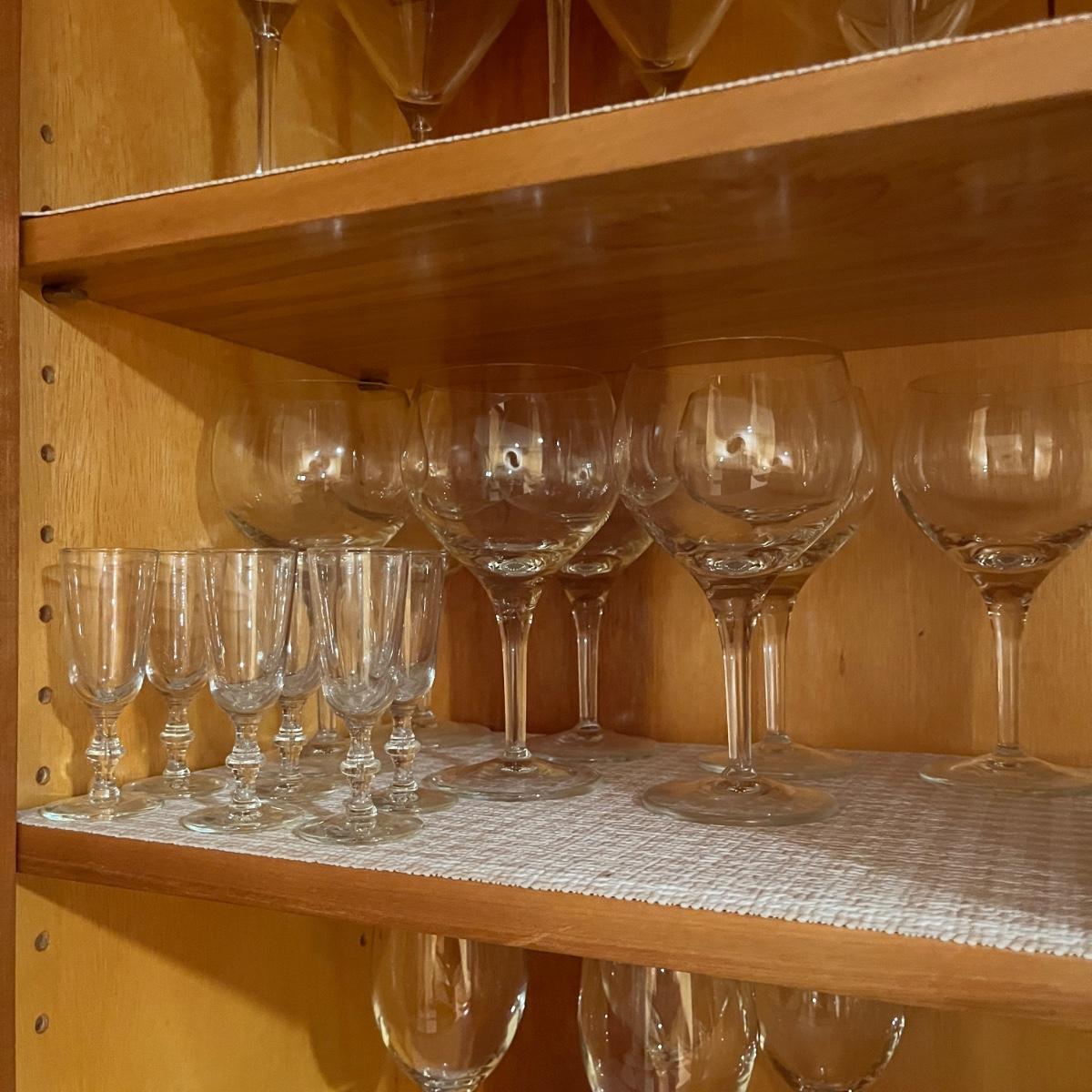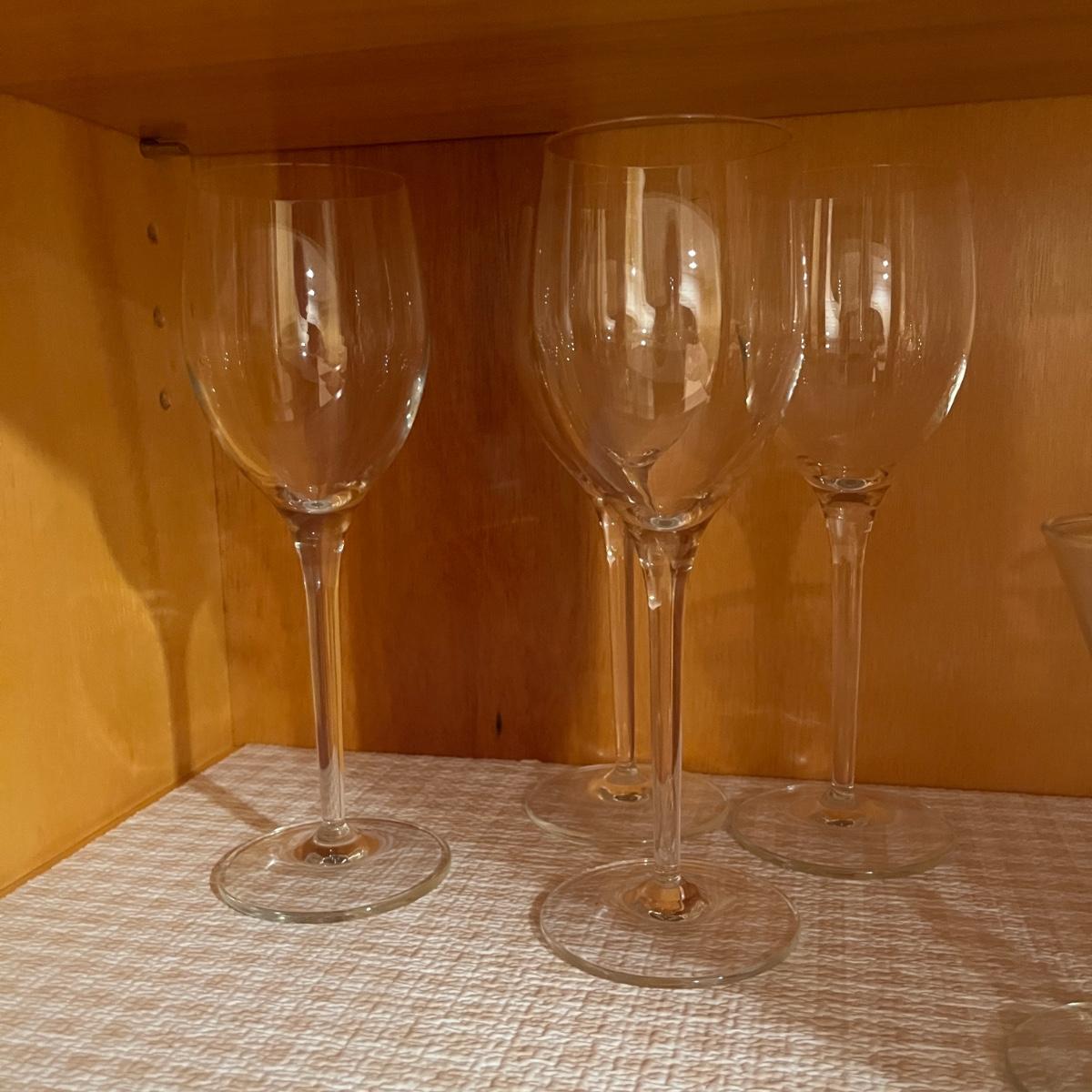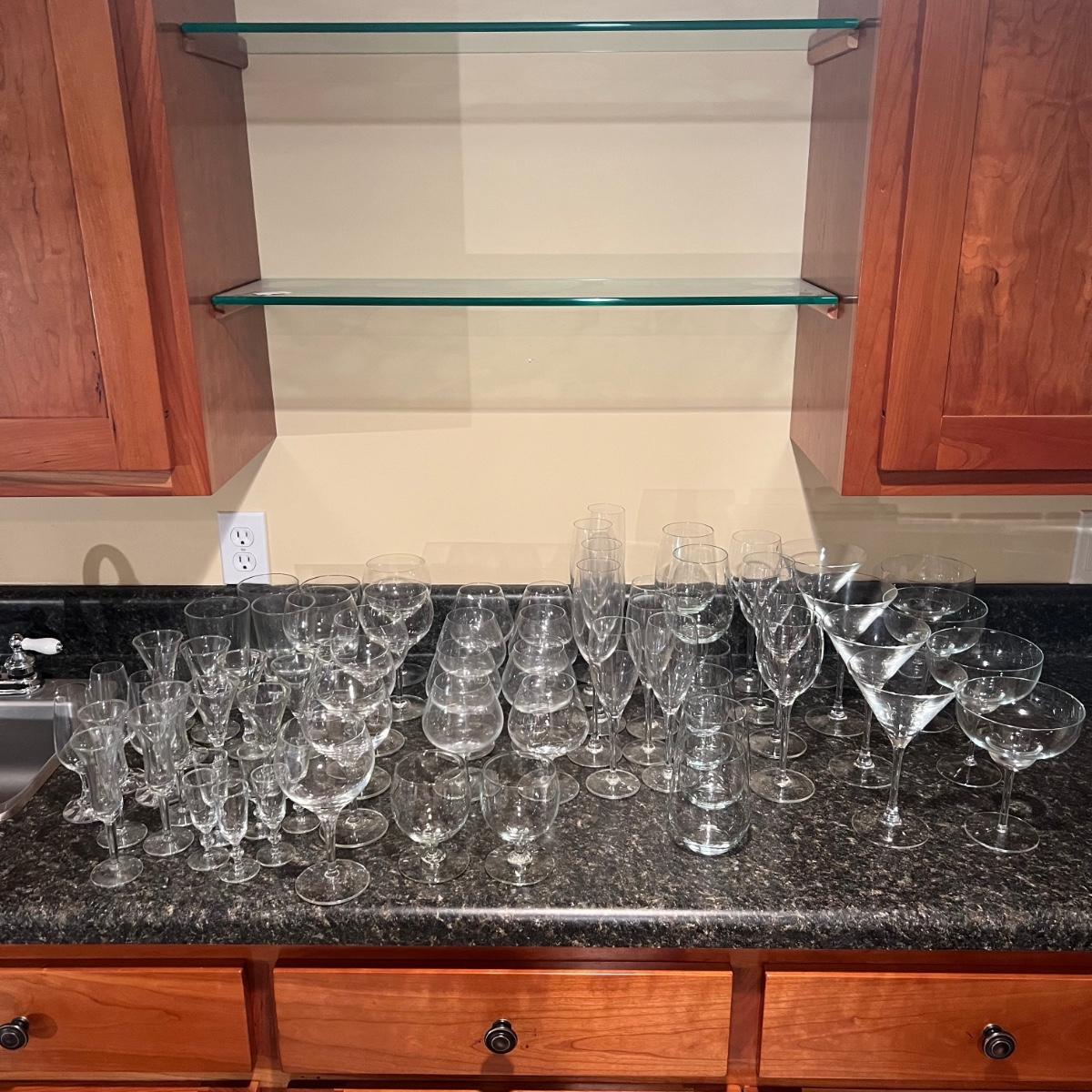Lot includes over 50 stemmed glasses in a variety of styles and sizes. Also includes a set of eight stemless wine glasses. Tallest glass measures 2.75”D x 10”H.