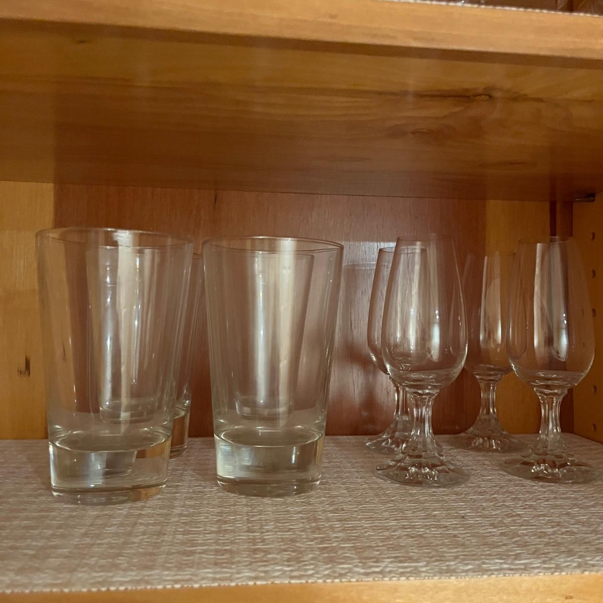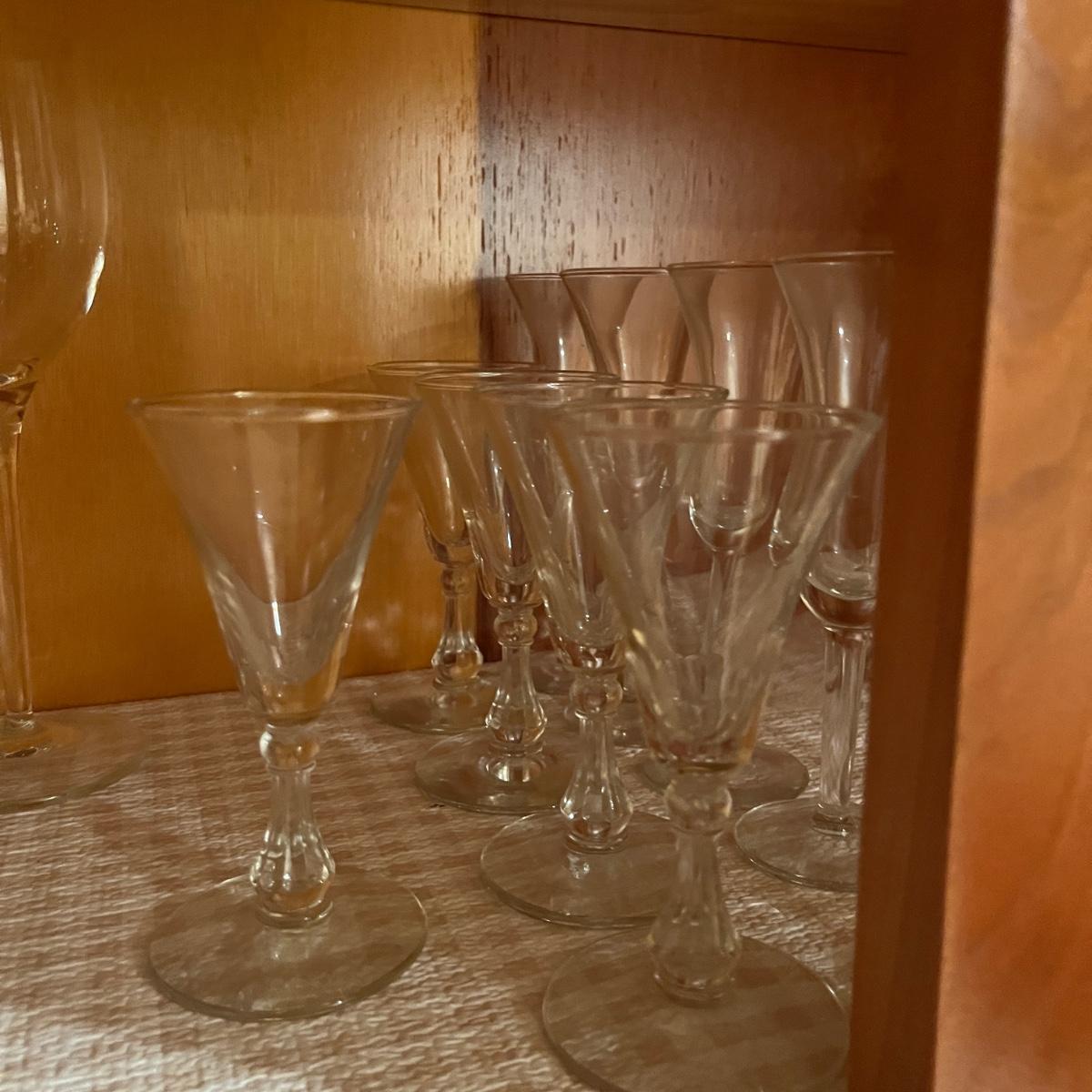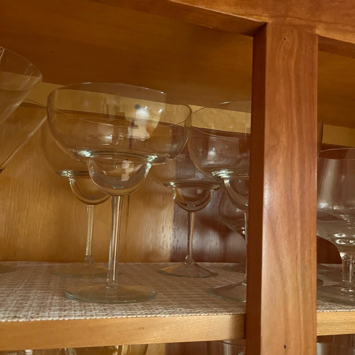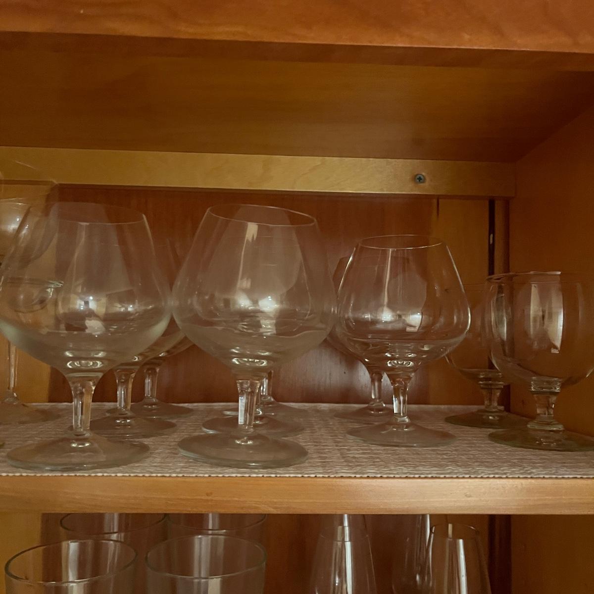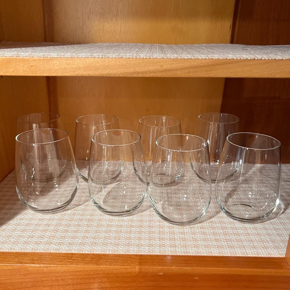 Lot includes over 50 stemmed glasses in a variety of styles and sizes. Also includes a set of eight stemless wine glasses. Tallest glass measures 2.75”D x 10”H.