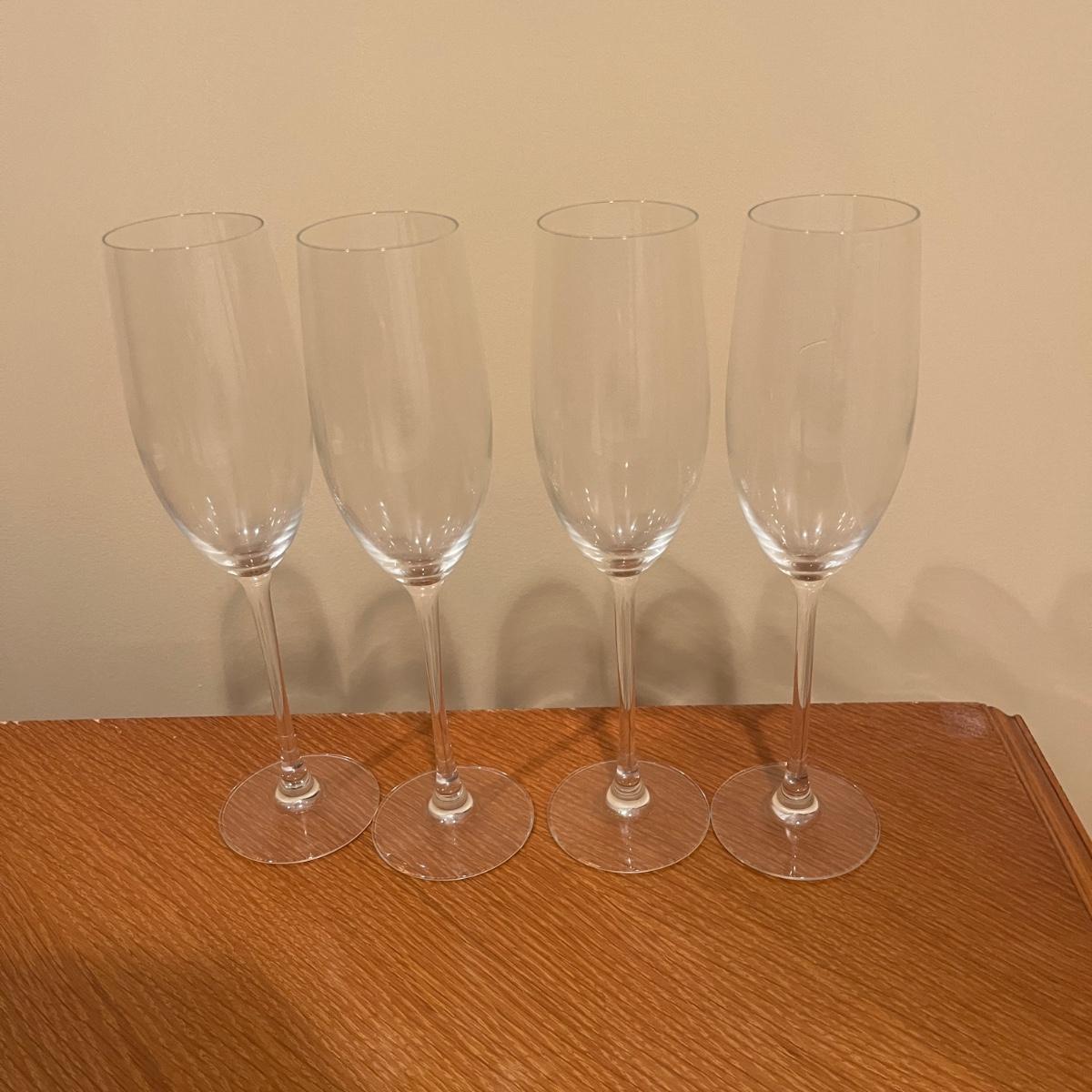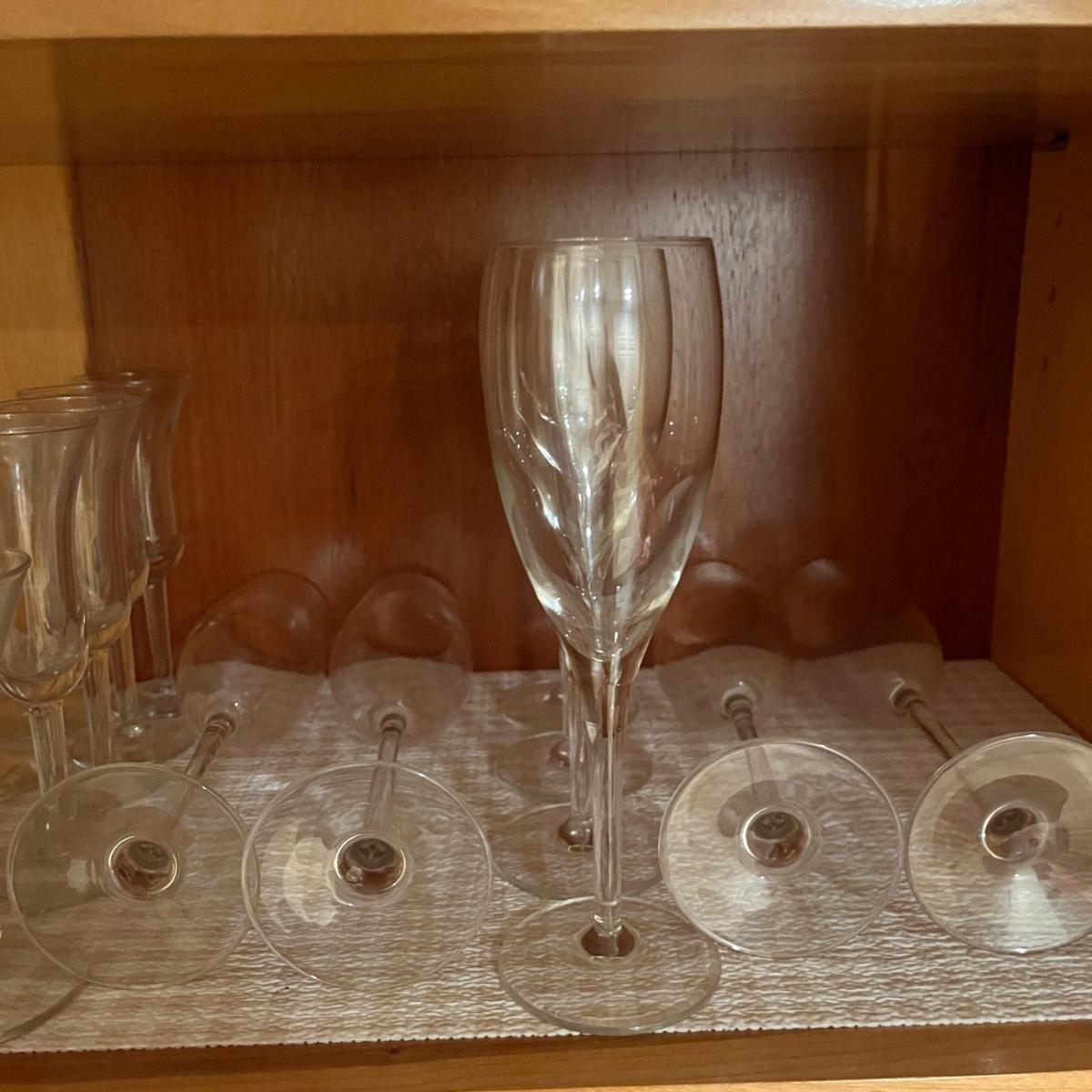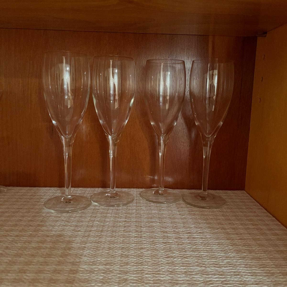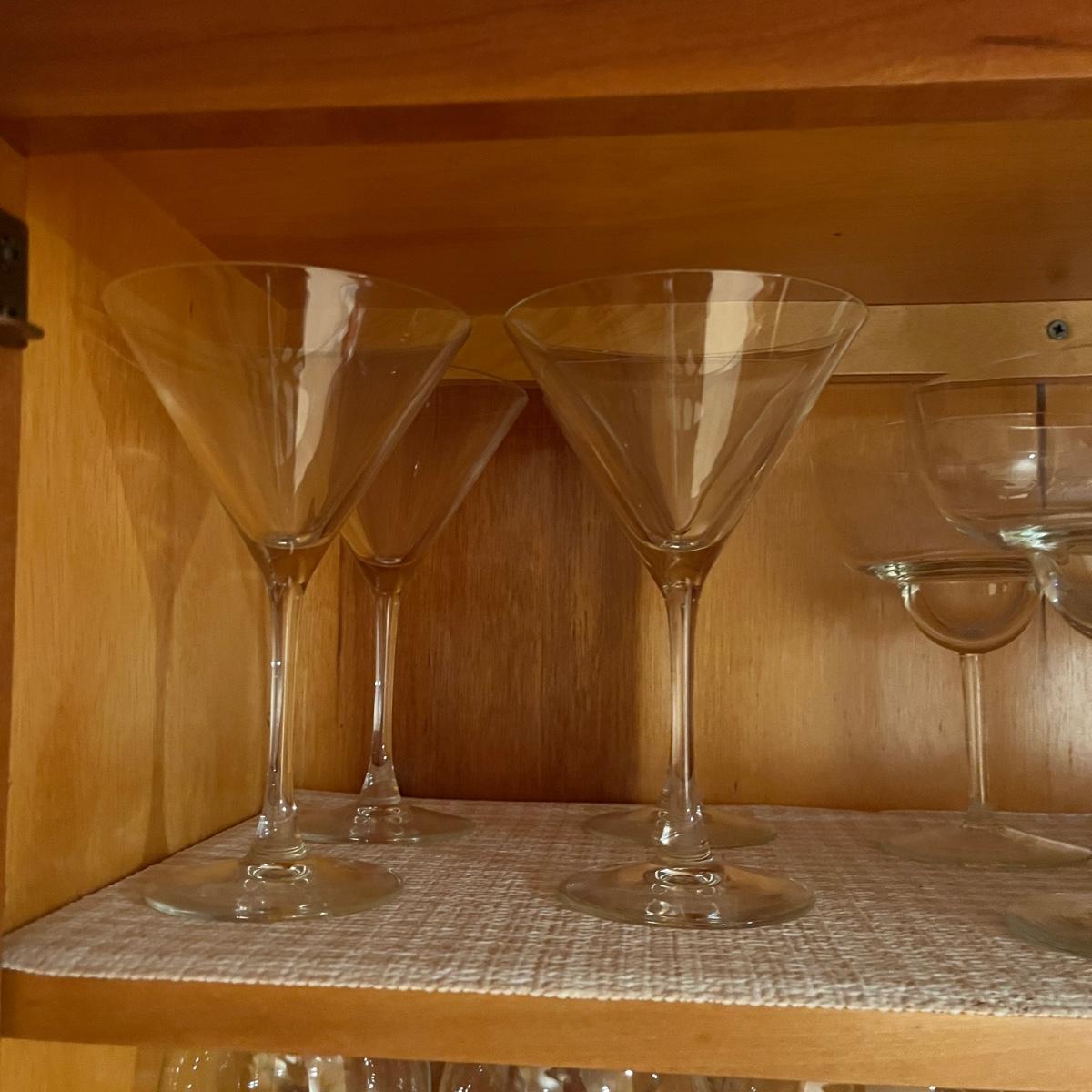 Lot includes over 50 stemmed glasses in a variety of styles and sizes. Also includes a set of eight stemless wine glasses. Tallest glass measures 2.75”D x 10”H.