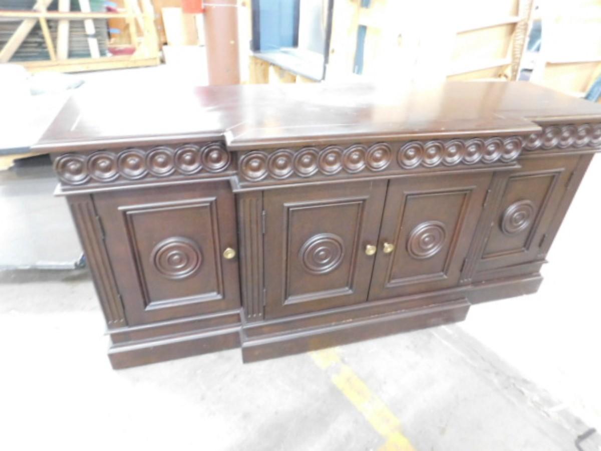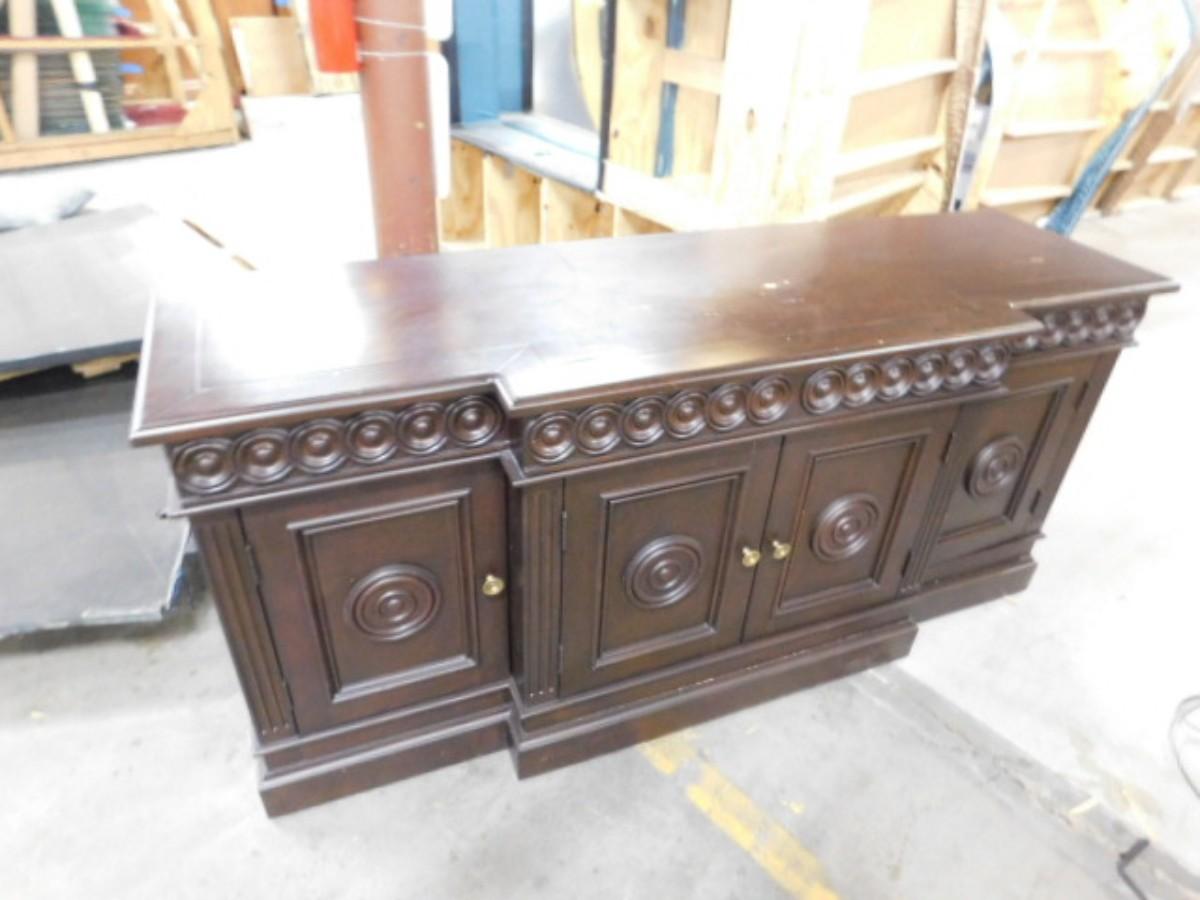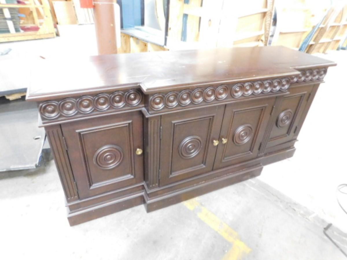 Step Front Sideboard Mahogany Finish with Shelved Cabinets Choice A. Has one shelf per compartment. Needs shelf pins. Has some scratches on top surface. Expect some wear or scratches to the finish. Shipping option available via freight or local mover at Buyer's expense. Buyer must have all shipping scheduled within the stated dates and times of pickup. Recommended local mover is Beaty Bros. Moving 828-201-2982