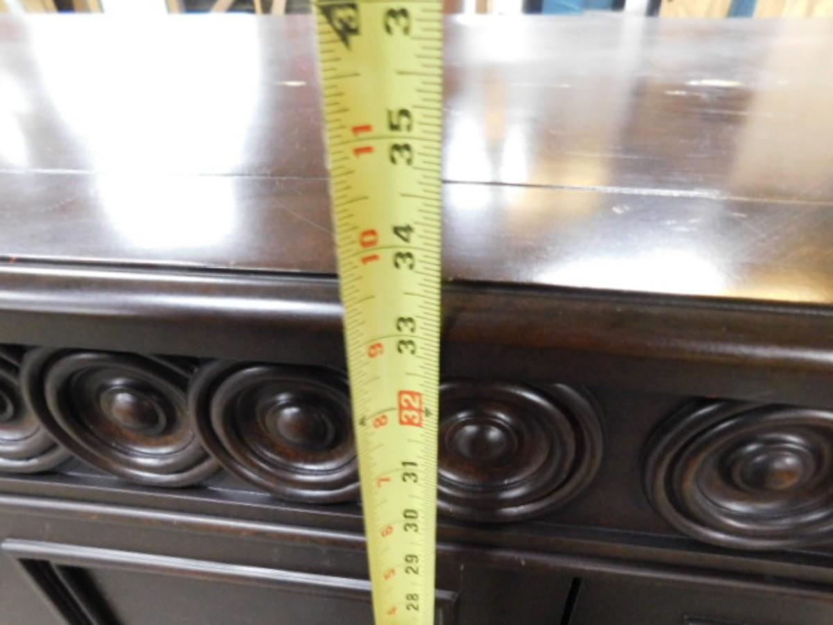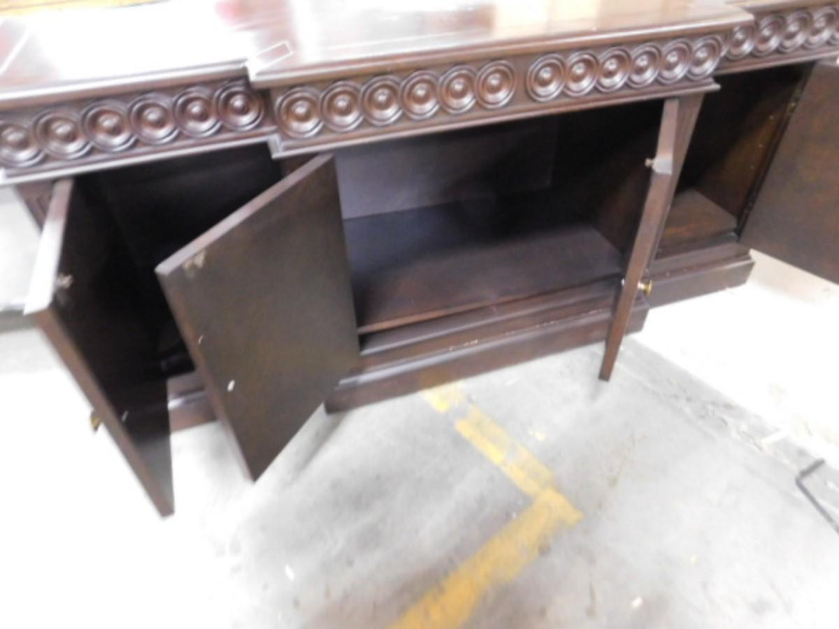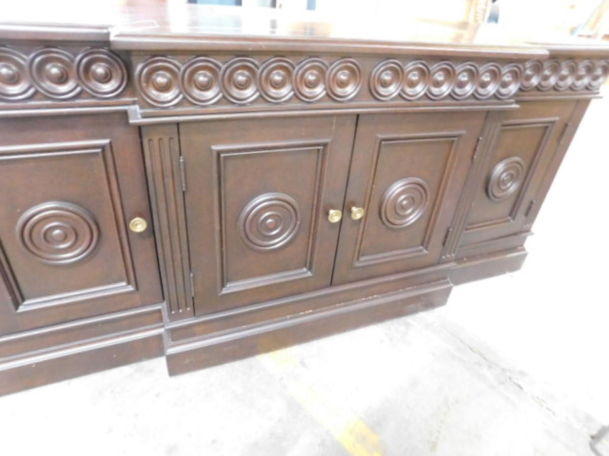 Step Front Sideboard Mahogany Finish with Shelved Cabinets Choice A. Has one shelf per compartment. Needs shelf pins. Has some scratches on top surface. Expect some wear or scratches to the finish. Shipping option available via freight or local mover at Buyer's expense. Buyer must have all shipping scheduled within the stated dates and times of pickup. Recommended local mover is Beaty Bros. Moving 828-201-2982