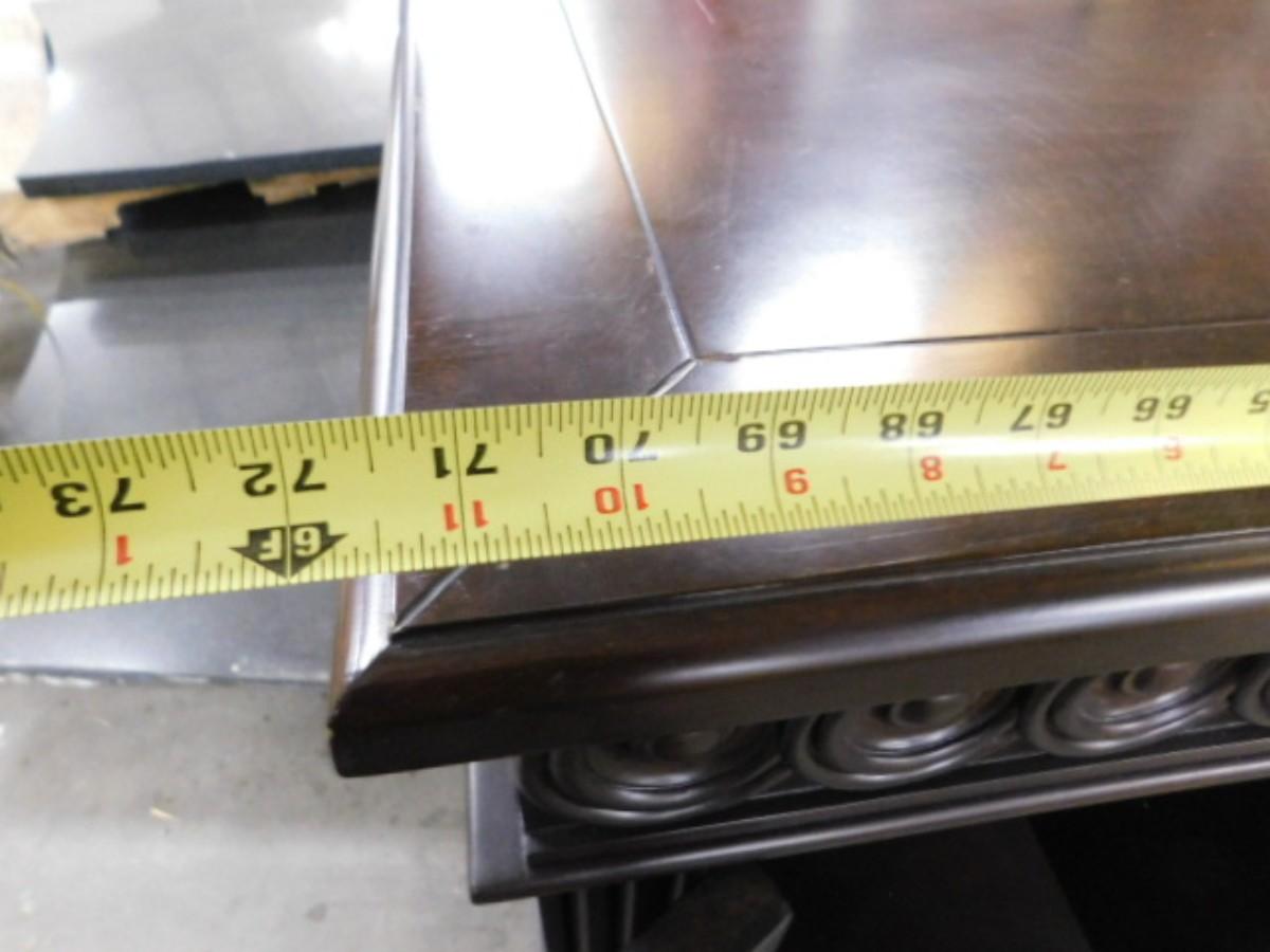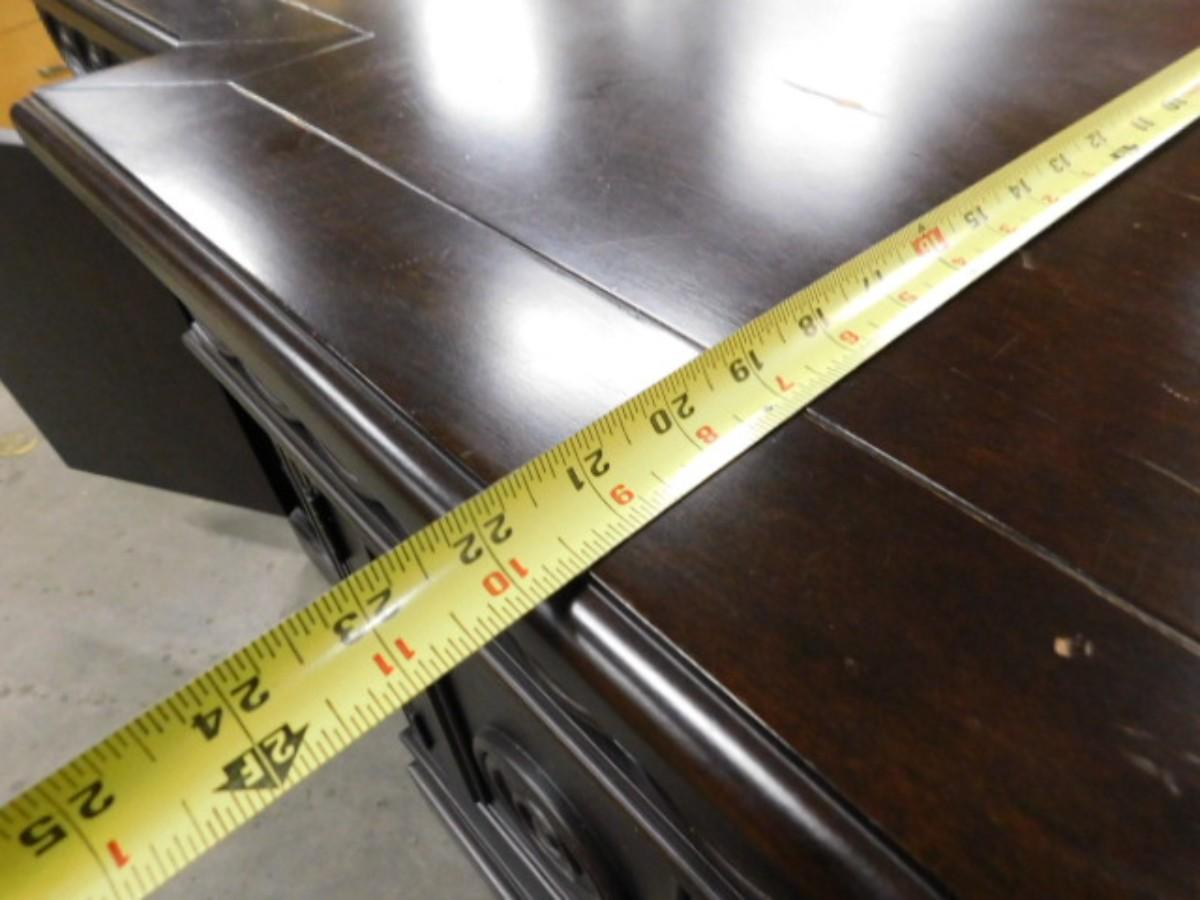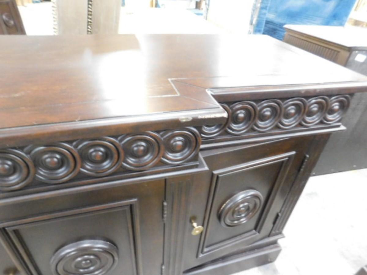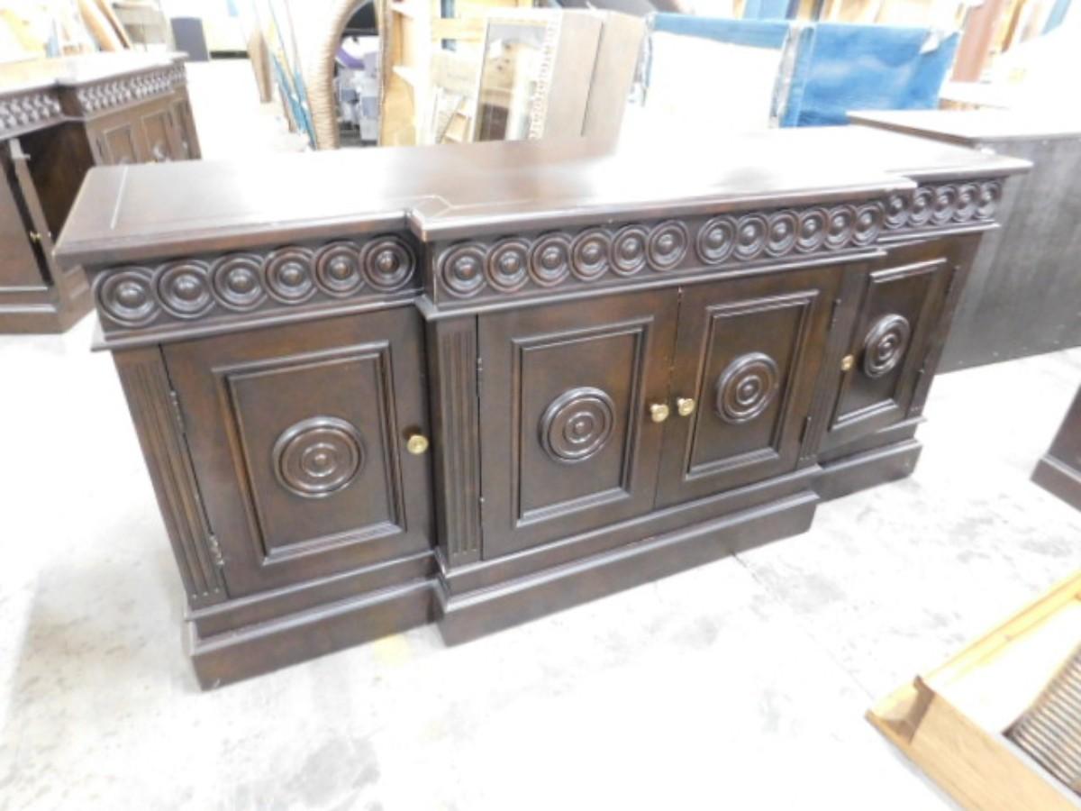 Step Front Sideboard Mahogany Finish with Shelved Cabinets Choice B. Has one shelf per compartment. Needs shelf pins. Has some scratches on top surface and front. Expect some wear or scratches to the finish. Shipping option available via freight or local mover at Buyer's expense. Buyer must have all shipping scheduled within the stated dates and times of pickup. Recommended local mover is Beaty Bros. Moving 828-201-2982