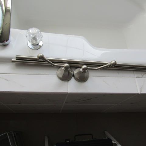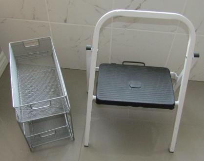 STEP STOOL AND BRUSHED SILVER TOWEL BAR