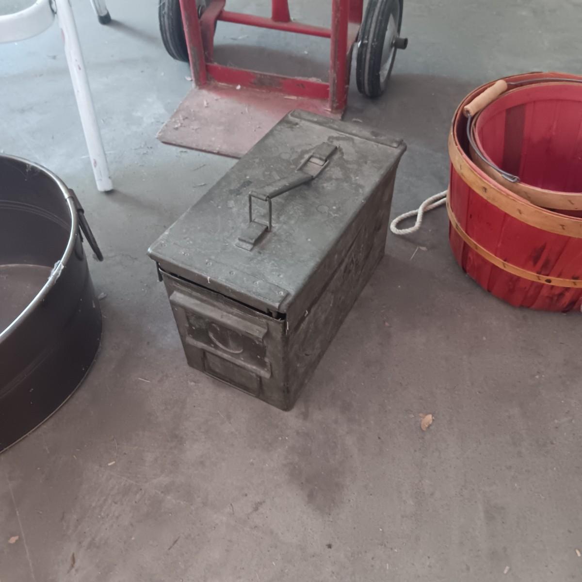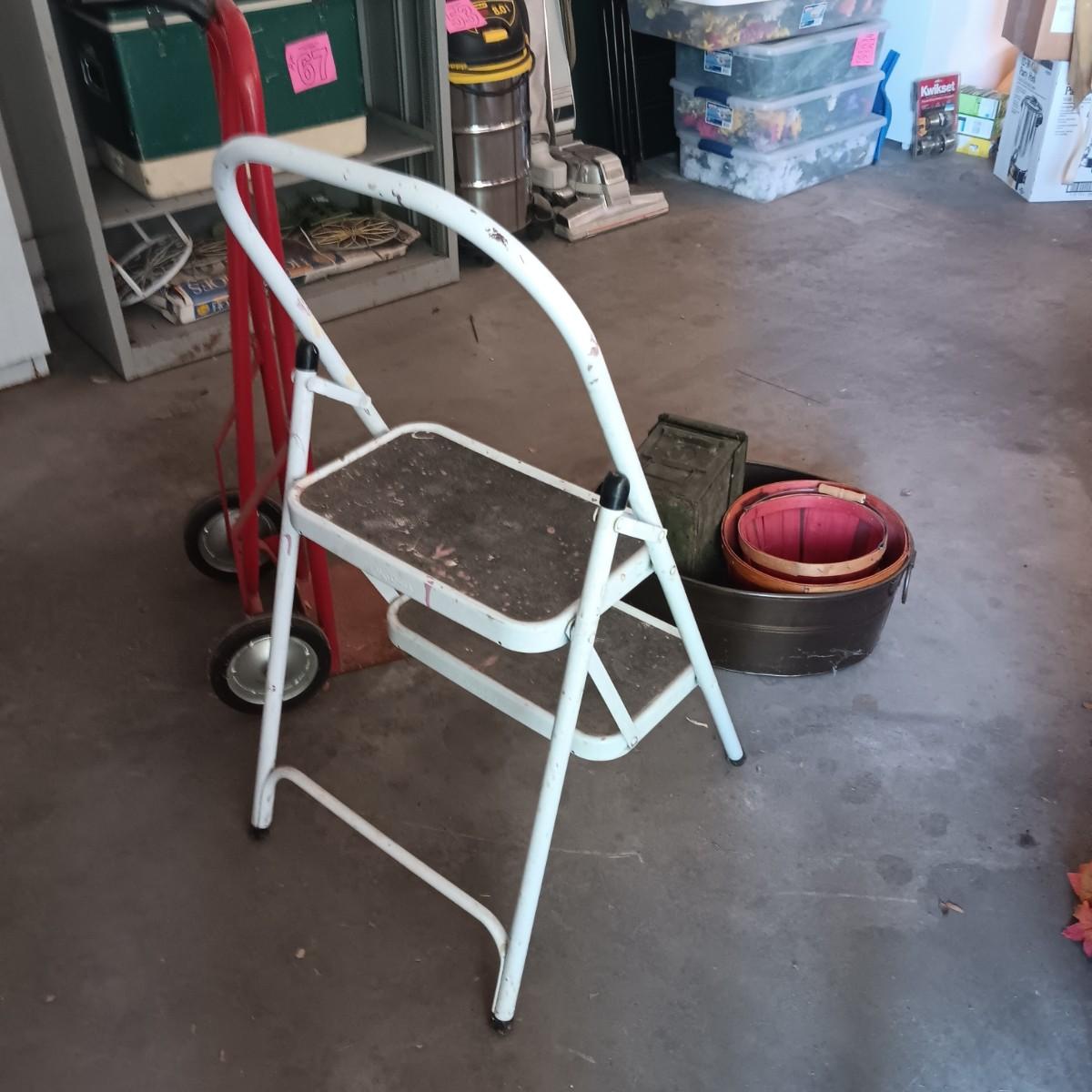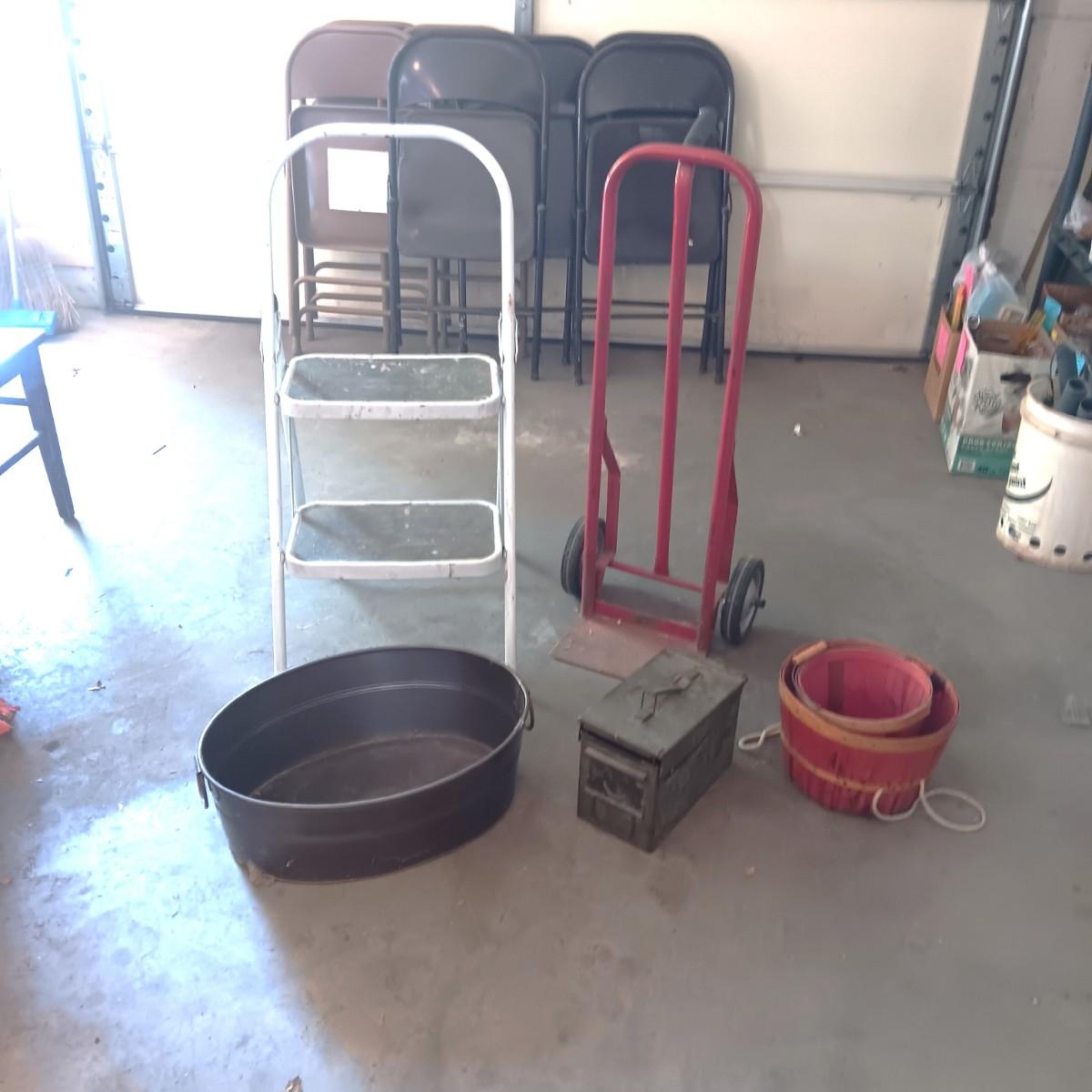 STEP STOOL, SMALL DOLLY, AMMO BOX, METAL TUB AND 2 BUSHEL BASKETS