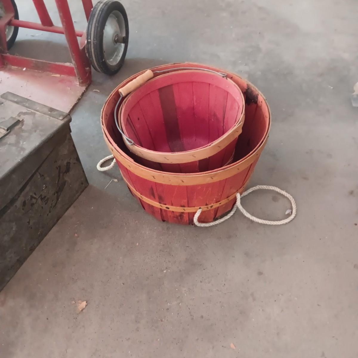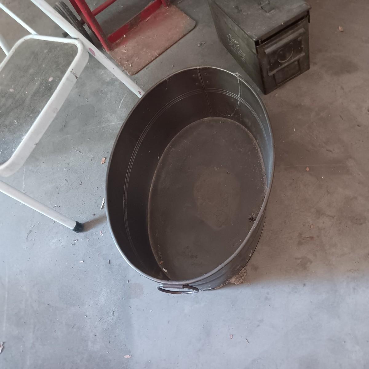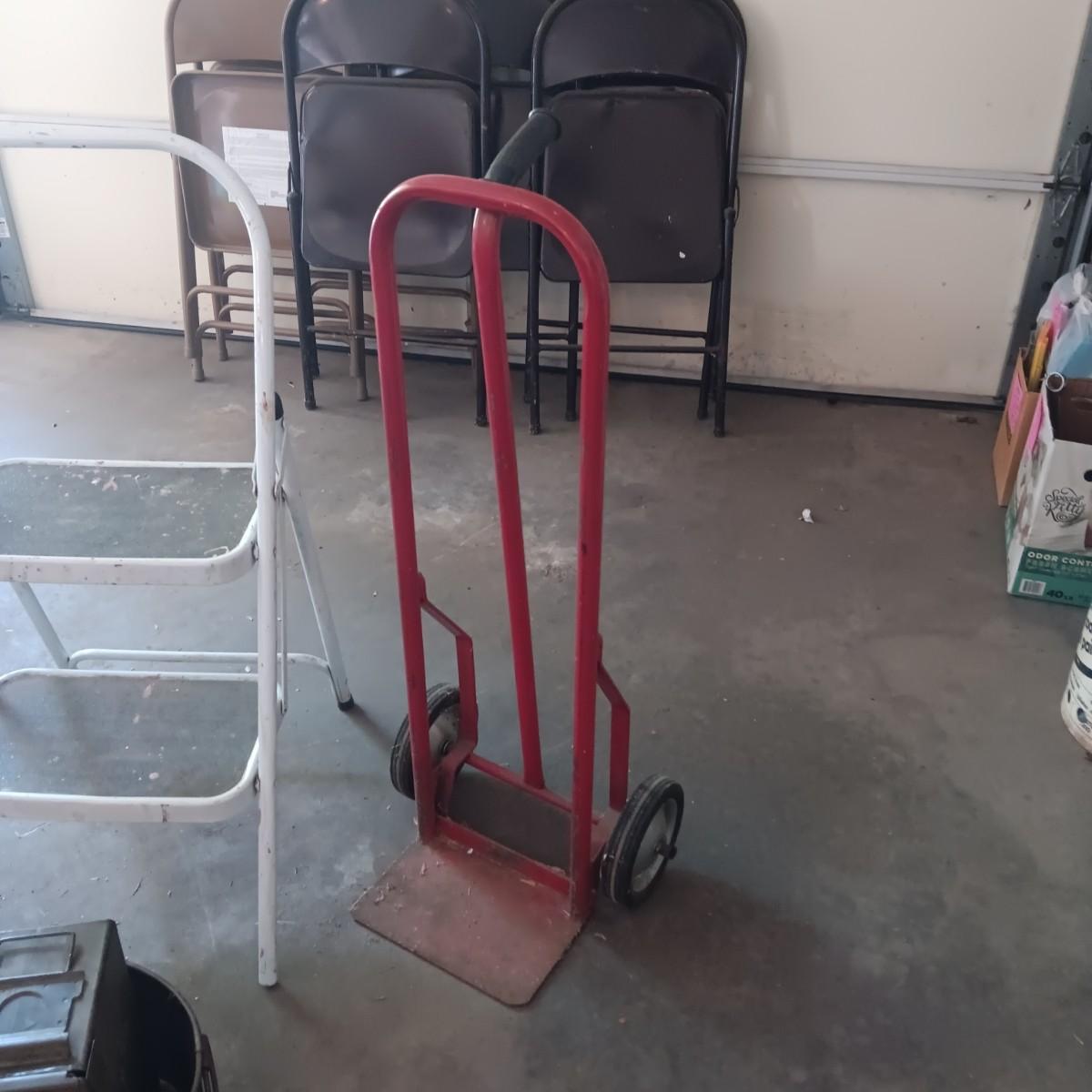 STEP STOOL, SMALL DOLLY, AMMO BOX, METAL TUB AND 2 BUSHEL BASKETS