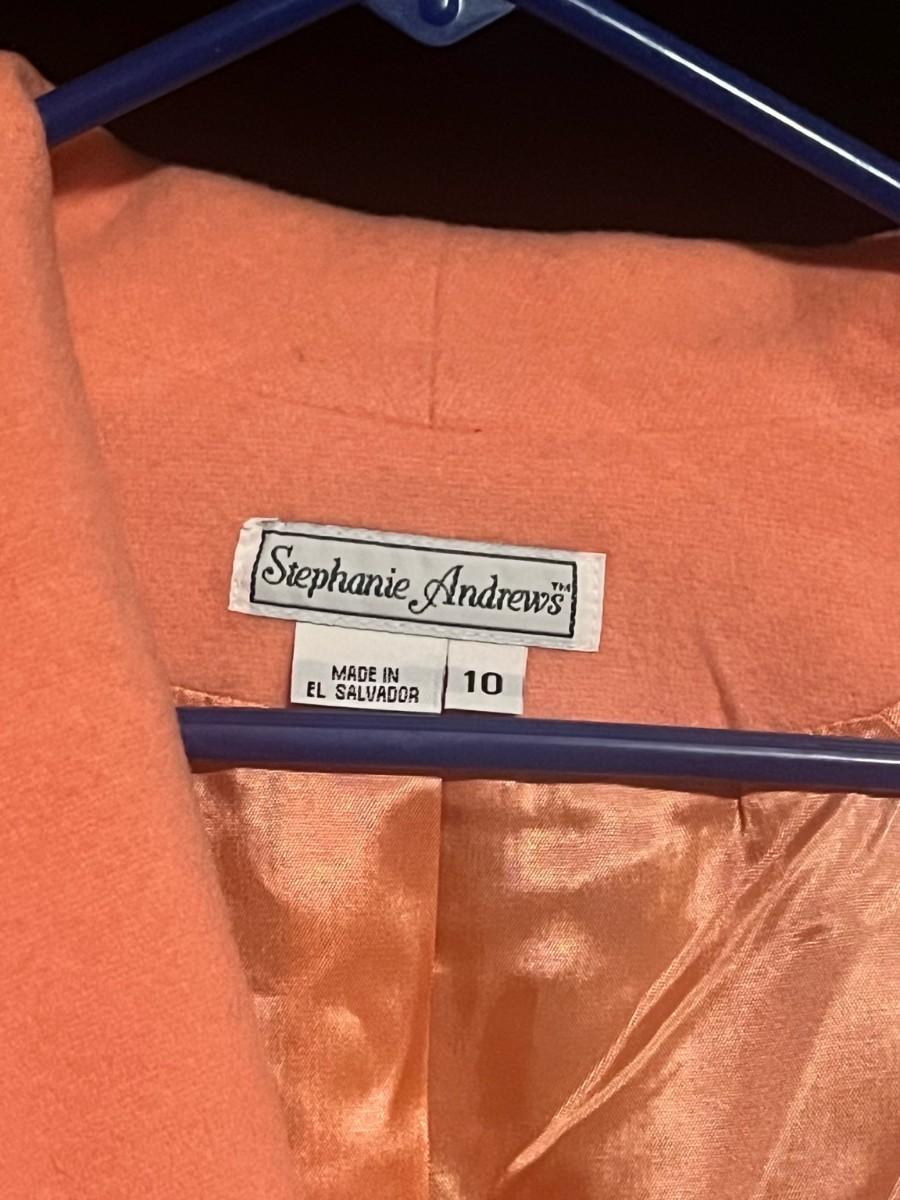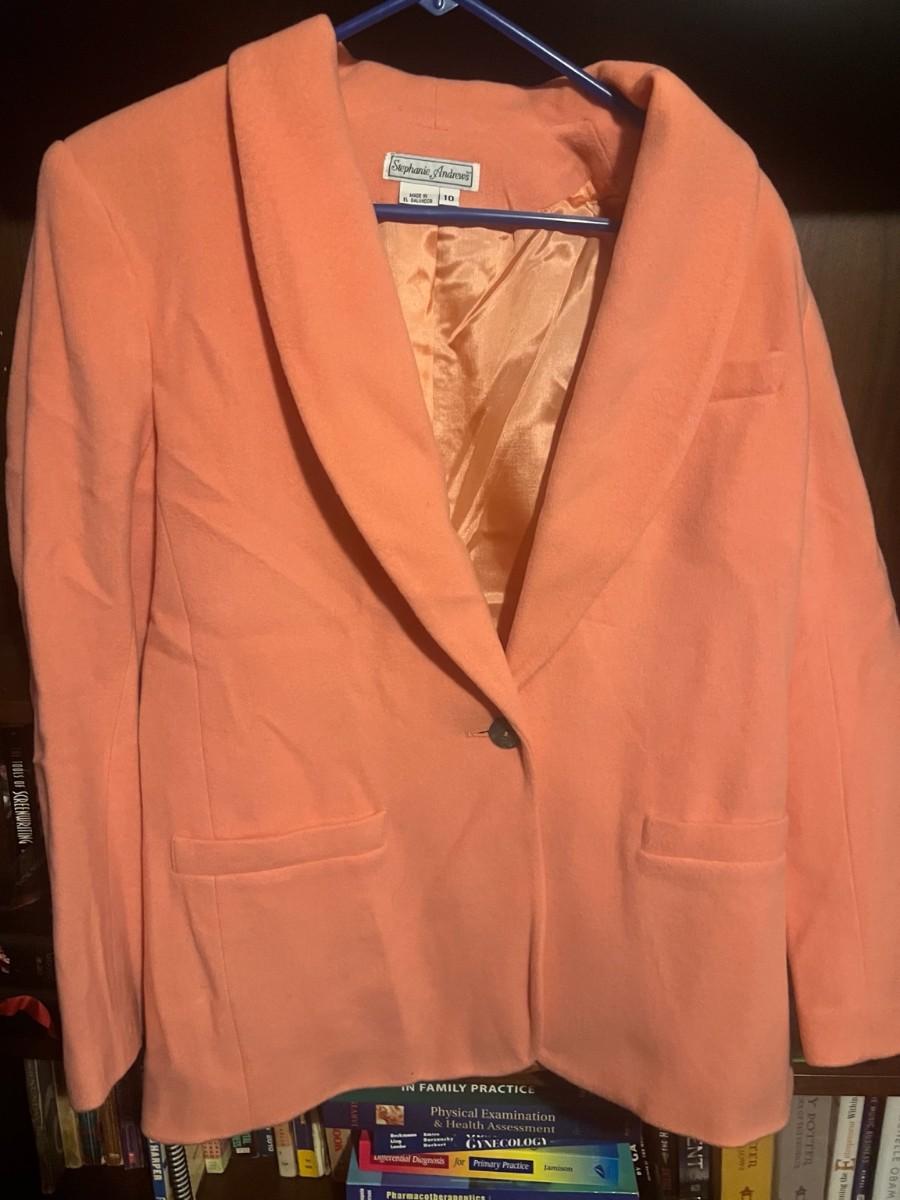 Elegant vintage-style women’s blazer by Stephanie Andrews, size 10, made in El Salvador. Features a soft peach color, single-button closure, satin lining, and classic tailored silhouette. A great wardrobe addition for spring fashion, office wear, or retro styling. Clean condition with light wear consistent with age.