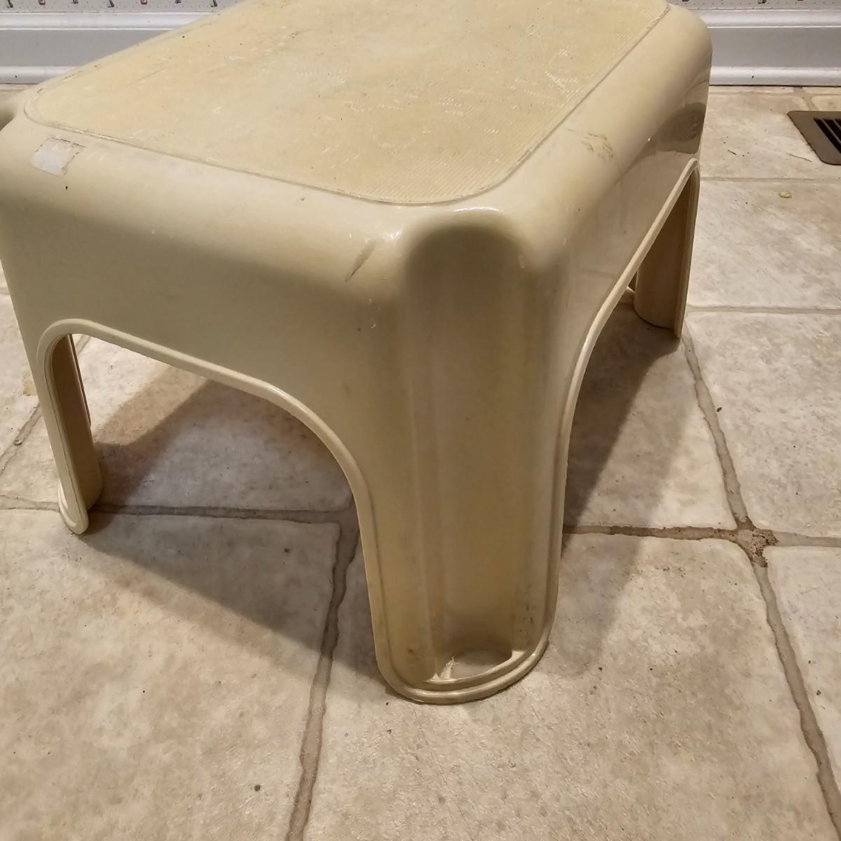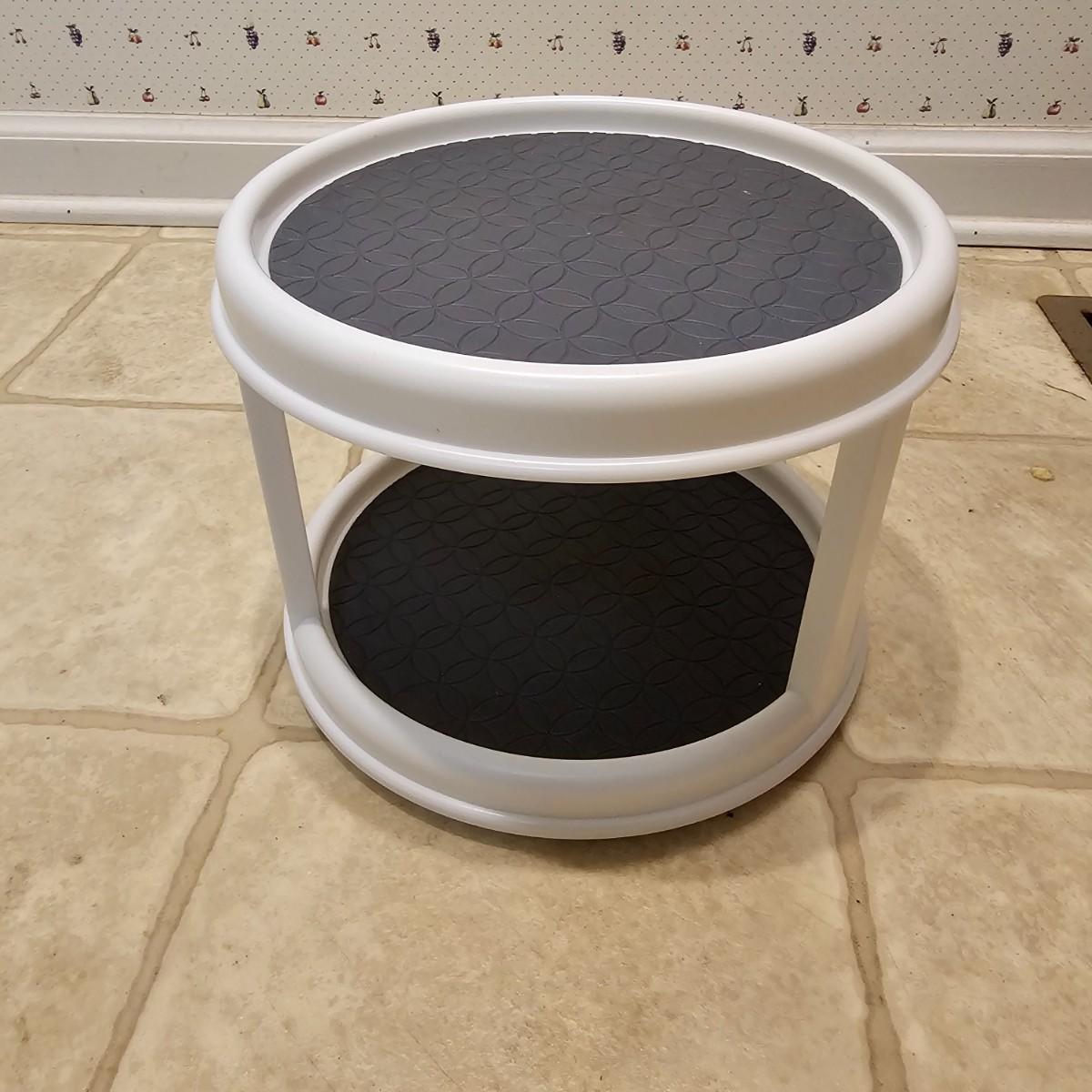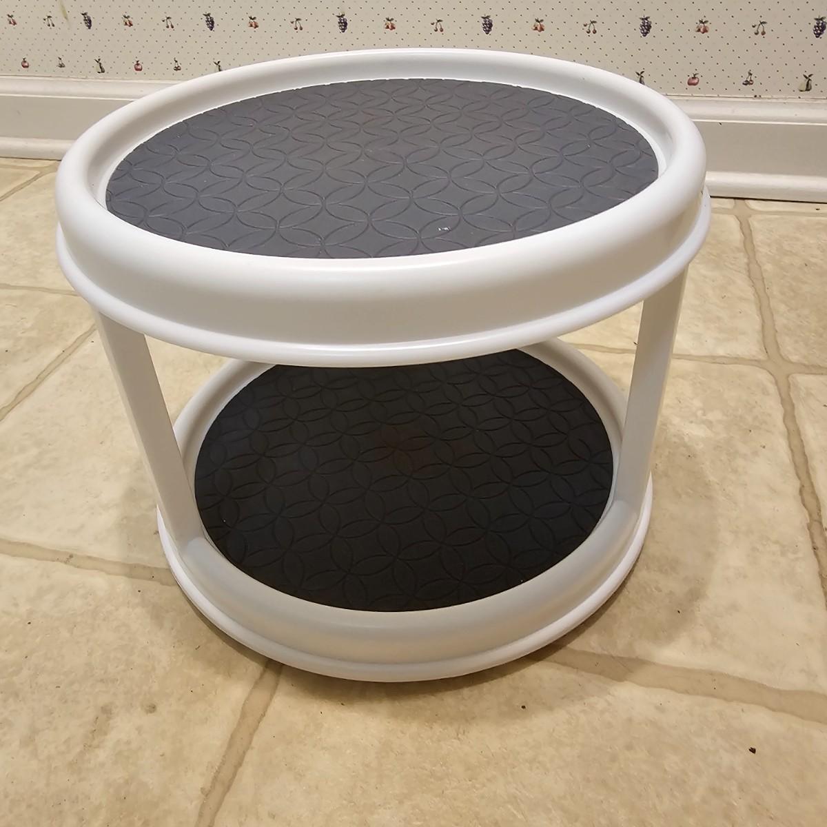 Set of white plastic shelves with four shelves and a top. Measures 15" x 17" x 47"H. One step stool with seat and back, 17" x 16" x 33"H. Short tan step, 12" x 15" x 9"H. Folding green step, 9" x 11" x 9"H open, folds to 2" thick. Three plastic round lazy Susans, 12"D. One double decker lazy Susan, 9.5"D x 7"H. All lazy Susans have rubber/grippy inserts. See photos for details. Local pickup only.