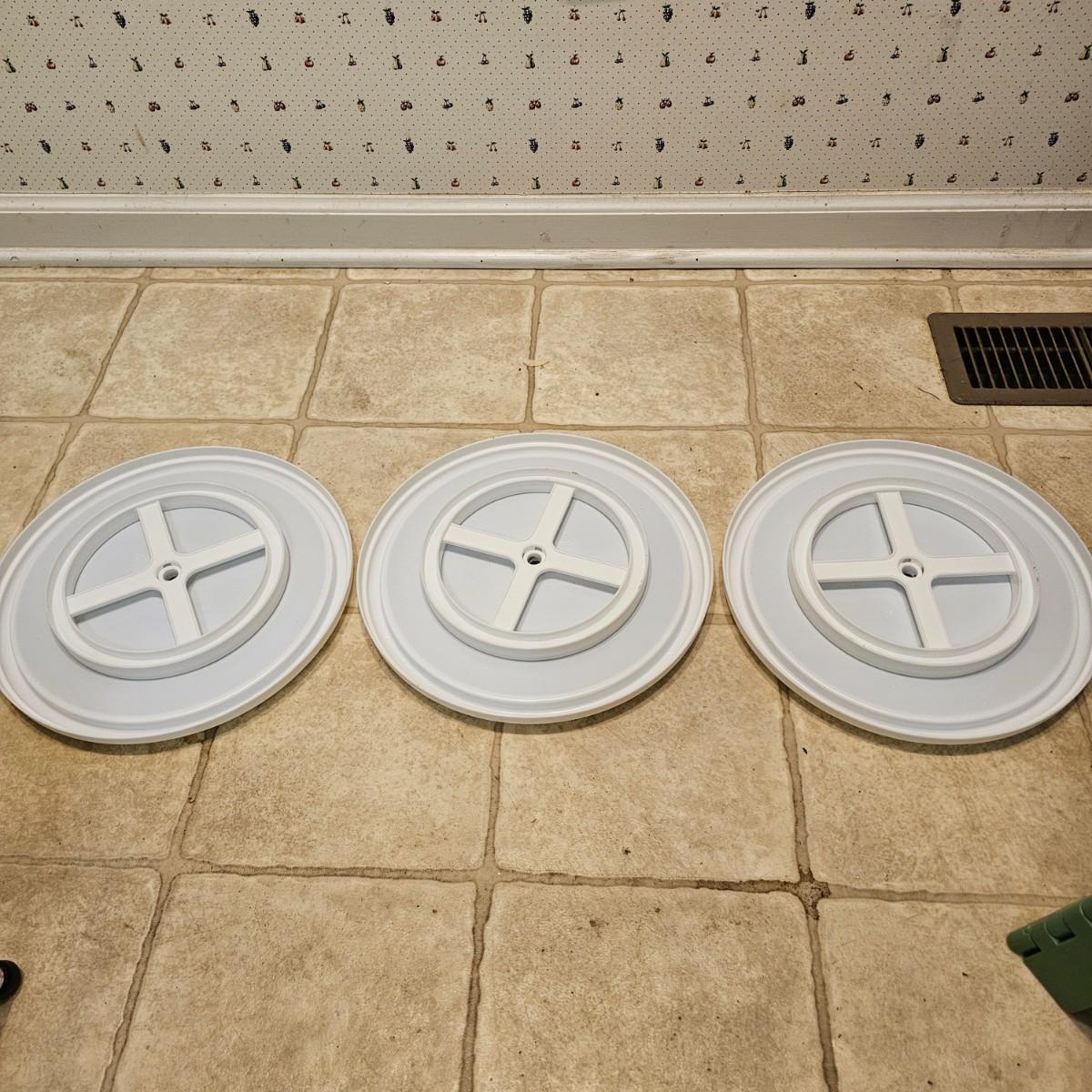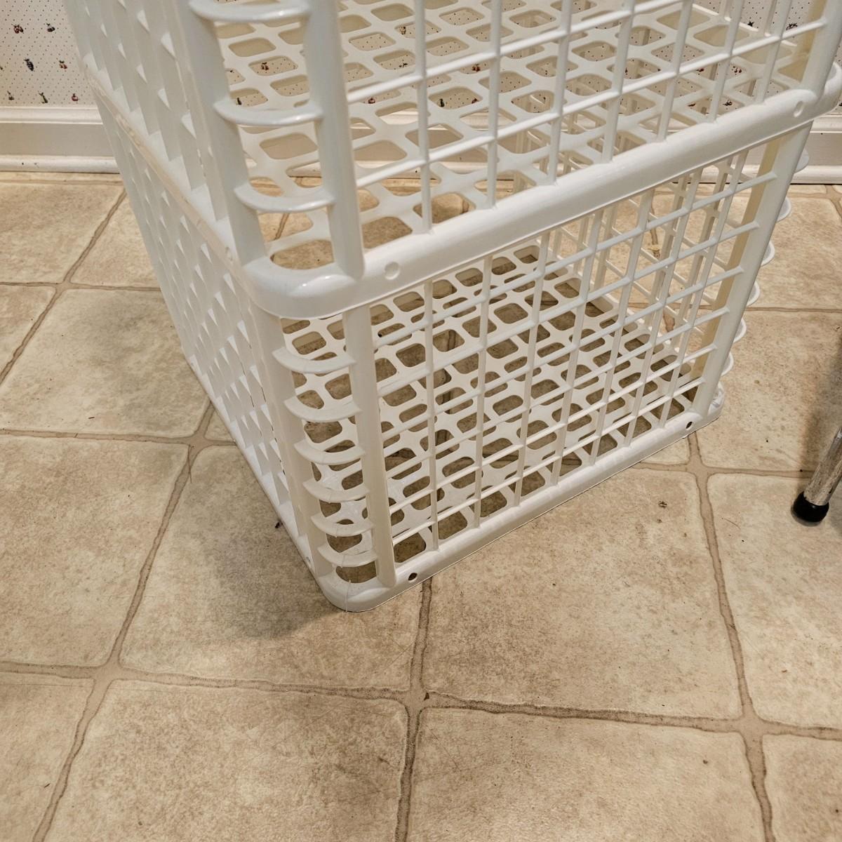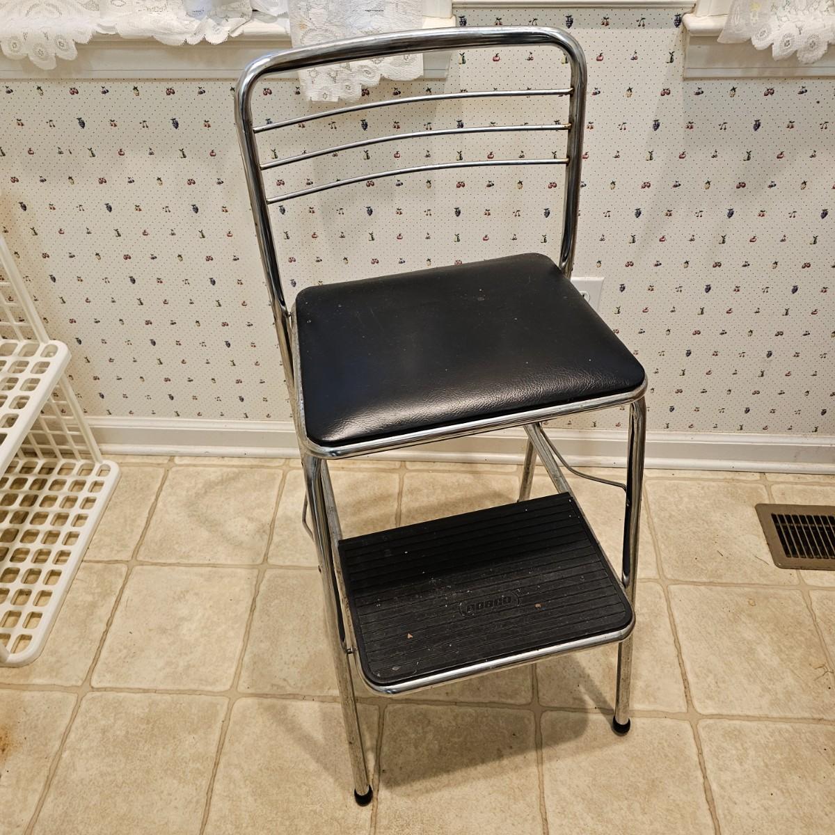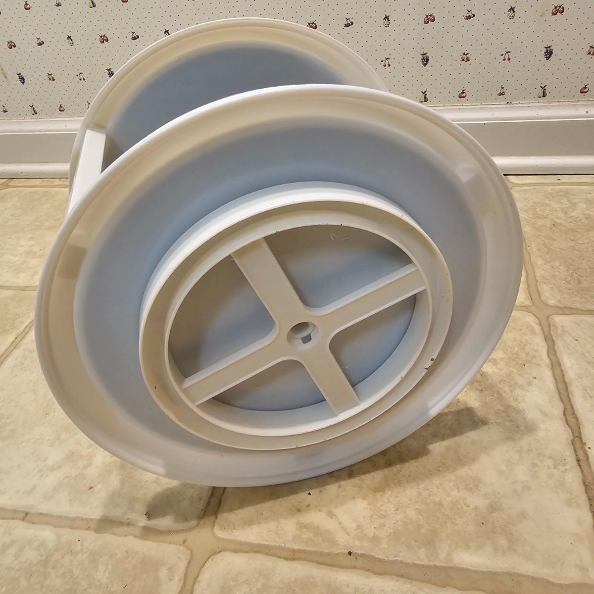 Set of white plastic shelves with four shelves and a top. Measures 15" x 17" x 47"H. One step stool with seat and back, 17" x 16" x 33"H. Short tan step, 12" x 15" x 9"H. Folding green step, 9" x 11" x 9"H open, folds to 2" thick. Three plastic round lazy Susans, 12"D. One double decker lazy Susan, 9.5"D x 7"H. All lazy Susans have rubber/grippy inserts. See photos for details. Local pickup only.