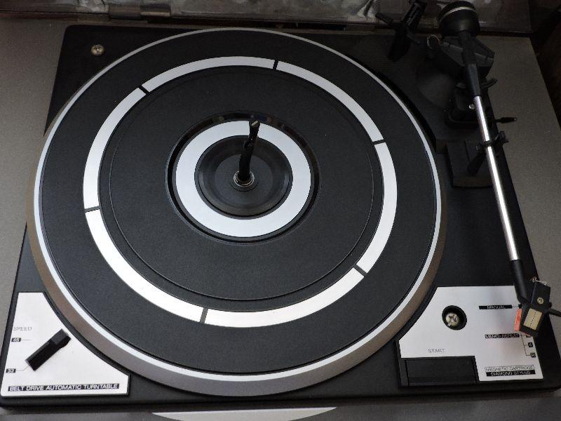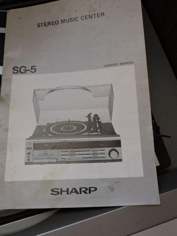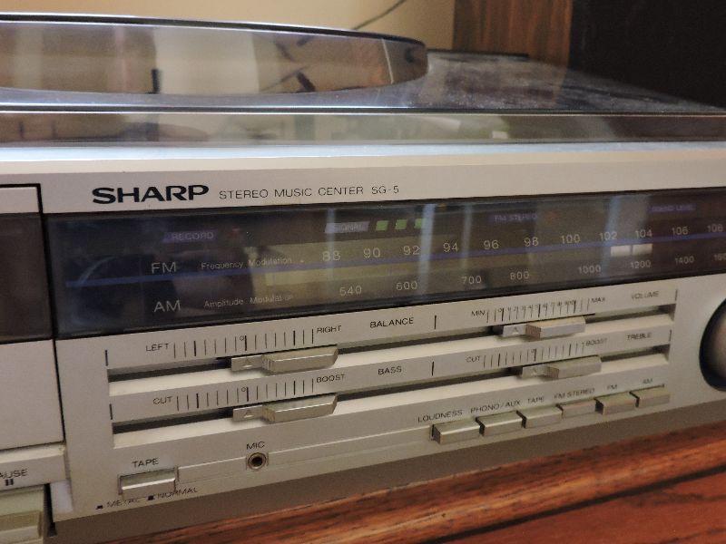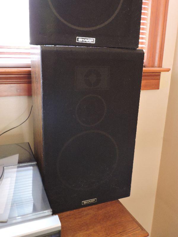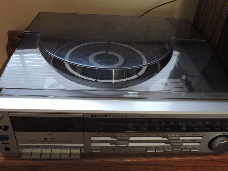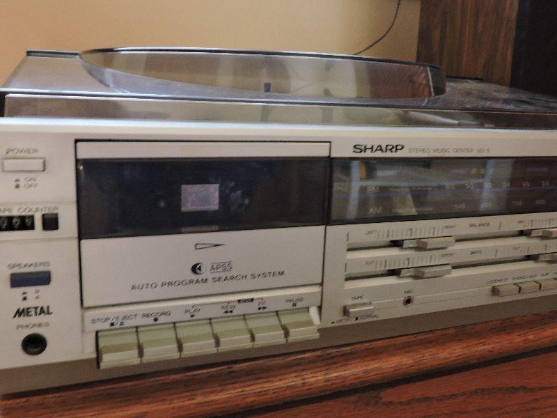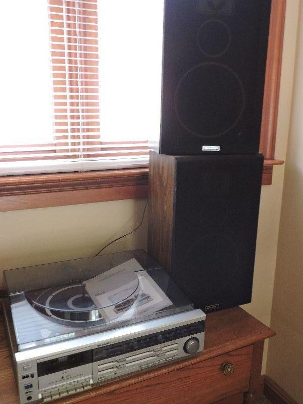 Sharp turntable with cassette player and AM/FM radio. Two speakers included. Untested.. Please read Terms and Conditions before placing a bid. Pick up is Friday, October 25th between 4 and 7, and Saturday, October 26th between 9 and 1. Props included in photos are not included in listing. All measurements are approximate. Comes from home with cats.