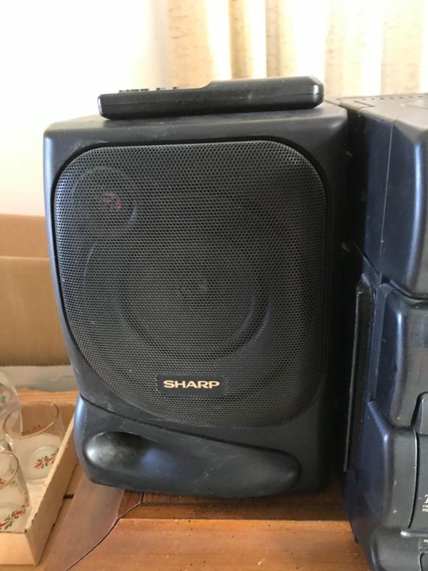 Sharp GX-CH150 Boombox Stereo System. Dual CD, dual cassette, AM/FM radio. Detachable speakers and remote control. Has a handle to make transport easy.