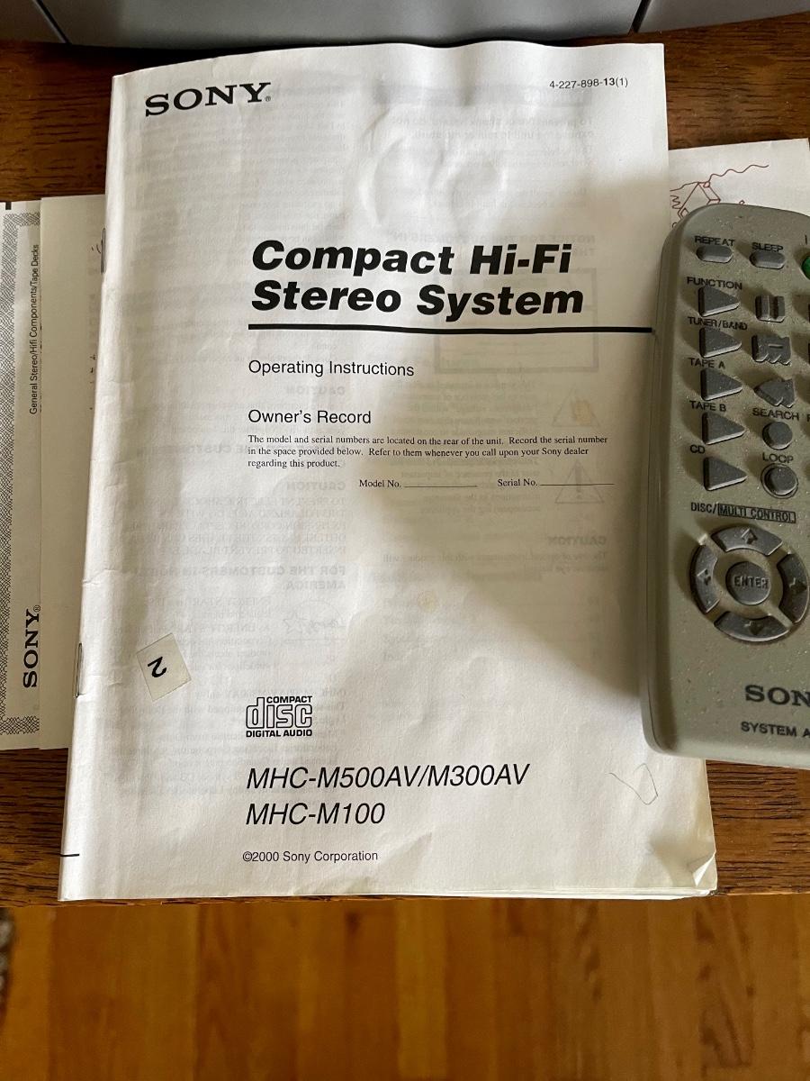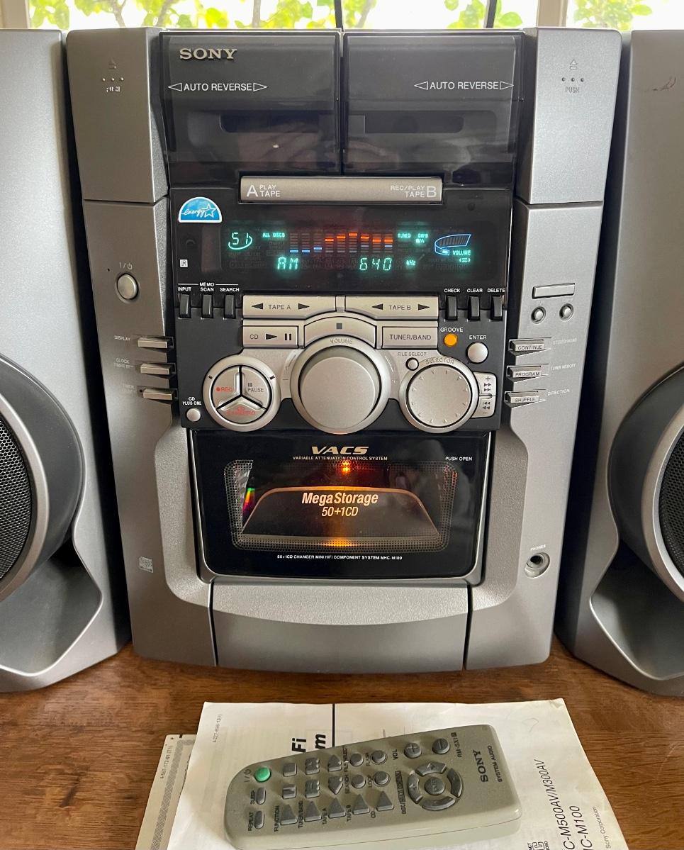 Sony Bookshelf Stereo, Compact Hi Fi Stereo System Model MHC-M100. AM-FM-Cassette-CD. Holds 50 CDs., 2 cassette tape decks. Has remote control. Tested, works well.