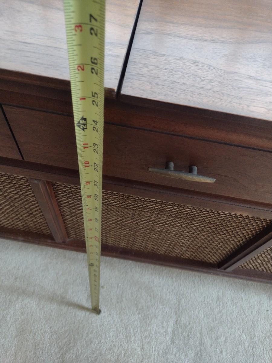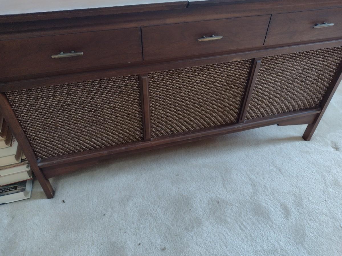 Mid Century Modern Design Arvin Stereo Turntable Console turns on and tunes in. Speakers have some static and has tube hum. Turntable tested and appears to be in working condition.