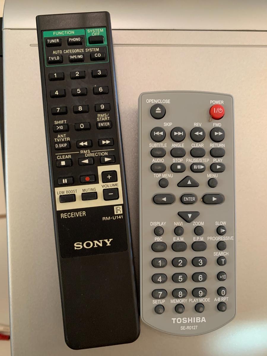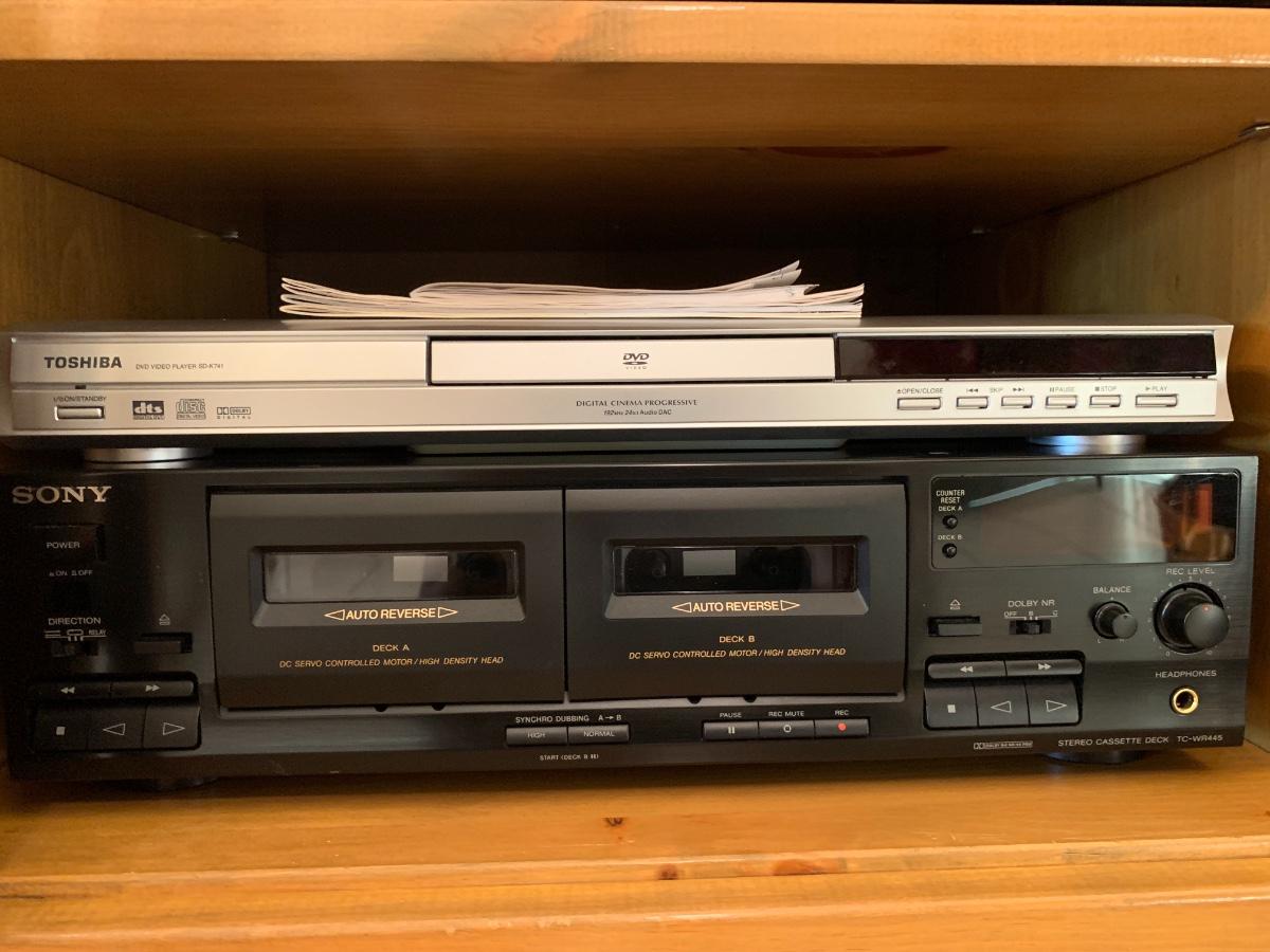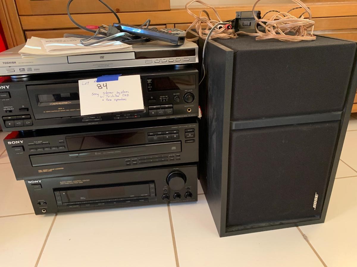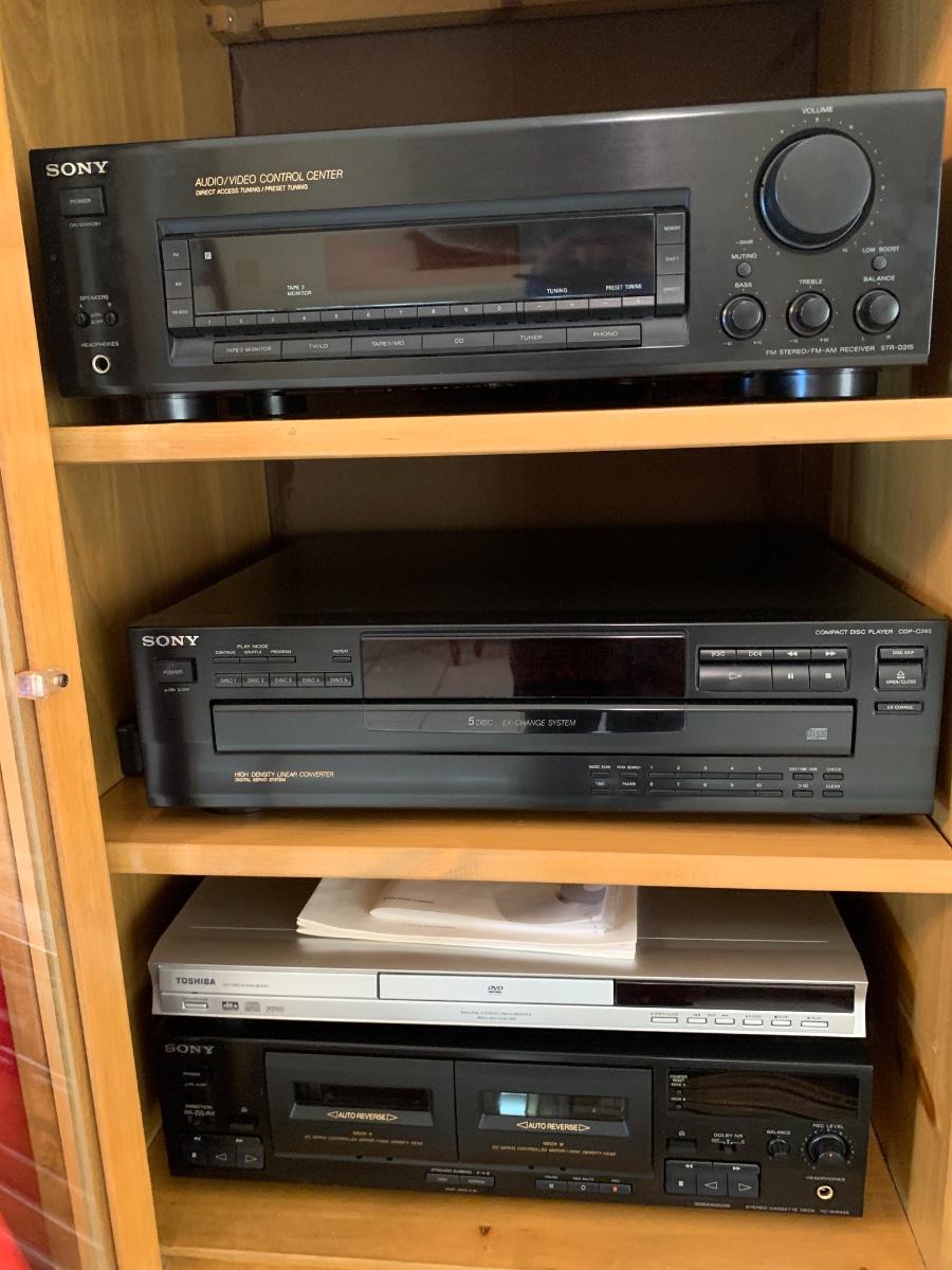 Sony AV control center, Sony Hi-dens 5 disc player, Toshiba DVD (not blu ray), Sony dual tape cassette deck. Also includes a pair of Bose speakers.