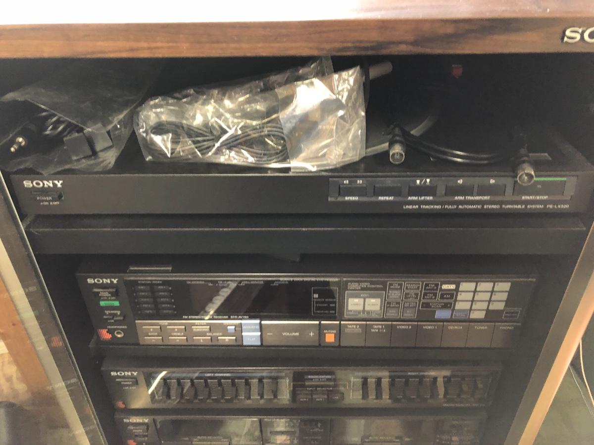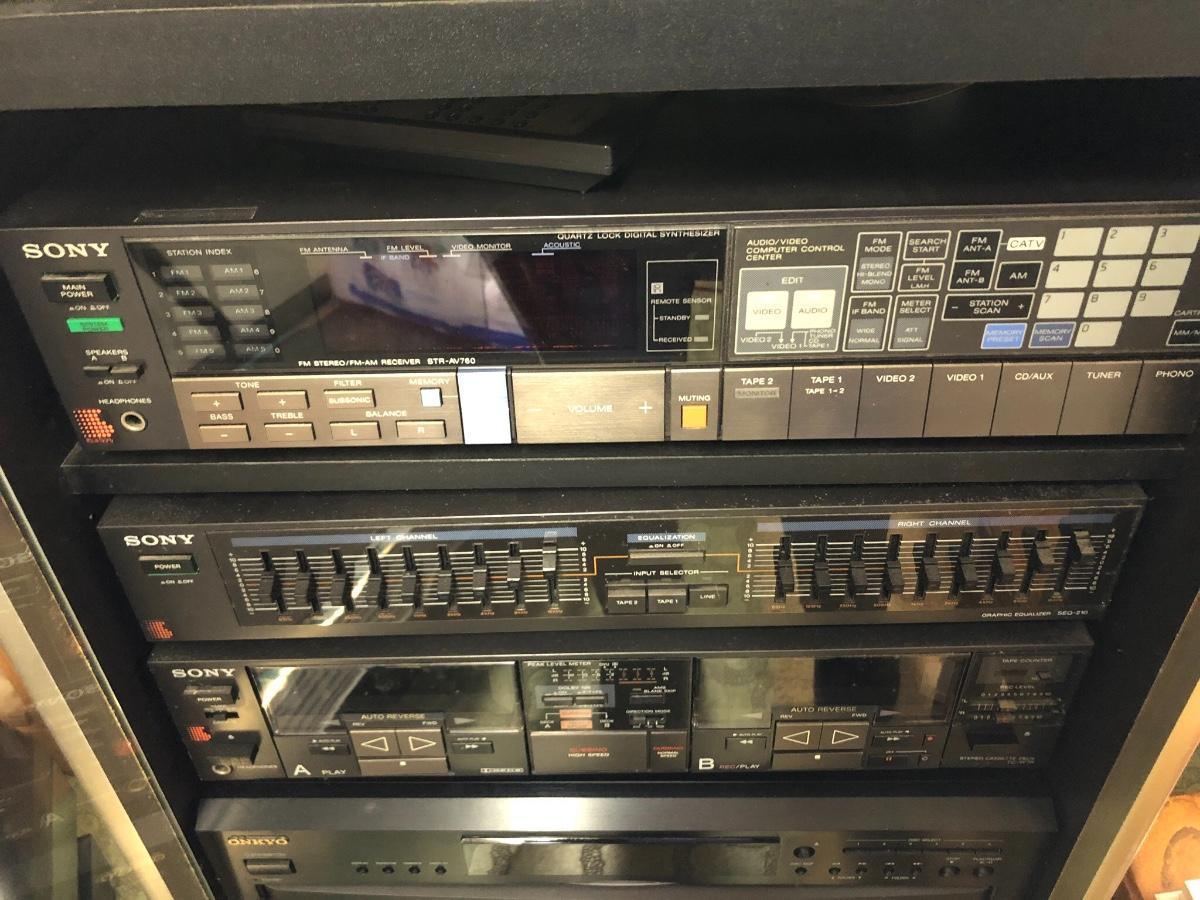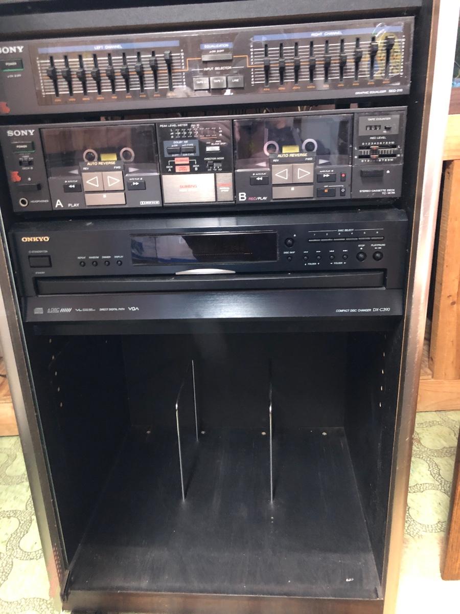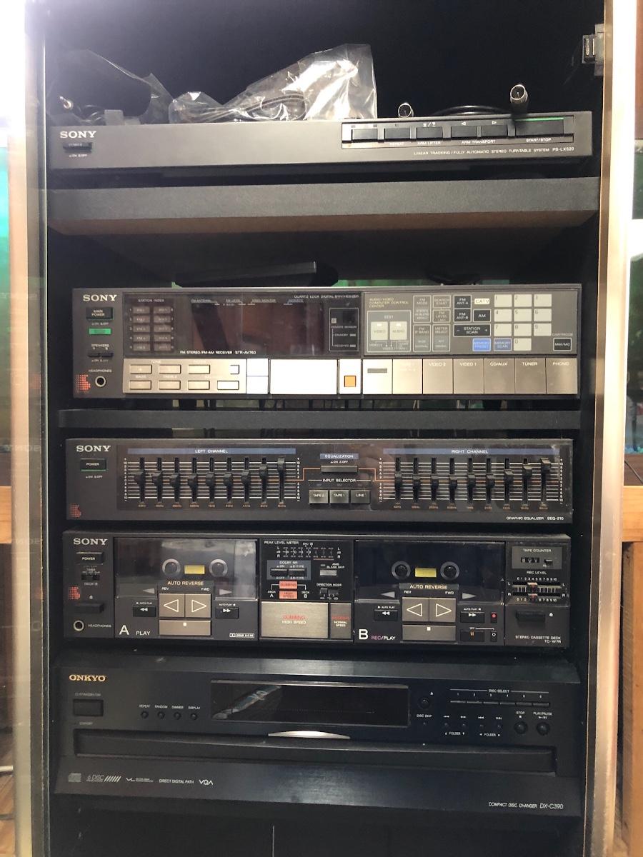 Sony Turntable, Sony Receiver STR-AV760, Sony Graphic Equalizer SEQ-210, Sony Stereo Cassette Deck TC-W7R, Onkyo 6 Compact Disc Changer DX-C390. Records are not included in this lot. Sold in separate lot.