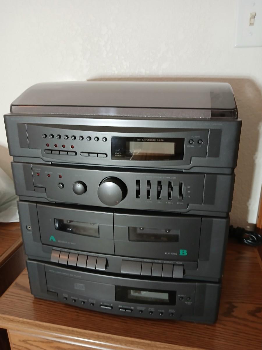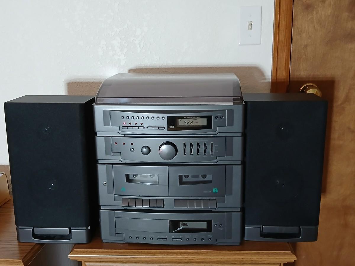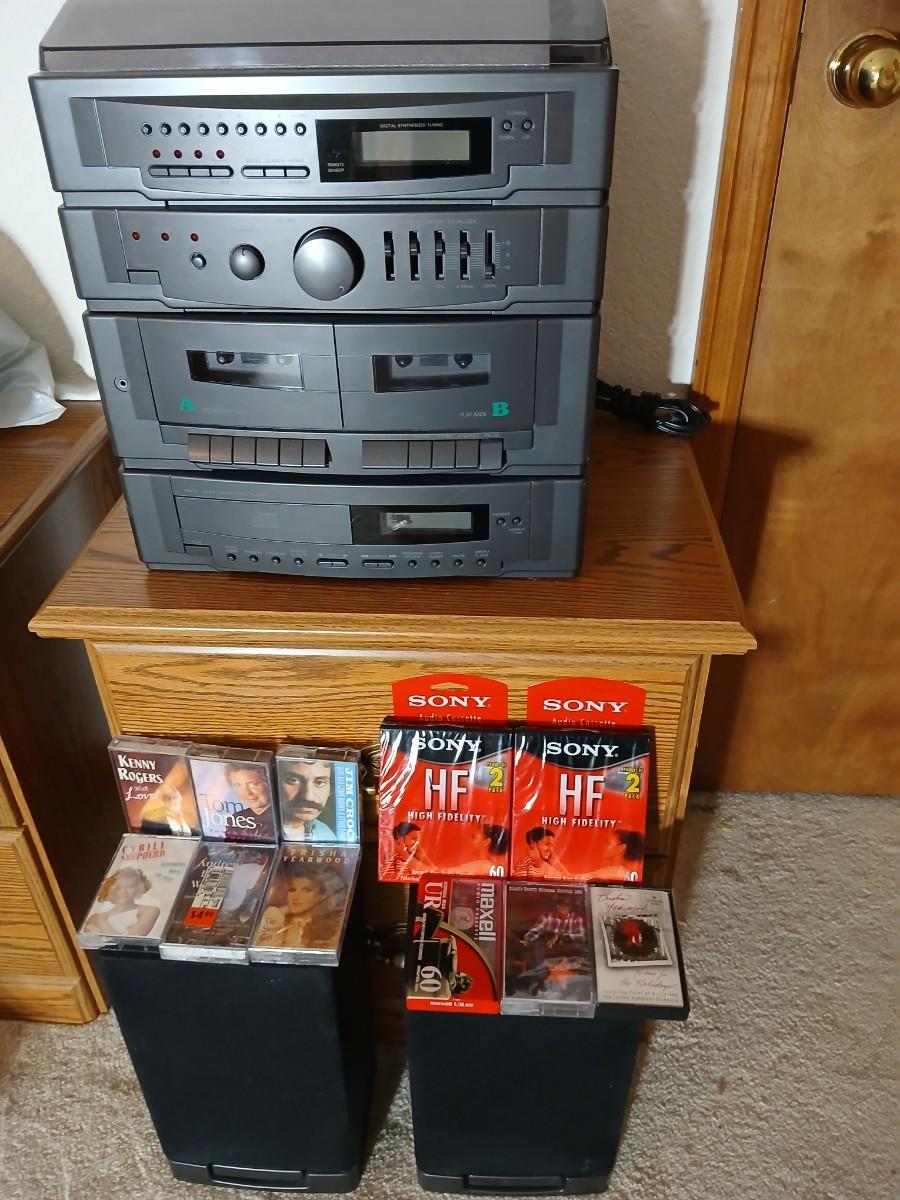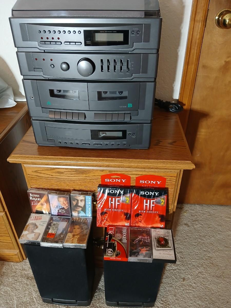 Stereo system CD player, Tuner, Dual cassette, Record player with 2 speakers and collection of cd's and cassettes Appears to have very little use