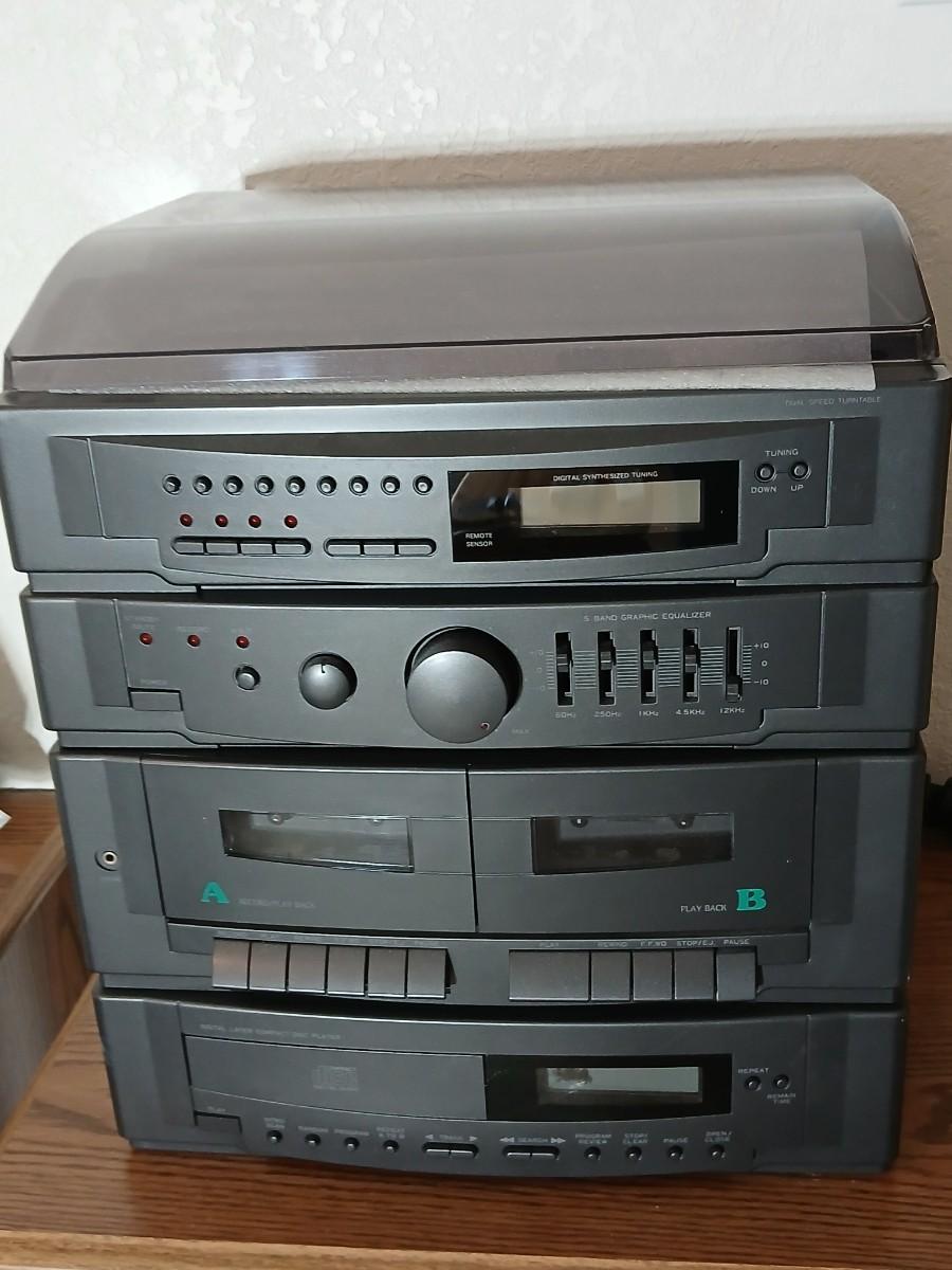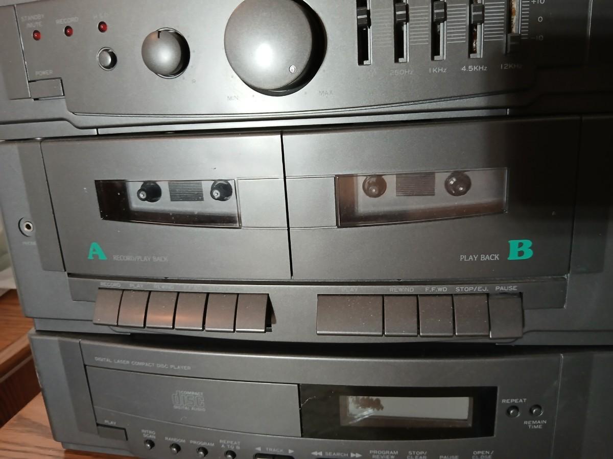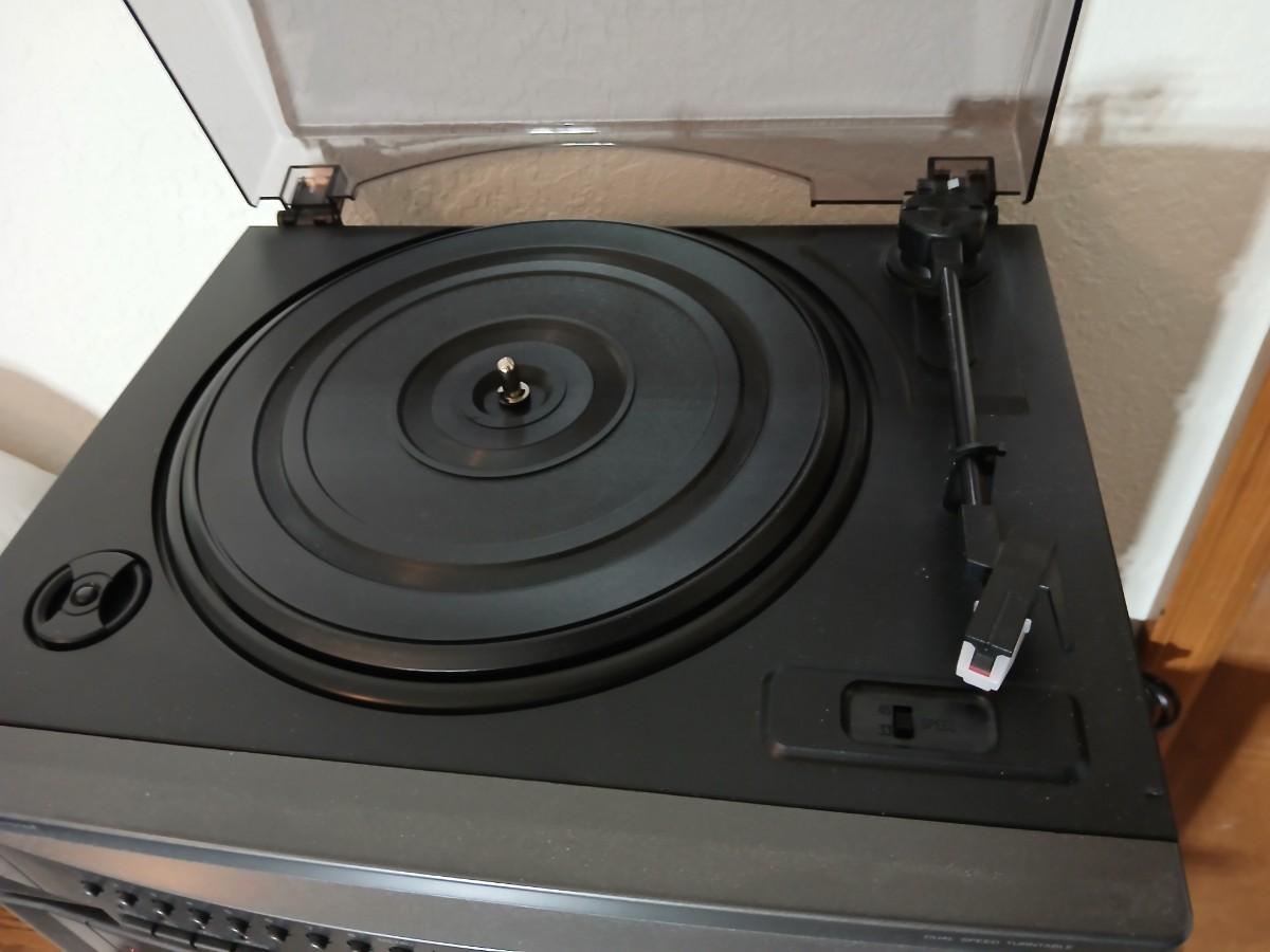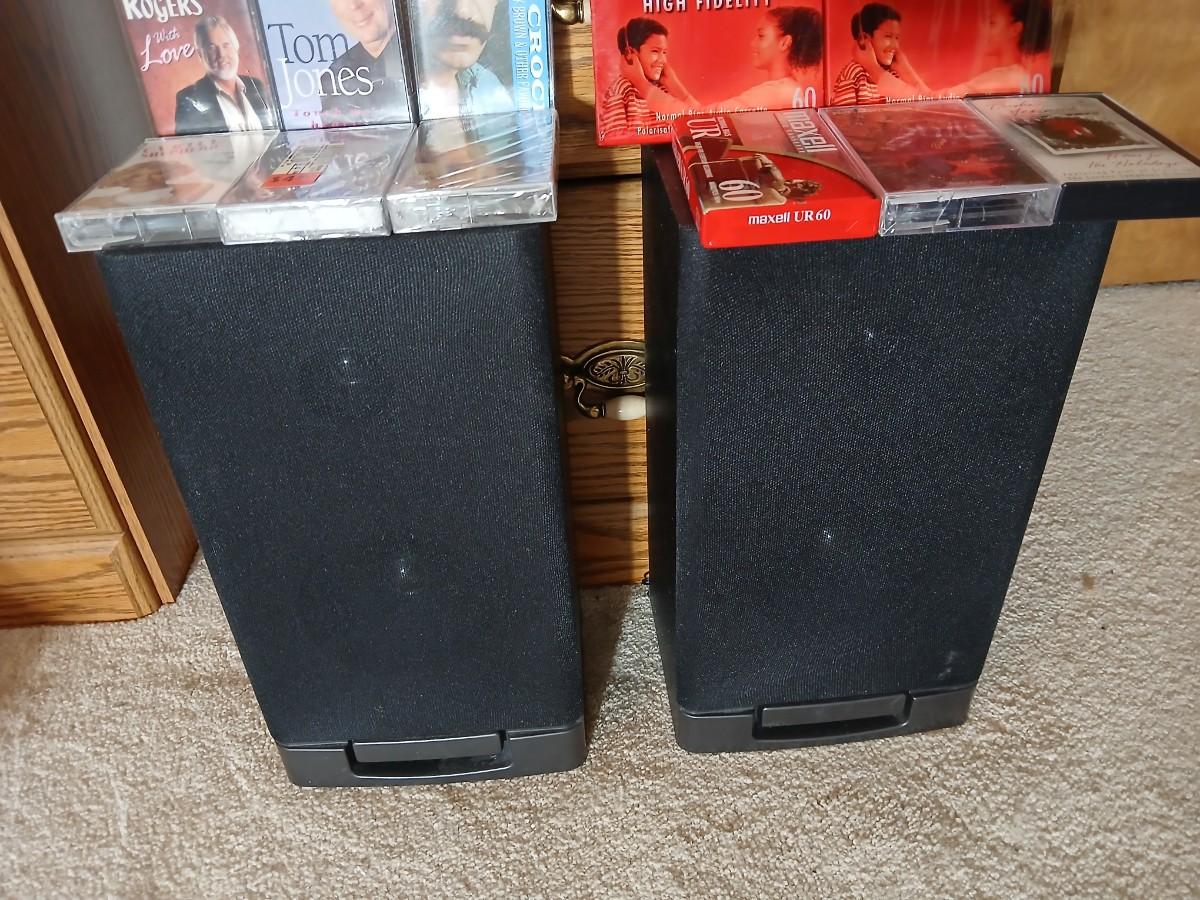 Stereo system CD player, Tuner, Dual cassette, Record player with 2 speakers and collection of cd's and cassettes Appears to have very little use