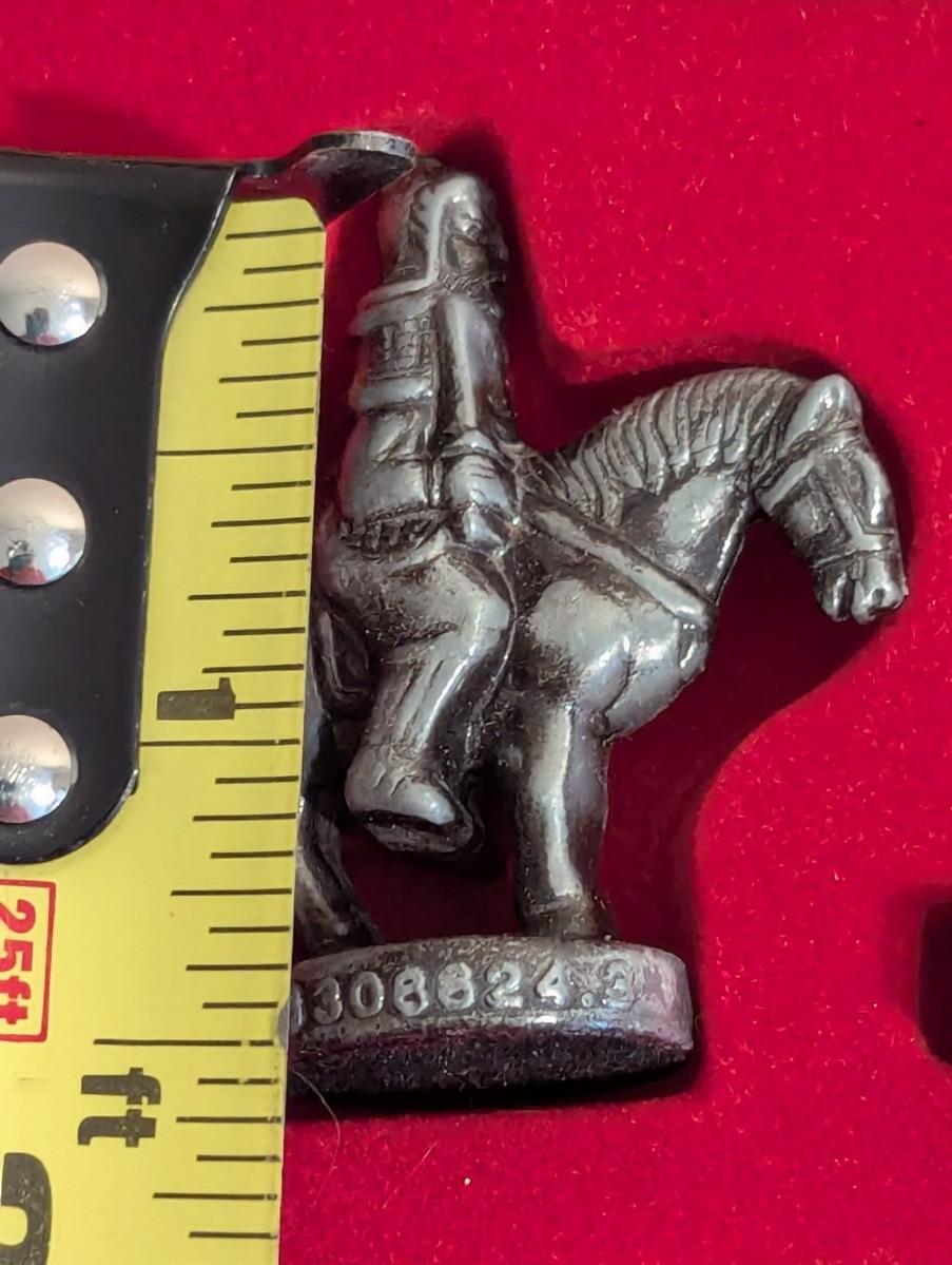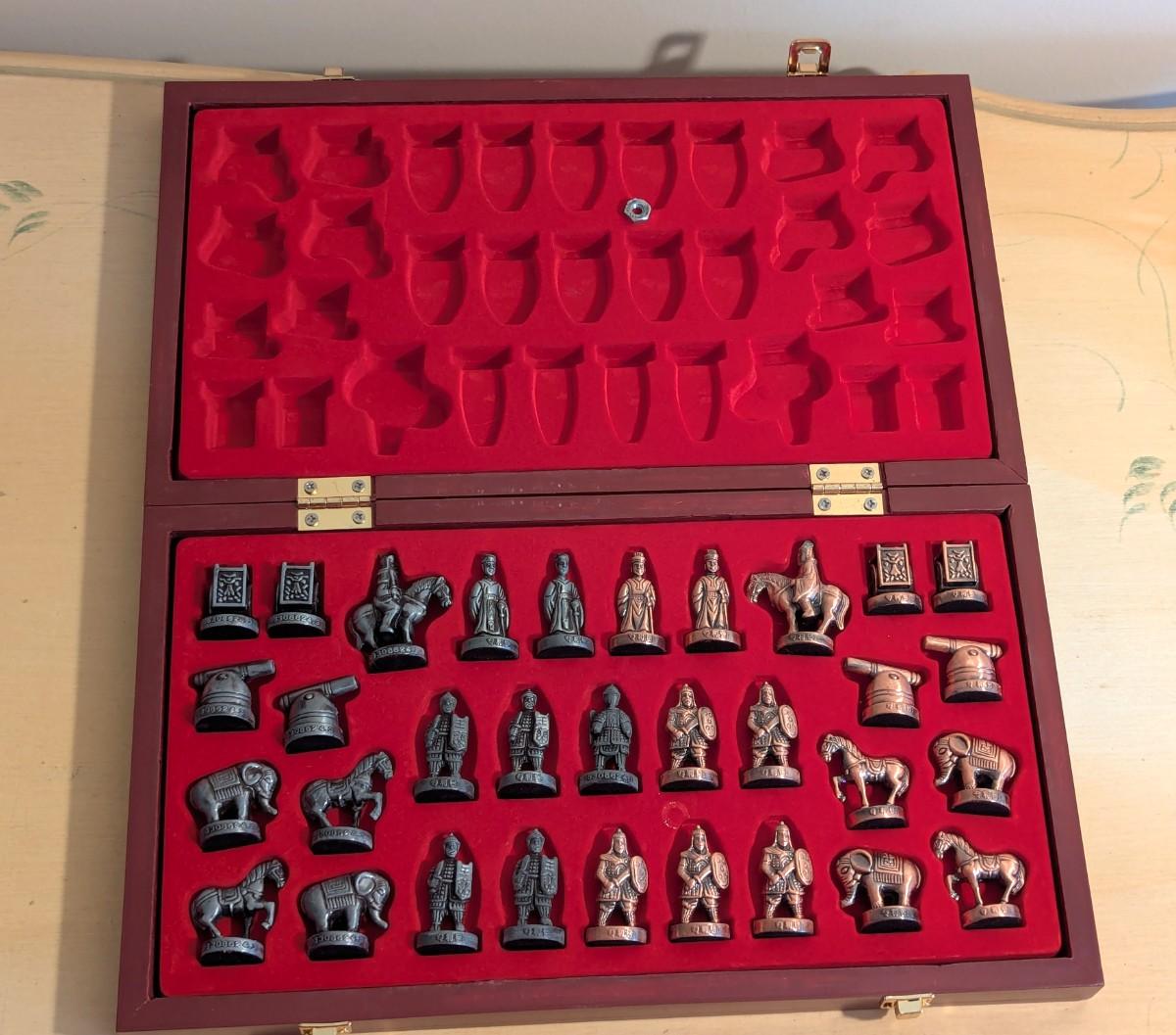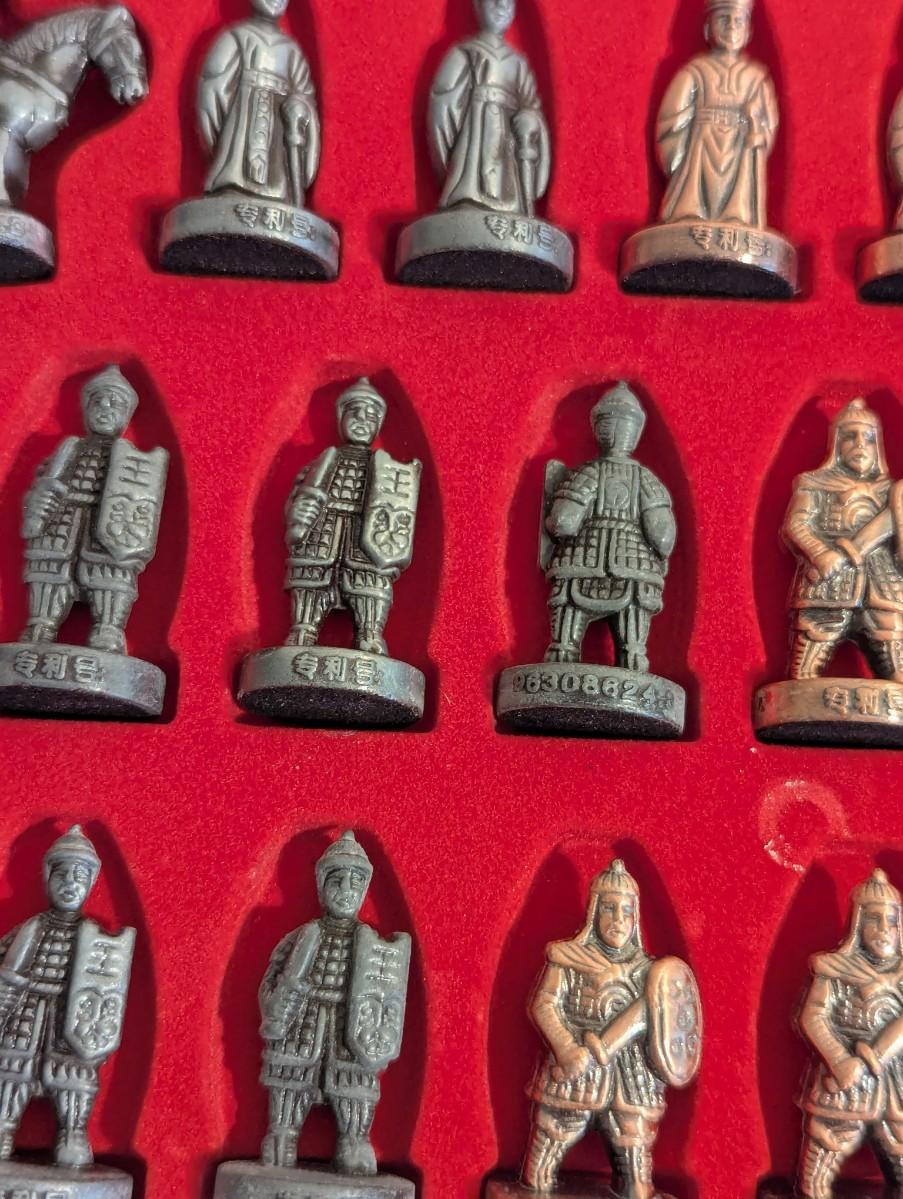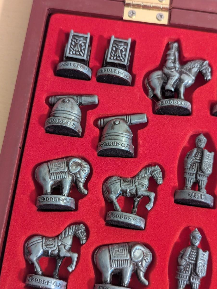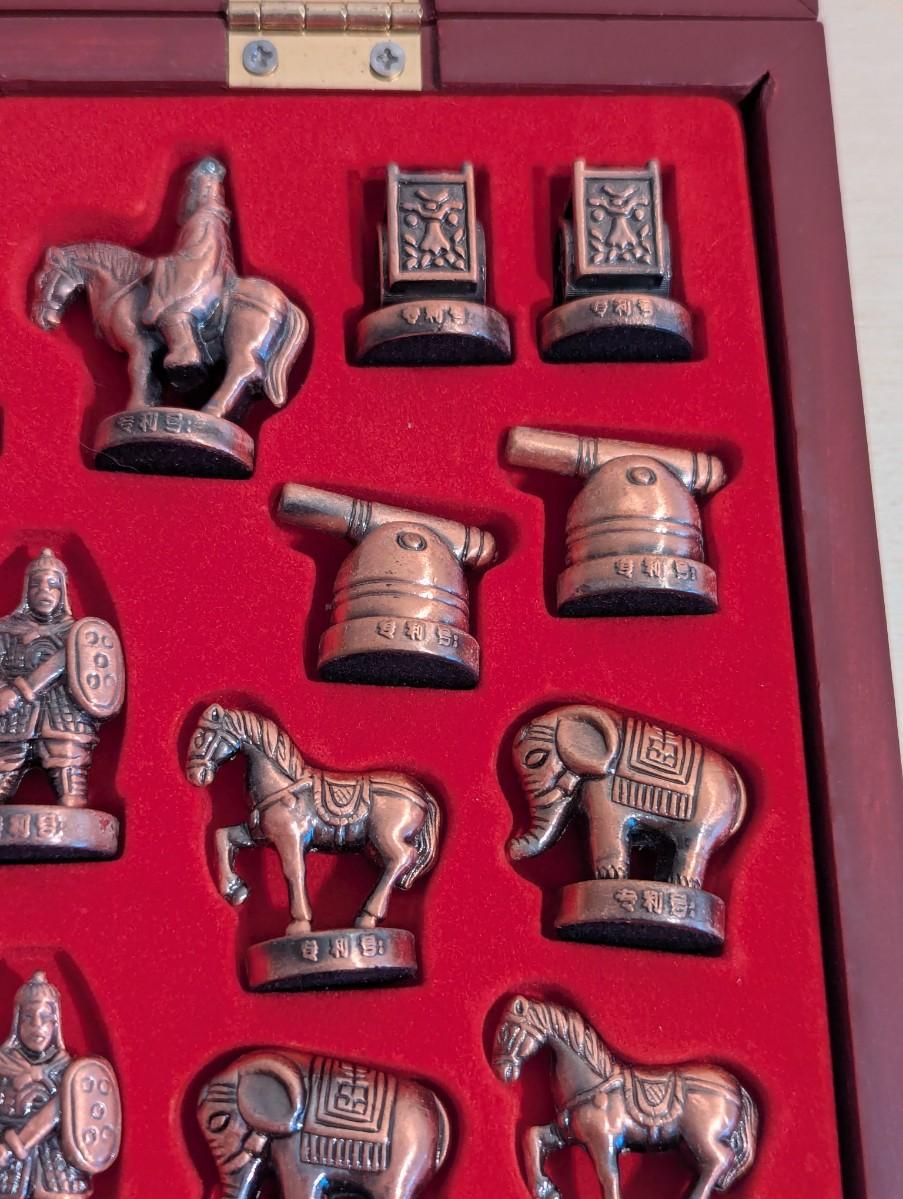 Stereoscopic Chinese Chess Double Hero Chinese Chess Set with copper and pewter pieces. In wooden box with playing board surface.