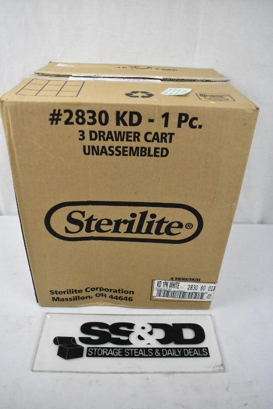 Sterilite 3 Drawer Cart White. Base is dented, bottom drawer stiff to slide